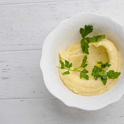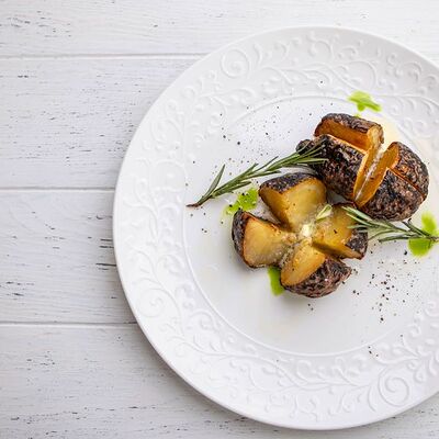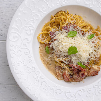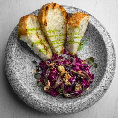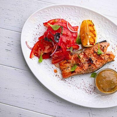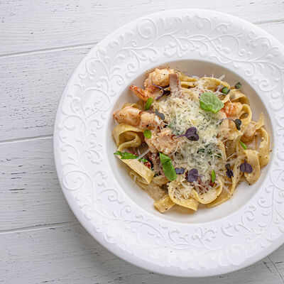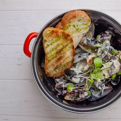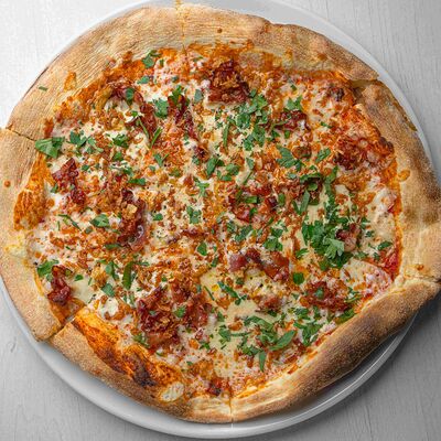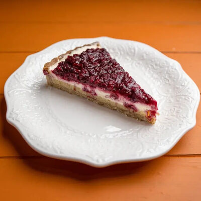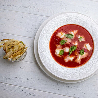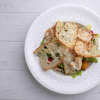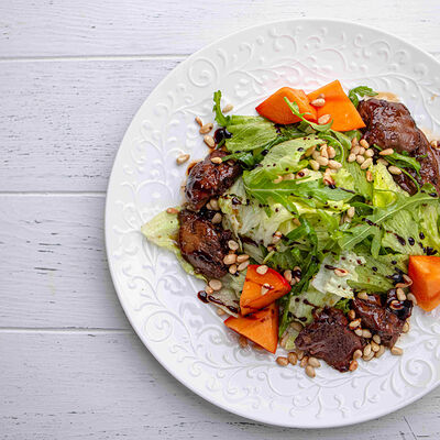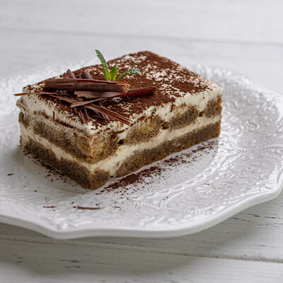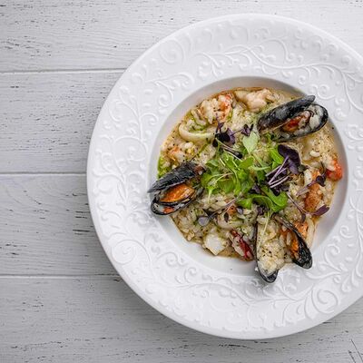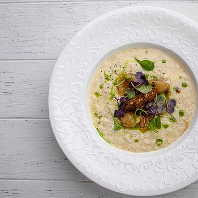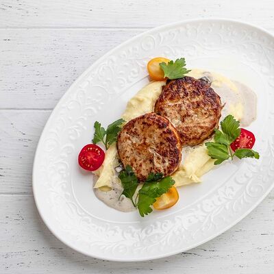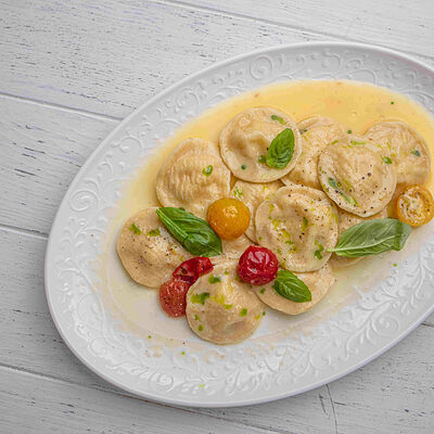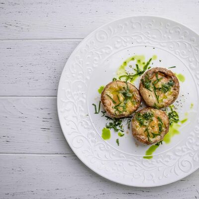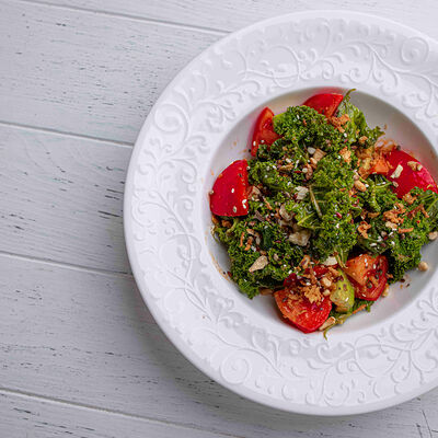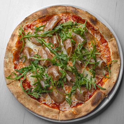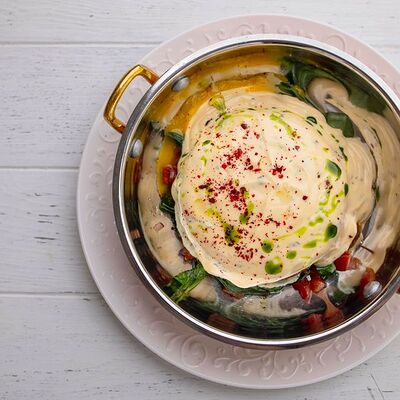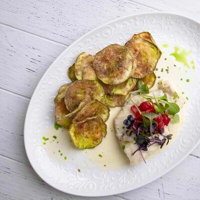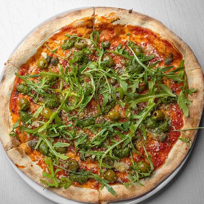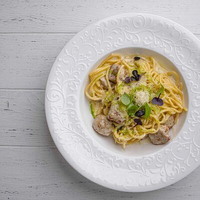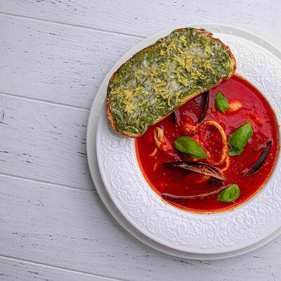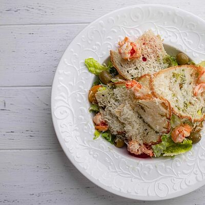 Тартар из говяжьей вырезки с каперсами, вялеными томатами, заправленный оливковым маслом, перед подачей дополняем желтком перепелиного яйца, зеленым маслом и микро зеленью подаем с коннолли с начинкой из мусса из пармезана (сливки, пармезан)