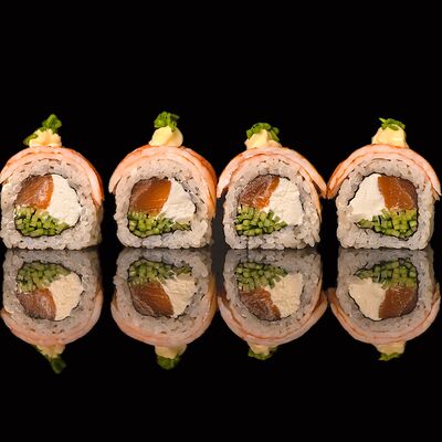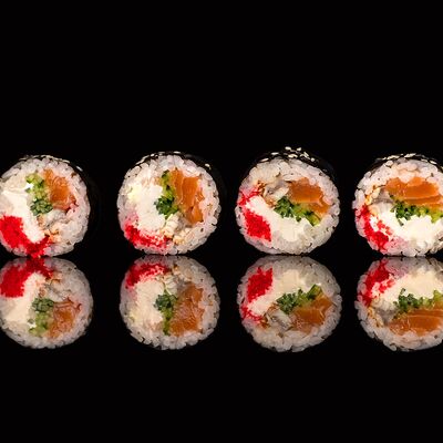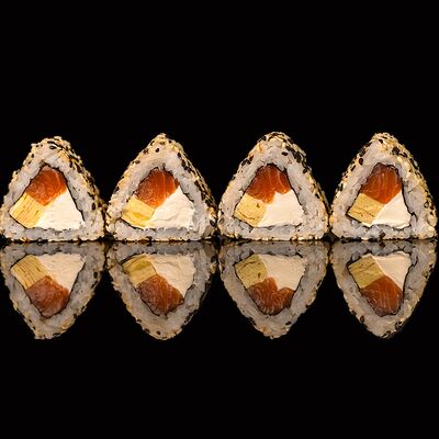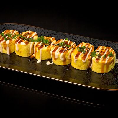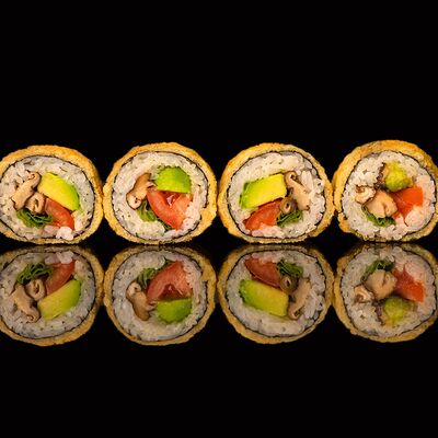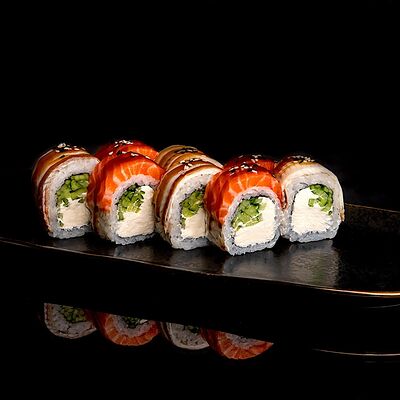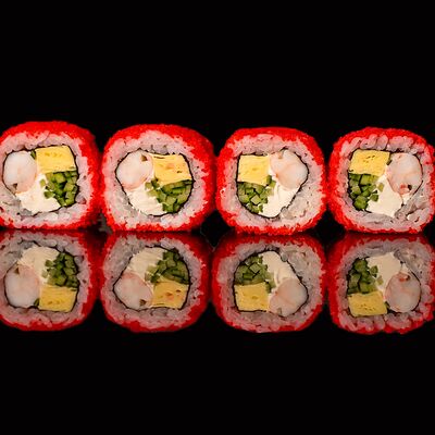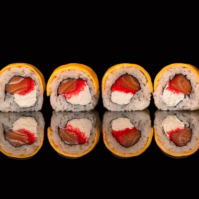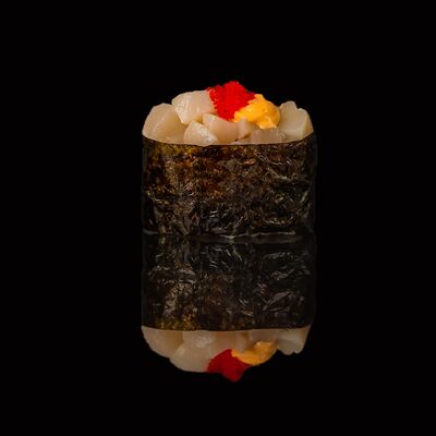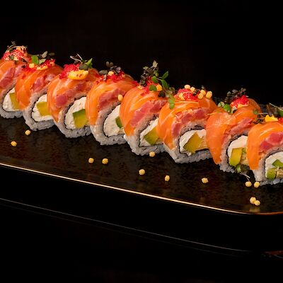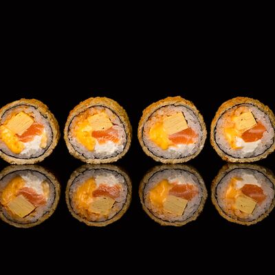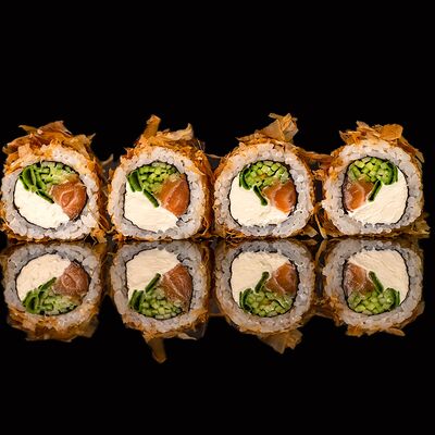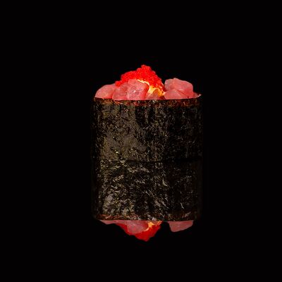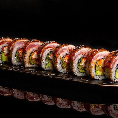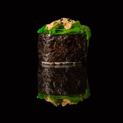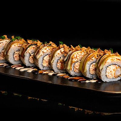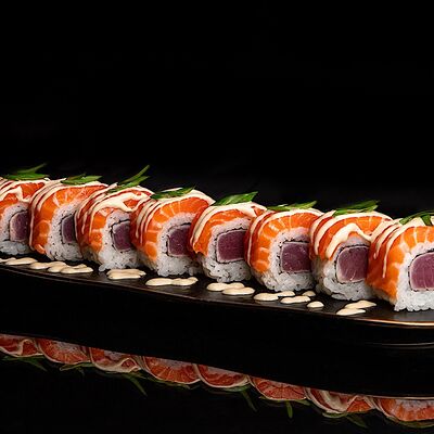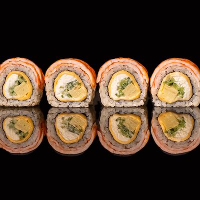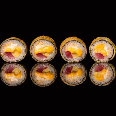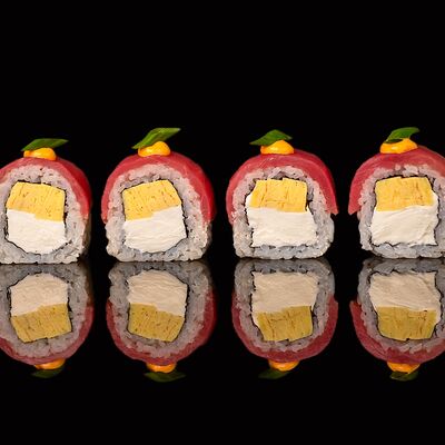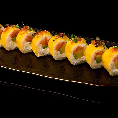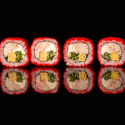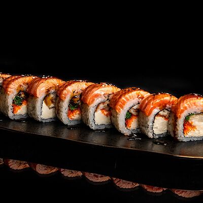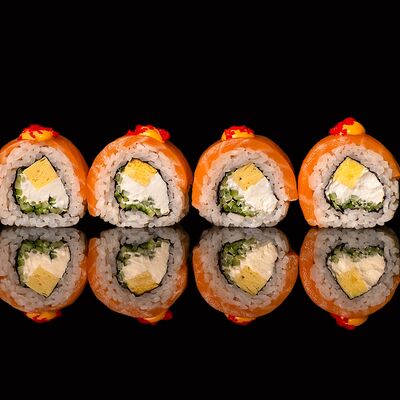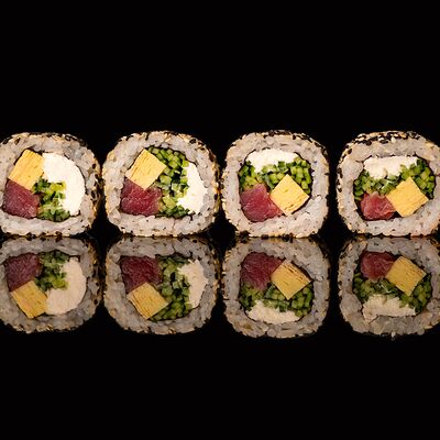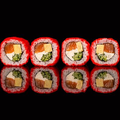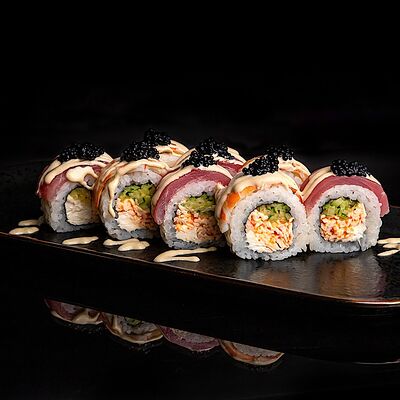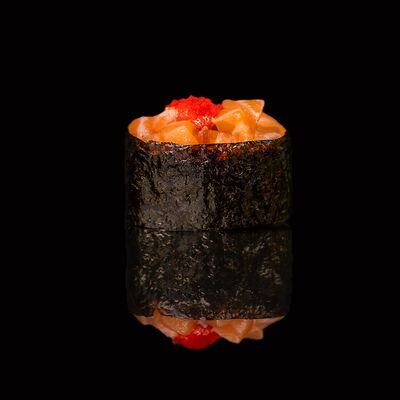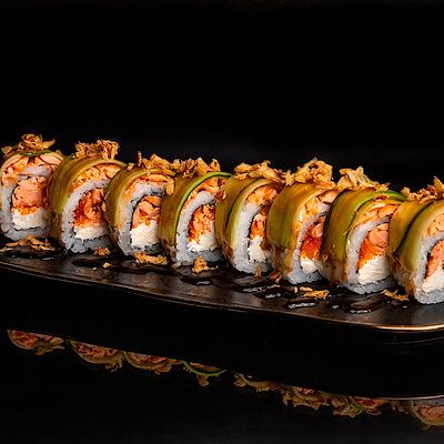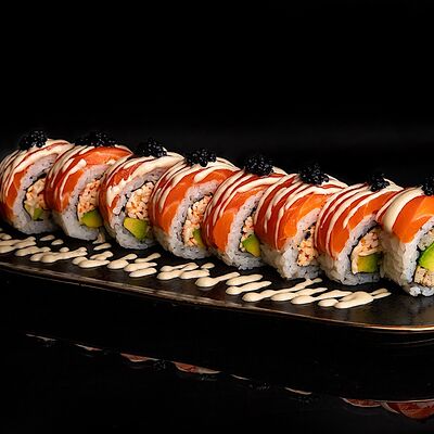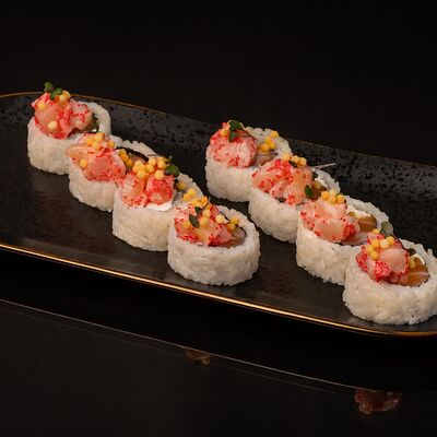 Охлаждённый лосось, тартар (тунец с кимчи), крем-чиз, икра масаго, авокадо, тамаго, соус спайси, рисовые шарики, рис, нори (8 шт.)