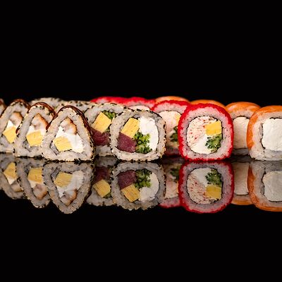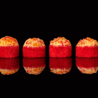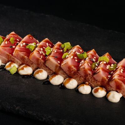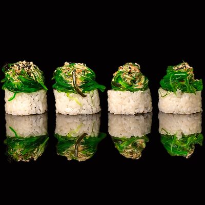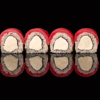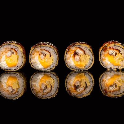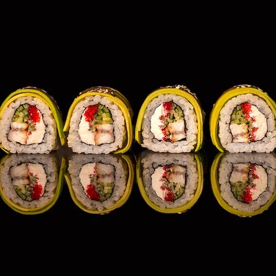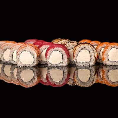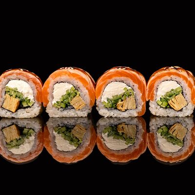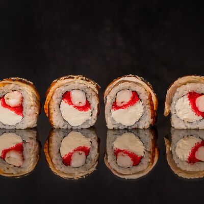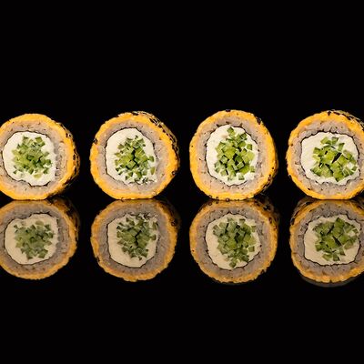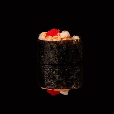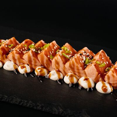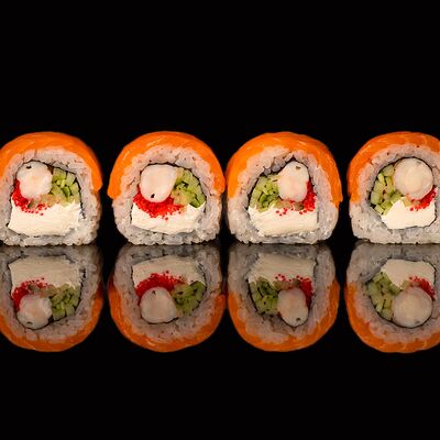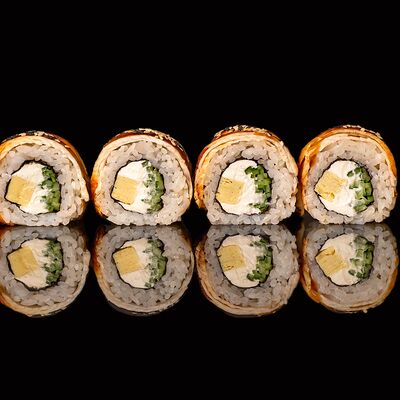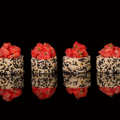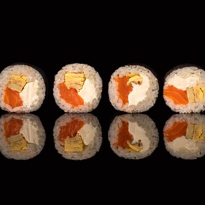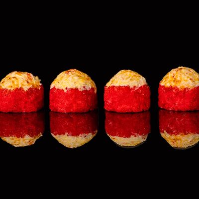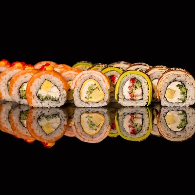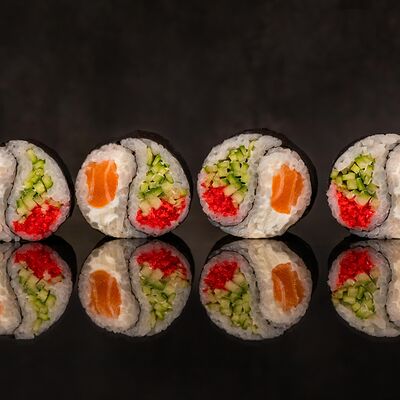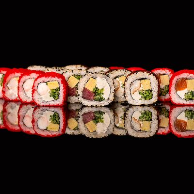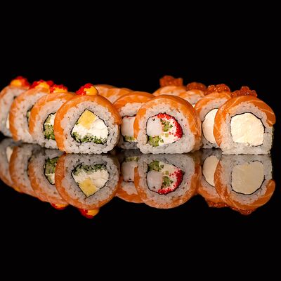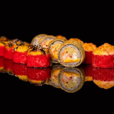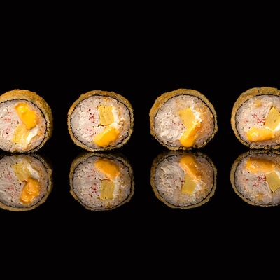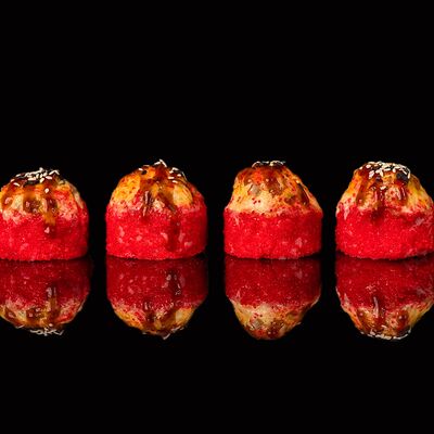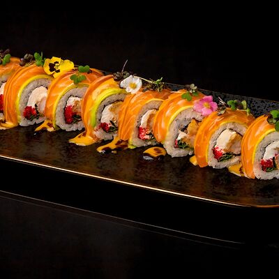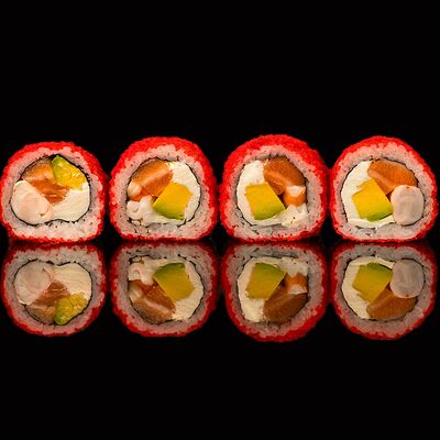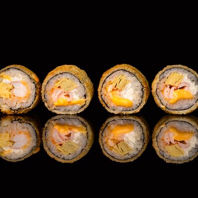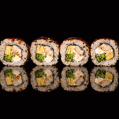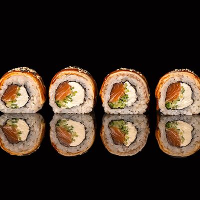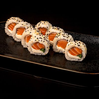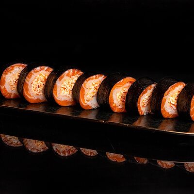 Охлаждённый лосось, тартар (тунец с кимчи), крем-чиз, икра масаго, авокадо, тамаго, соус спайси, рисовые шарики, рис, нори (8 шт.)