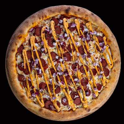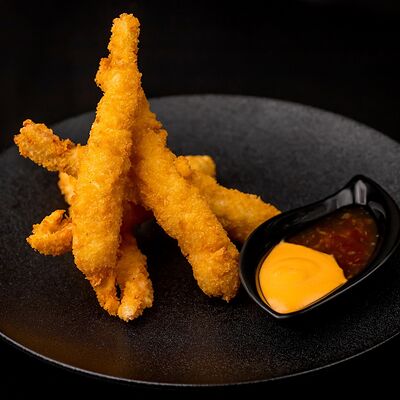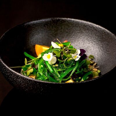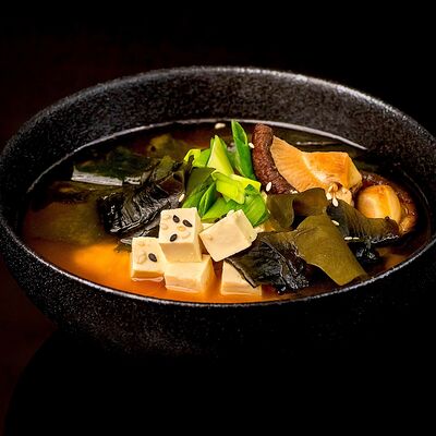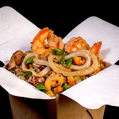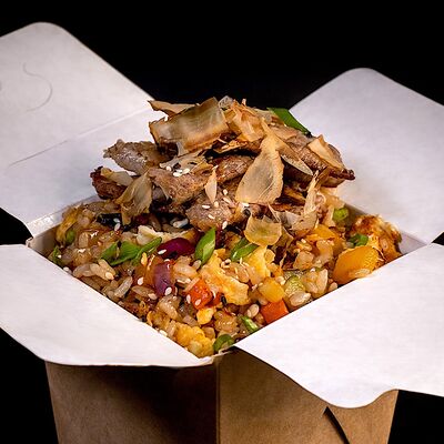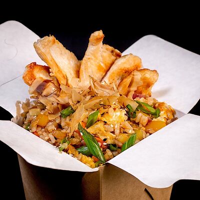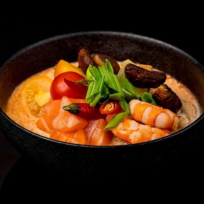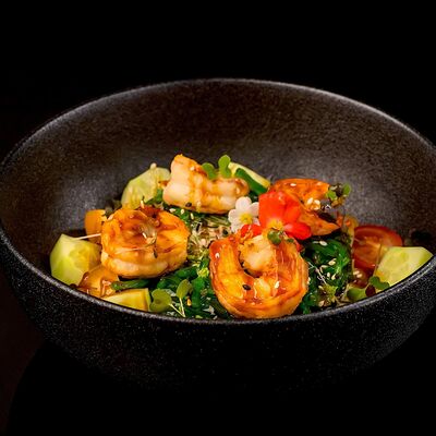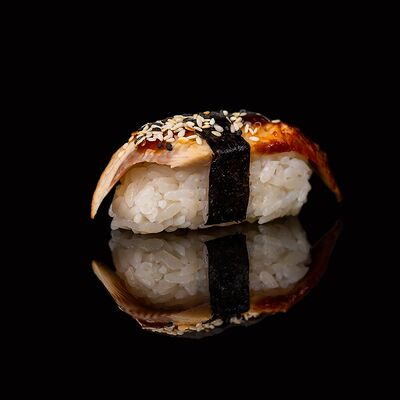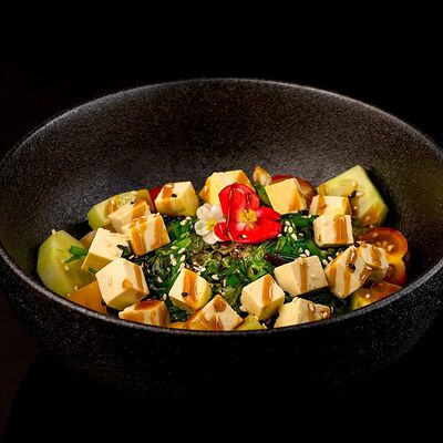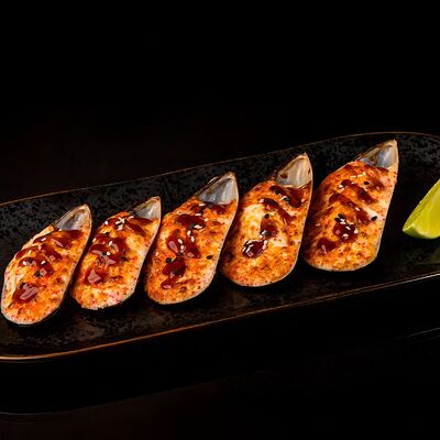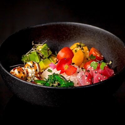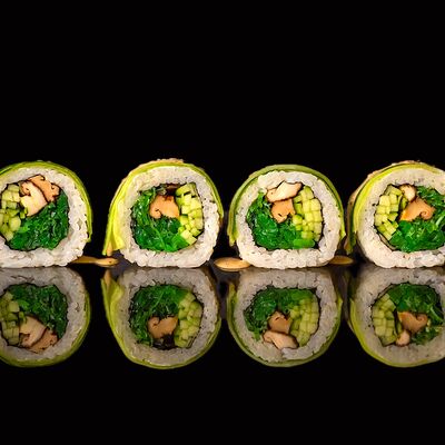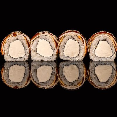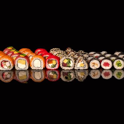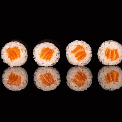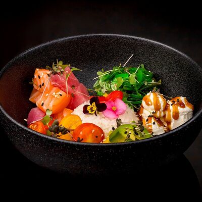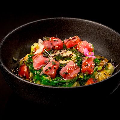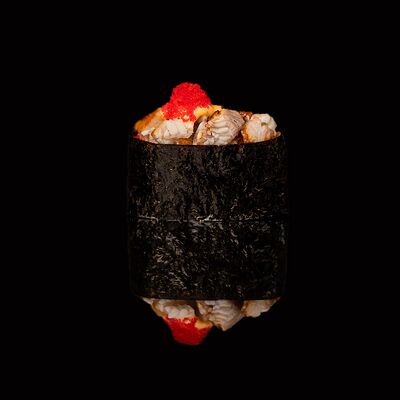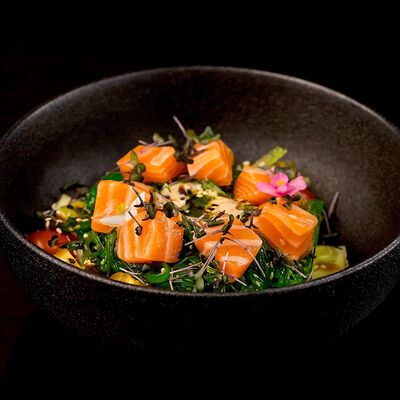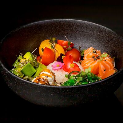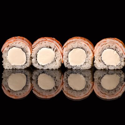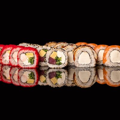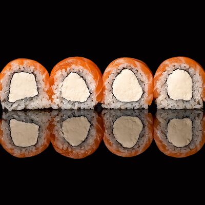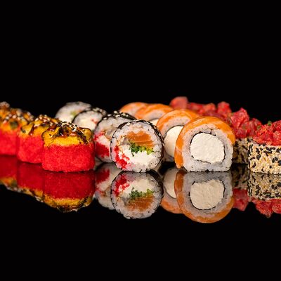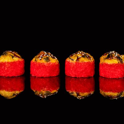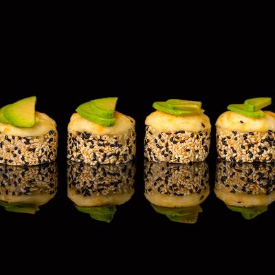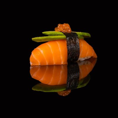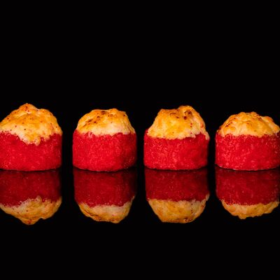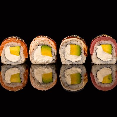 Охлаждённый лосось, тартар (тунец с кимчи), крем-чиз, икра масаго, авокадо, тамаго, соус спайси, рисовые шарики, рис, нори (8 шт.)