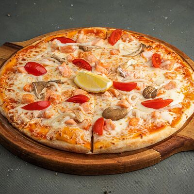 Лосось, креветки, кальмар, грибы, соус том ям, сыр моцарелла, зелень, лимон (30 см)