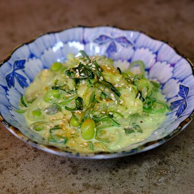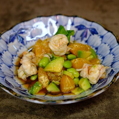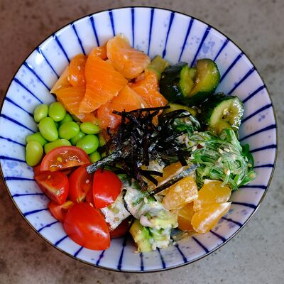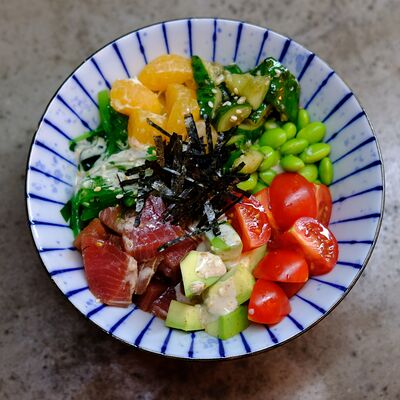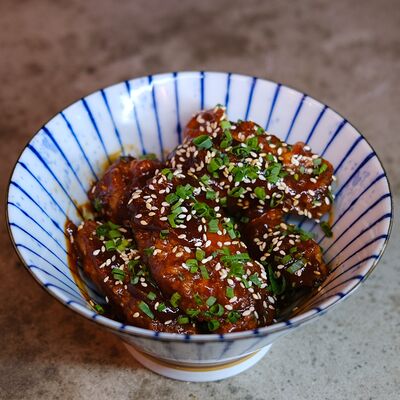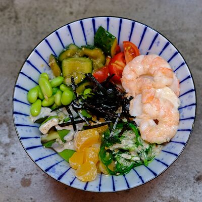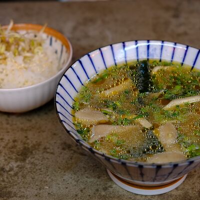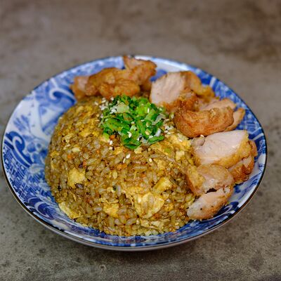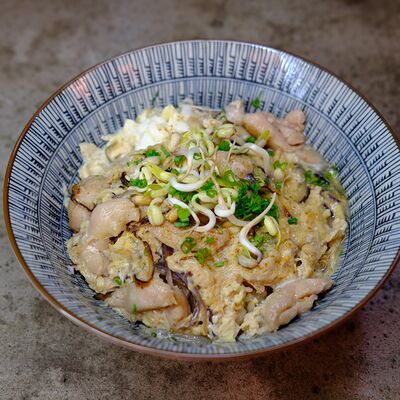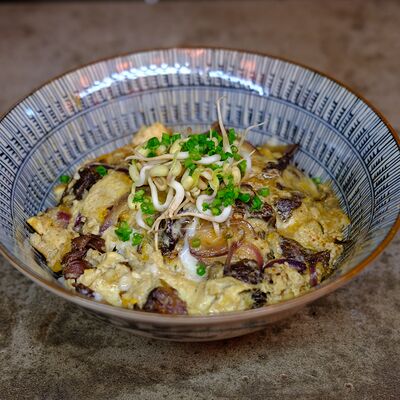 Яйцо, лук (красный и зеленый), японский соус даси, рис, морковь, ростки бобов. Чаша с рисом, укрытая омлетом с томленой говядиной
