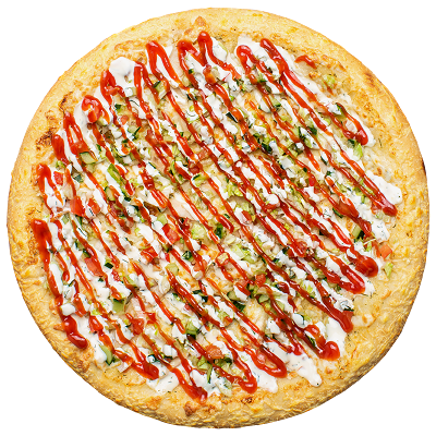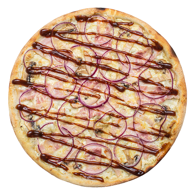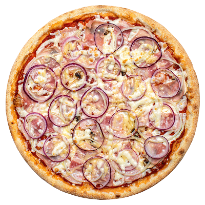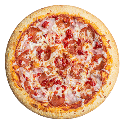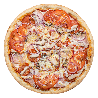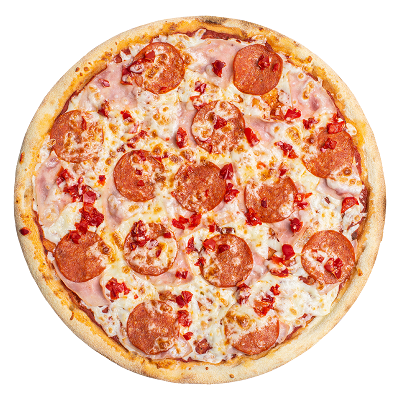 Пепперони, ветчина, шампиньоны, перец болгарский, пармезан, лук красный, халапеньо, пицца-соус
