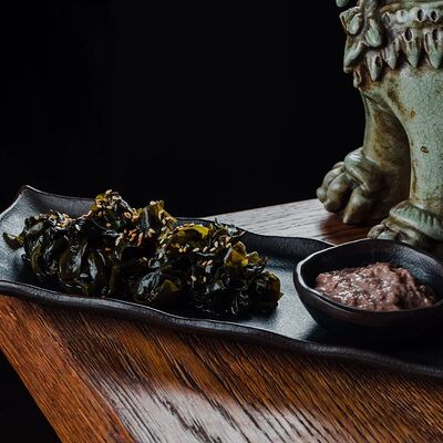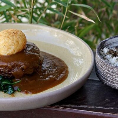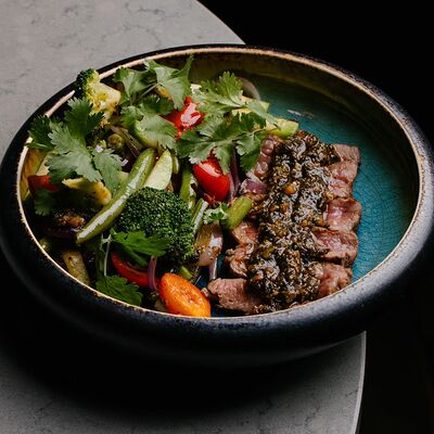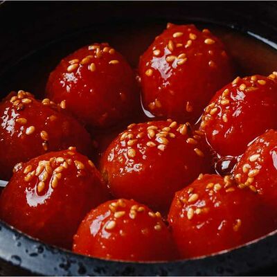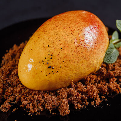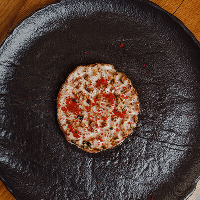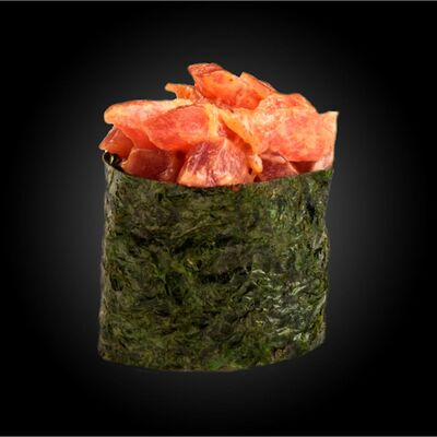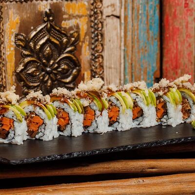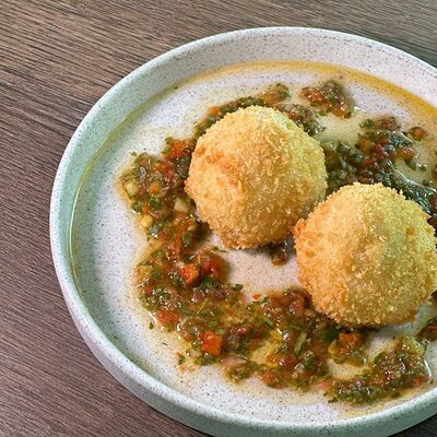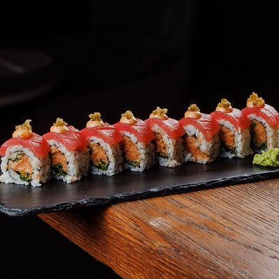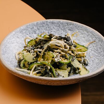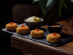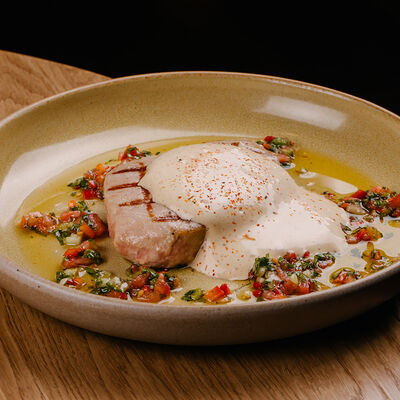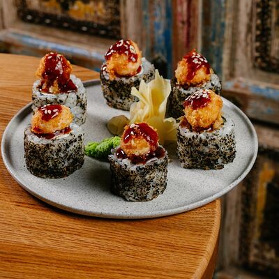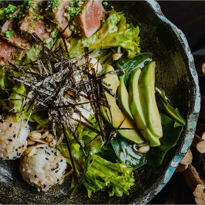 Рисовые шарики в кунжуте, филе тунца прожарки rare, спелый авокадо, проростки сои и пашот в кисло -сладкой заправке