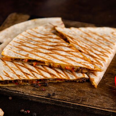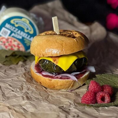 Мраморная говядина, лук красный, помидор розовый, сырный соус, хлеб собственного приготовления