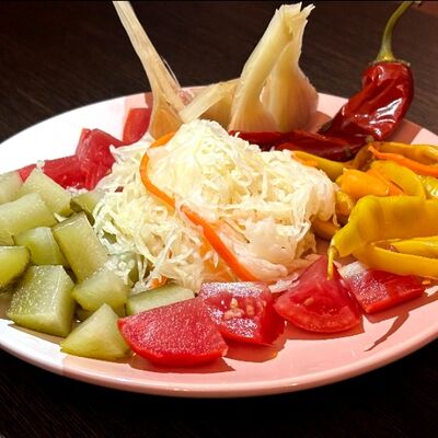 Огурцы бочковые, помидоры соленые, капуста квашеная, турша, перец острый соленый, чеснок солёный