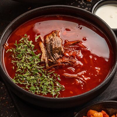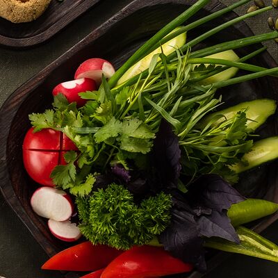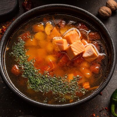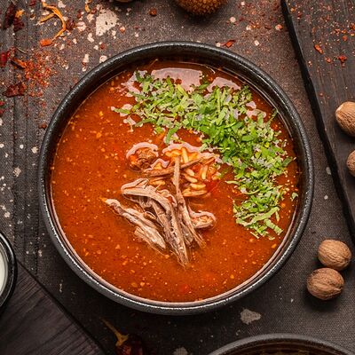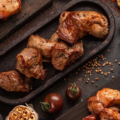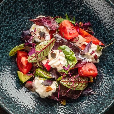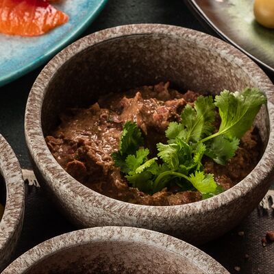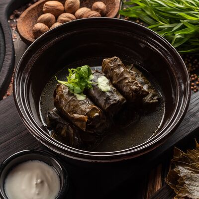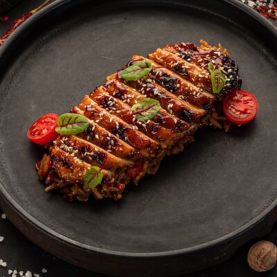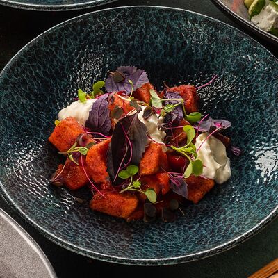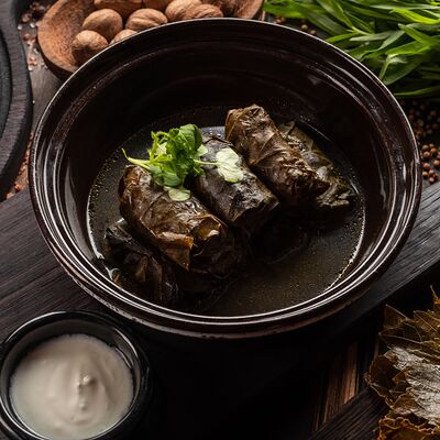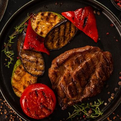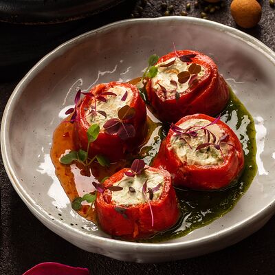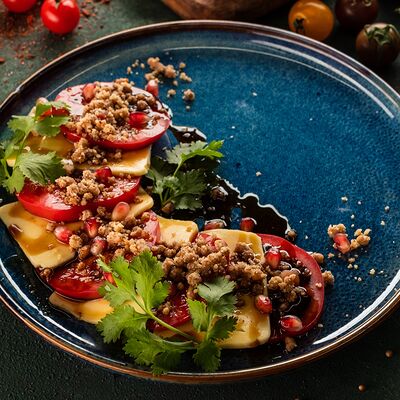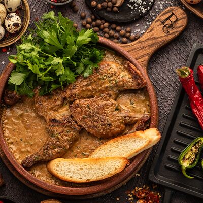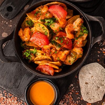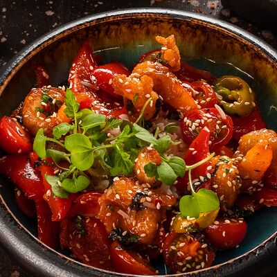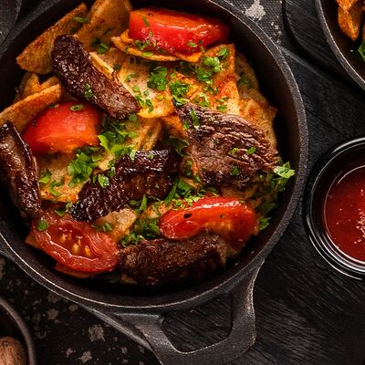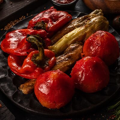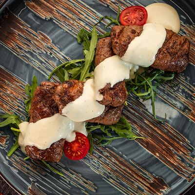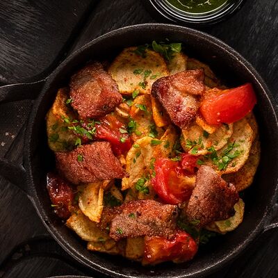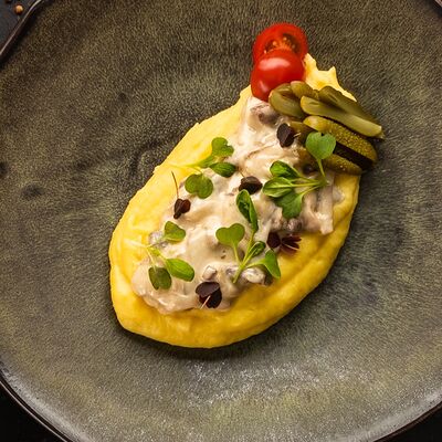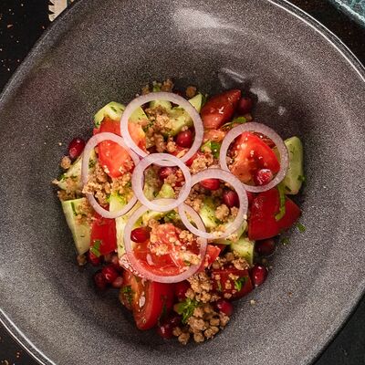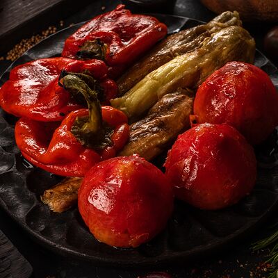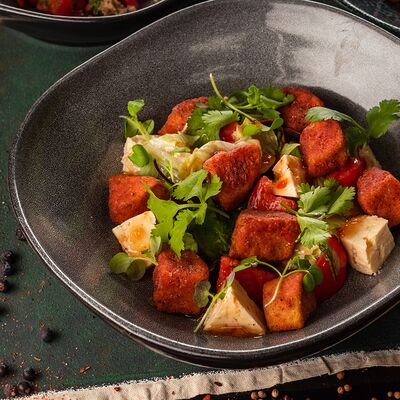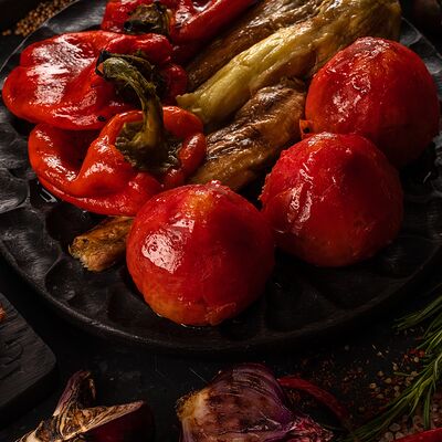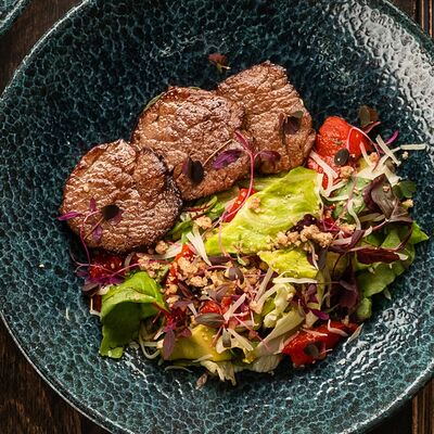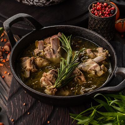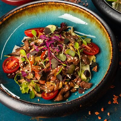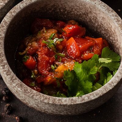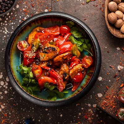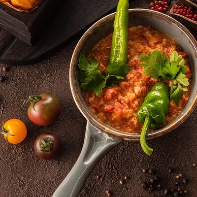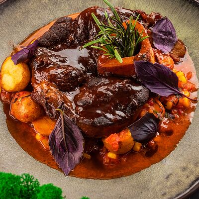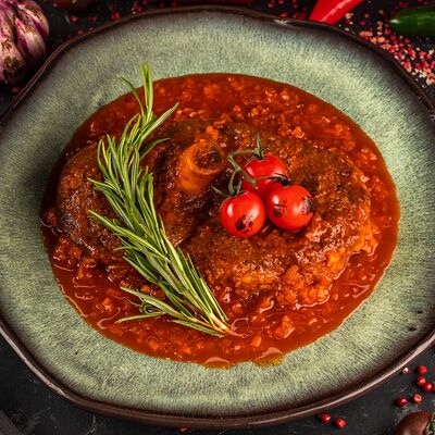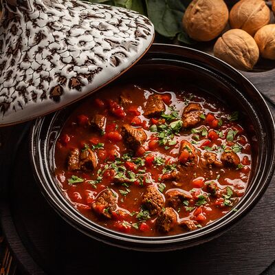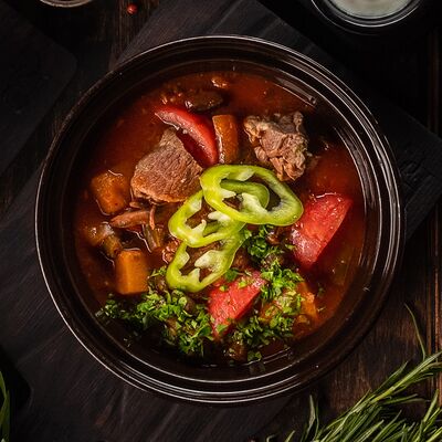 Мякоть говядины, томленная в томатах с болгарским перцем и специями, зелень