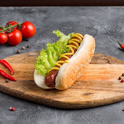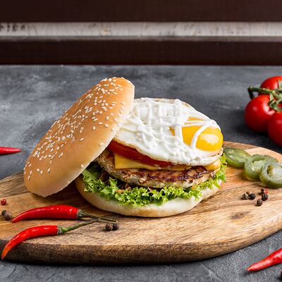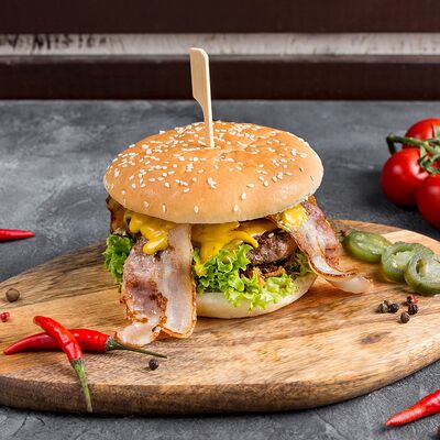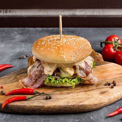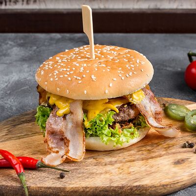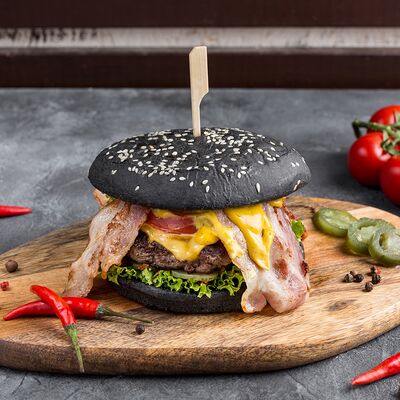 Черная булочка с кунжутом, говяжья котлета, сыр чеддер, помидор, бекон, лист свежего салата, маринованные огурчики, жареный лук, соус гриль, соус чесночный