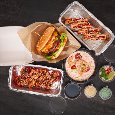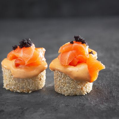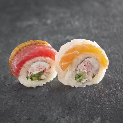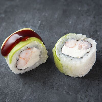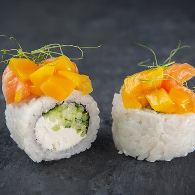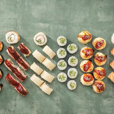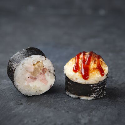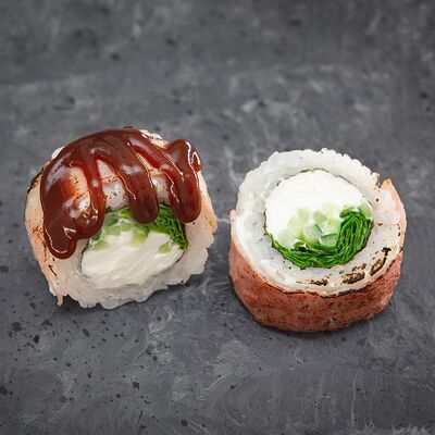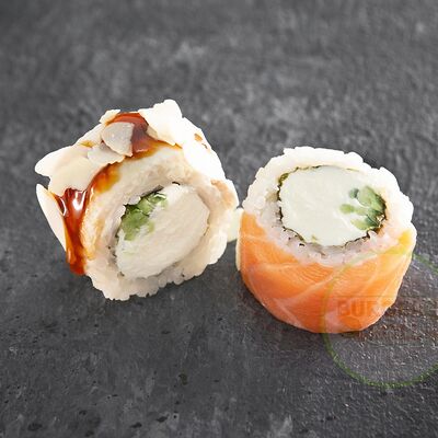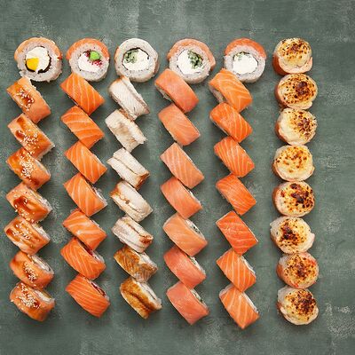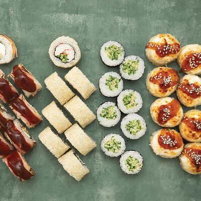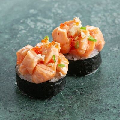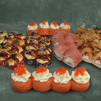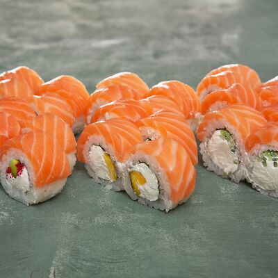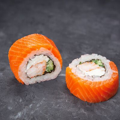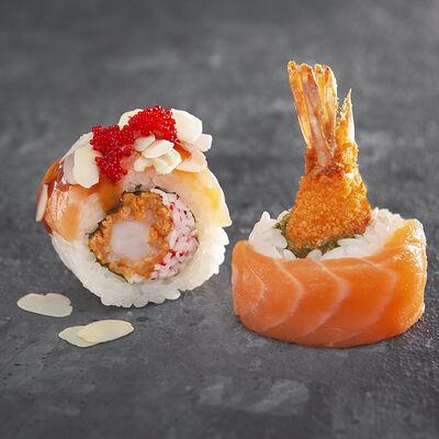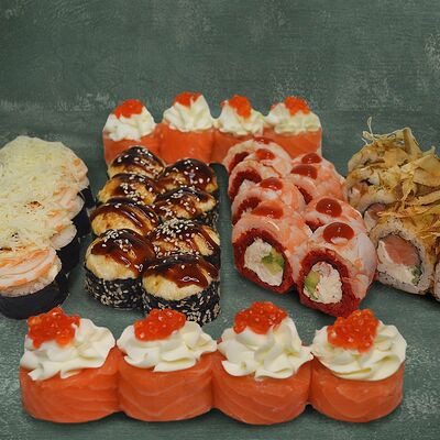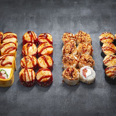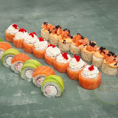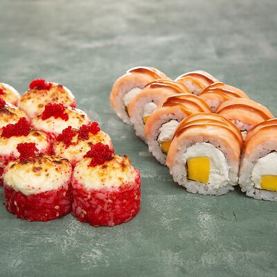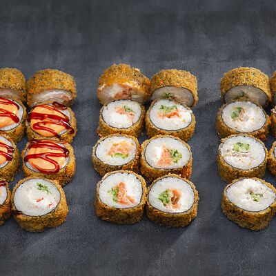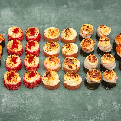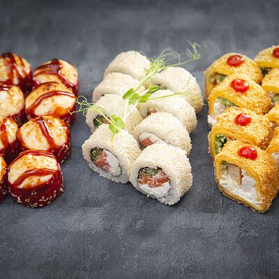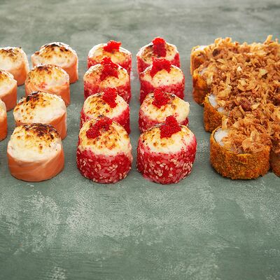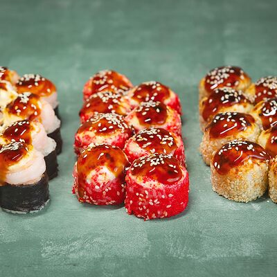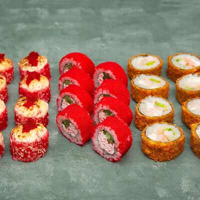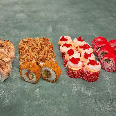Острый ролл с креветкой, Калифорния, Обожженный лосось, Темпура с жареным лососем