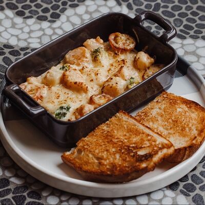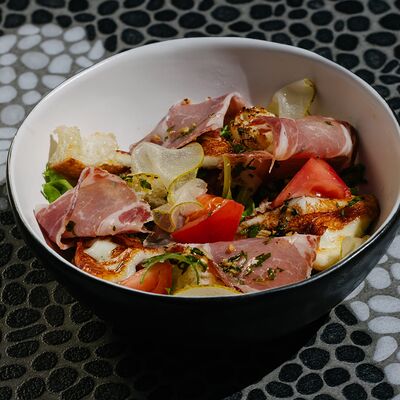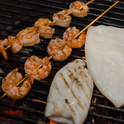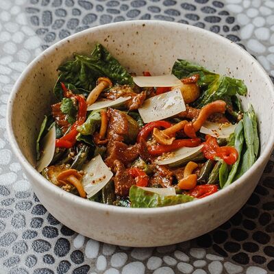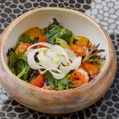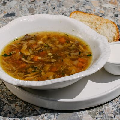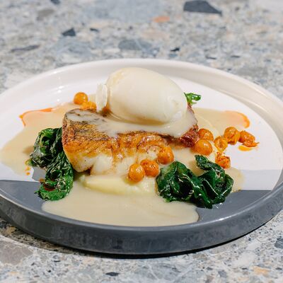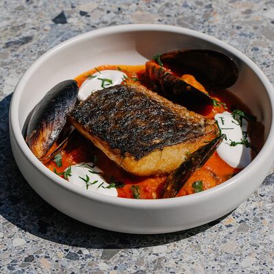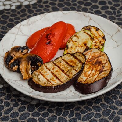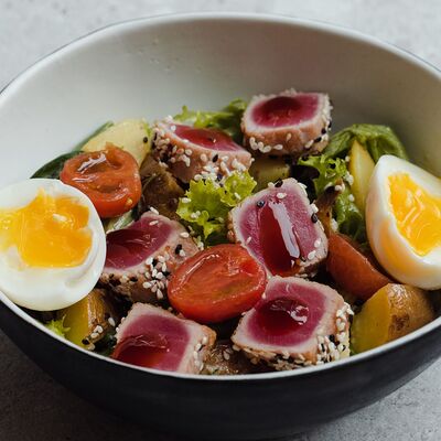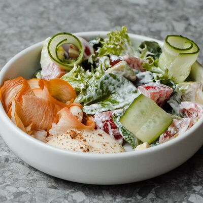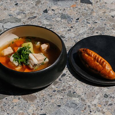 Лосось и судак отварные с овощами и зеленью. Подаем к супу пирожок с лососем
