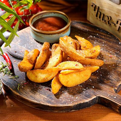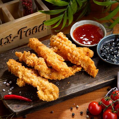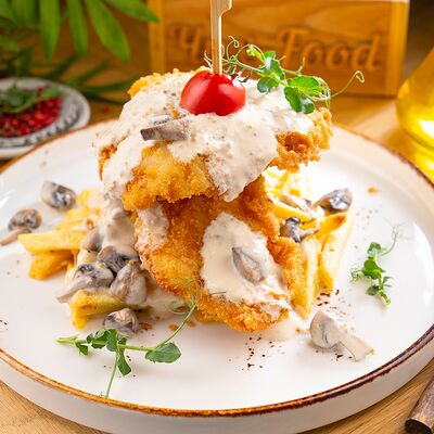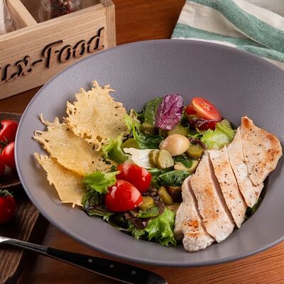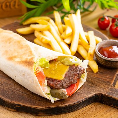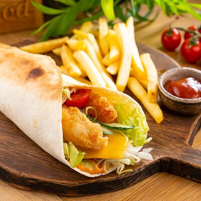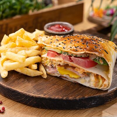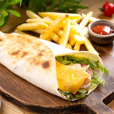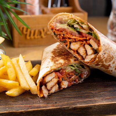 Курица по-кавказски, салат айсберг, красный соус, соус pink, помидор, огурец, морковь по-корейски, картофель фри, соус бланко