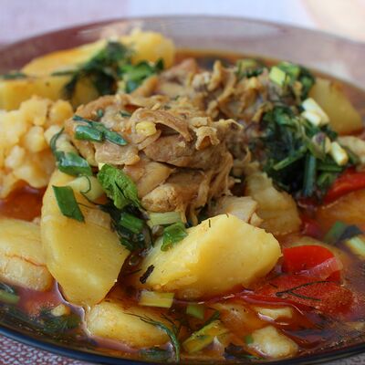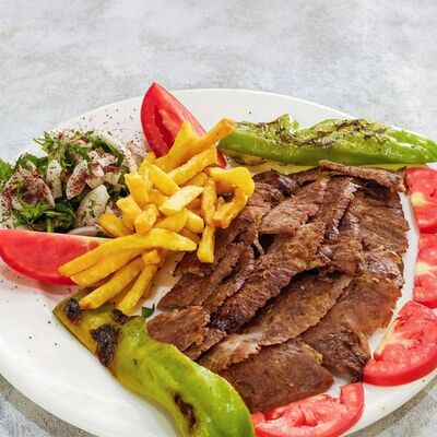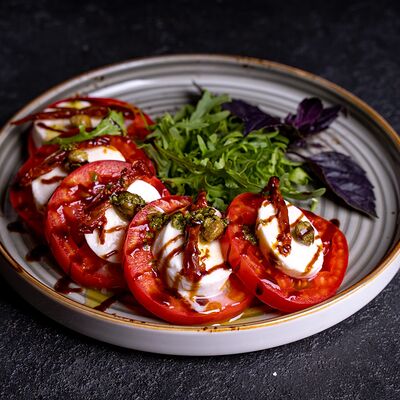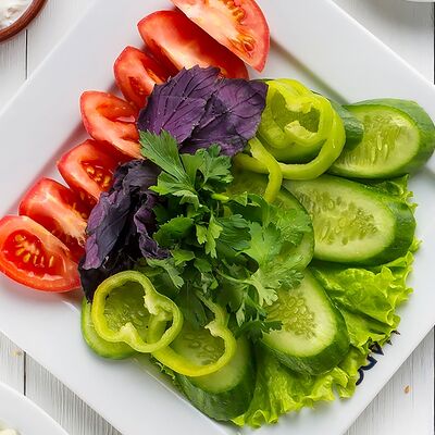Помидор, зелень, лук, огурец, сладкий перец, сыр фета, оливки и оливковое масло