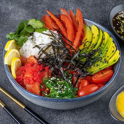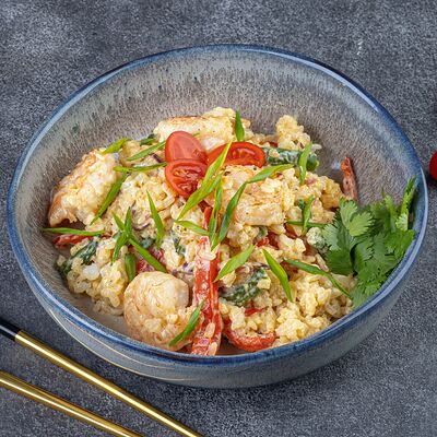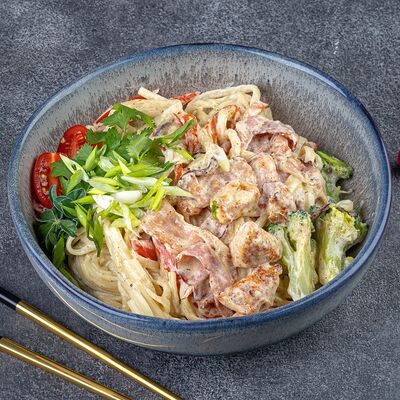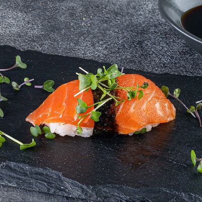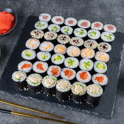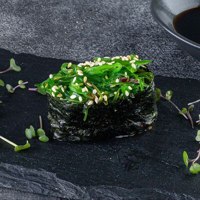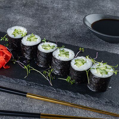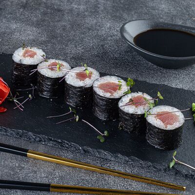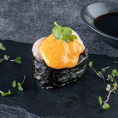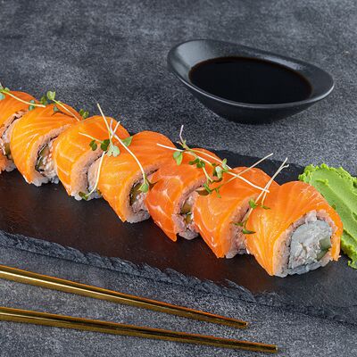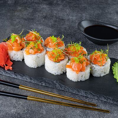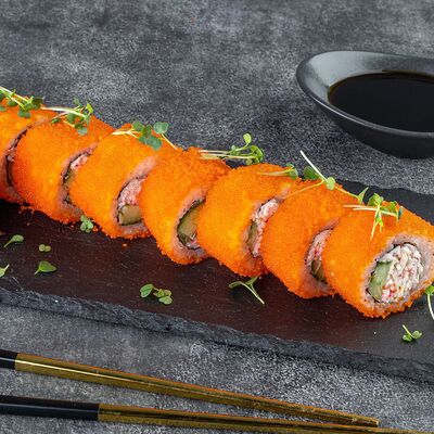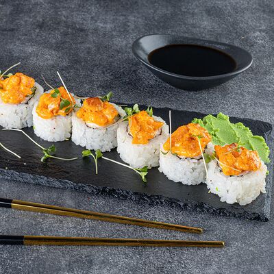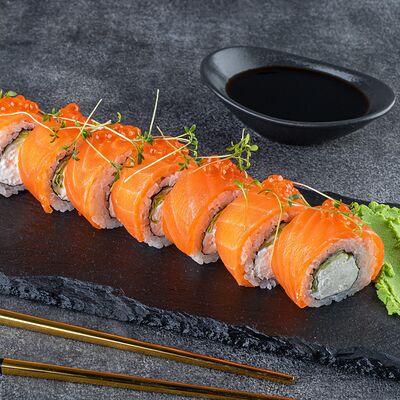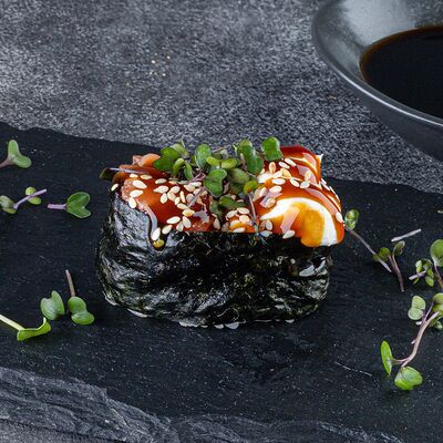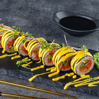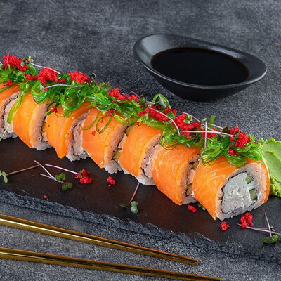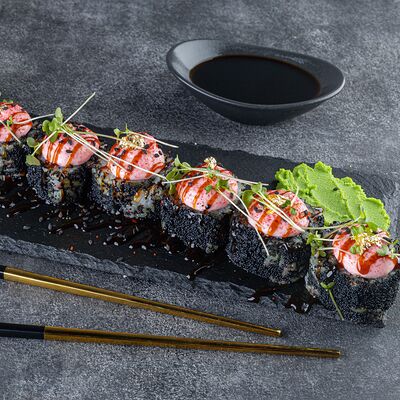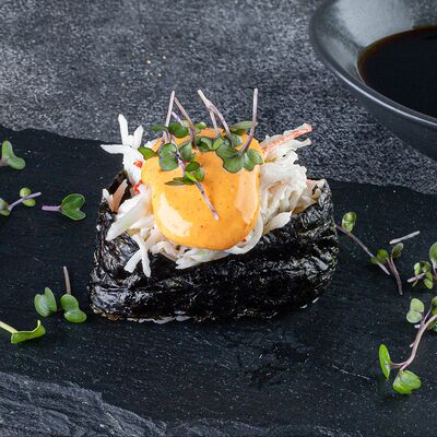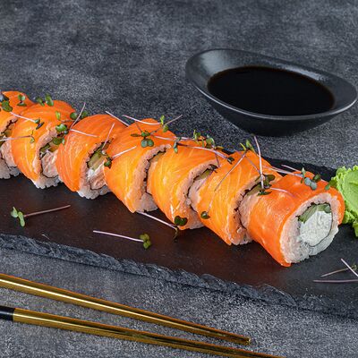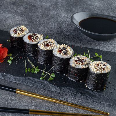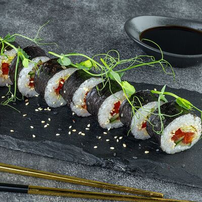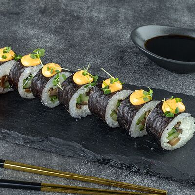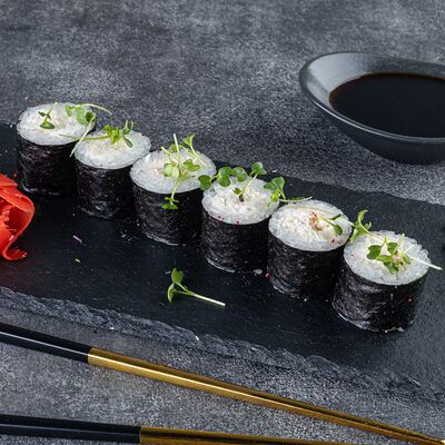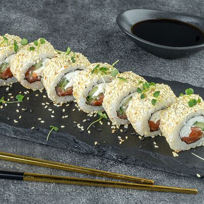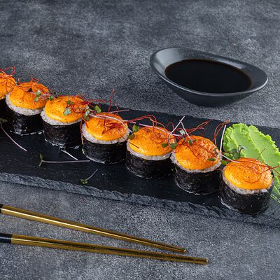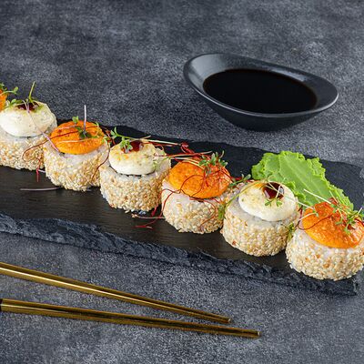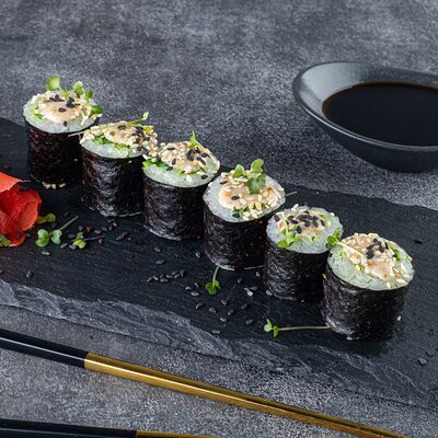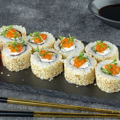 Нори, рис, сыр сливочный креметте, салат, курица жареная, соус цезарь, кунжут (8 шт.)