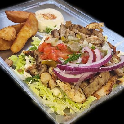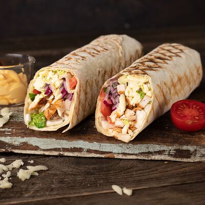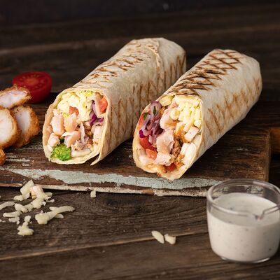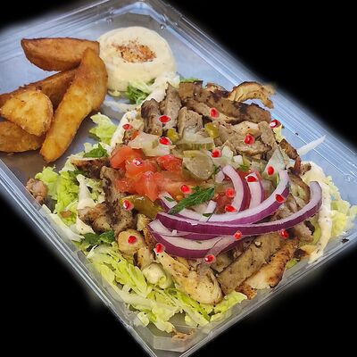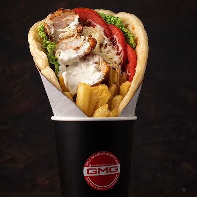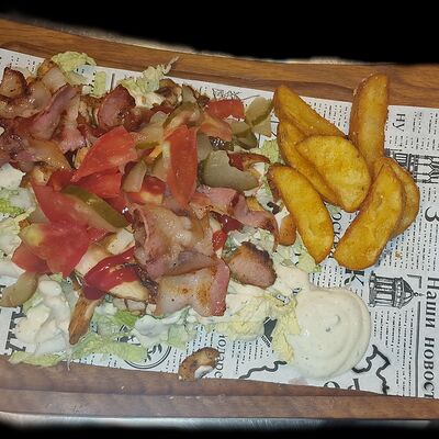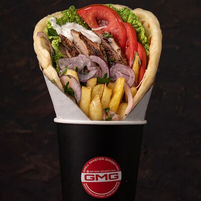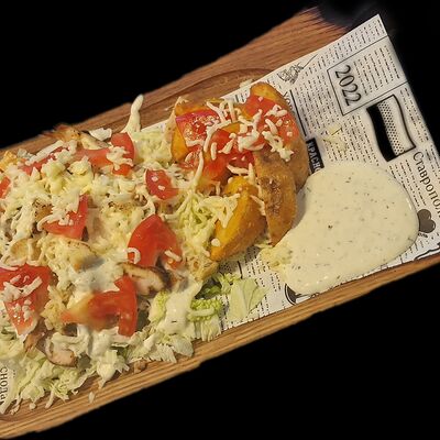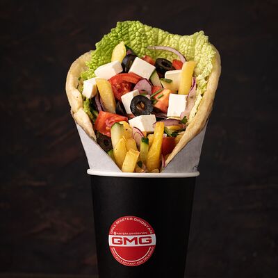 Котлета говяжья, лук с зеленью, соленые огурцы, помидор, сыр чеддер, пекинская капуста, соус гриль, красный соус, соус дзадзики