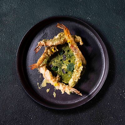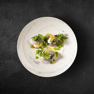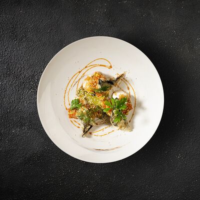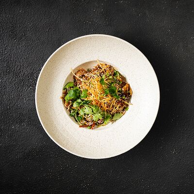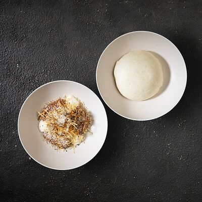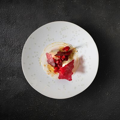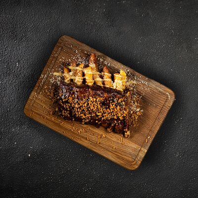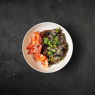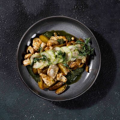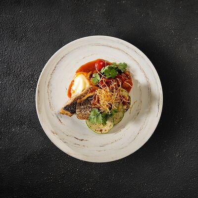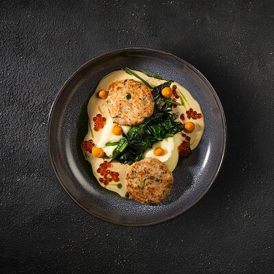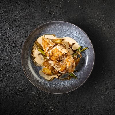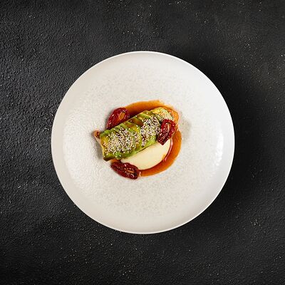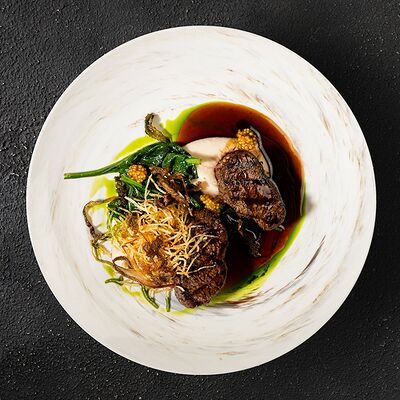 Говяжья вырезка, копченый демиглас, пюре из фасоли (фасоль, лук, морковь, чеснок, масло растительное, соль, перец черный молотый), шпинат, картофель пай