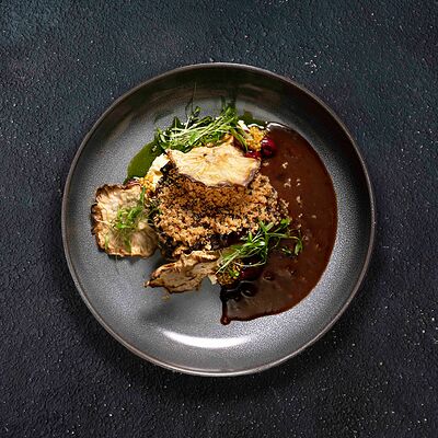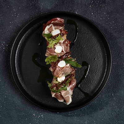 Медальоны из говядины с соусом демиглас и кремом из подкопченной фасоли доставка