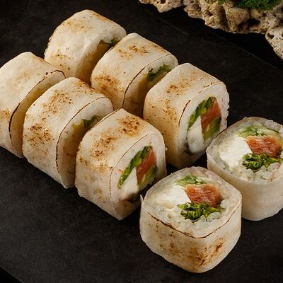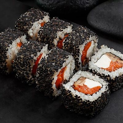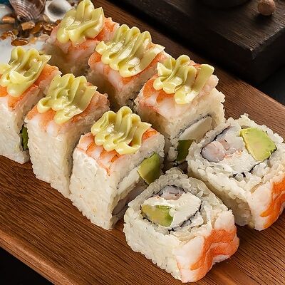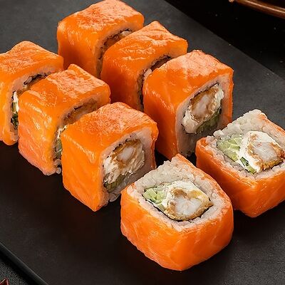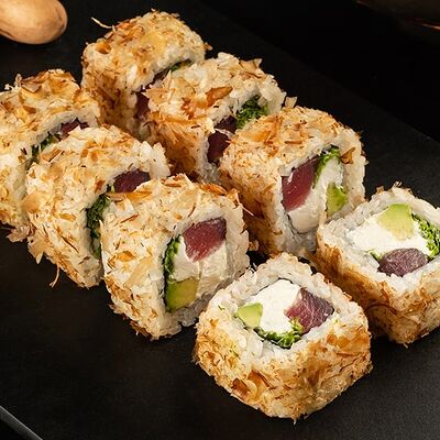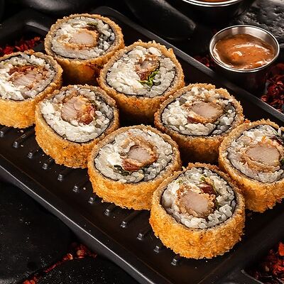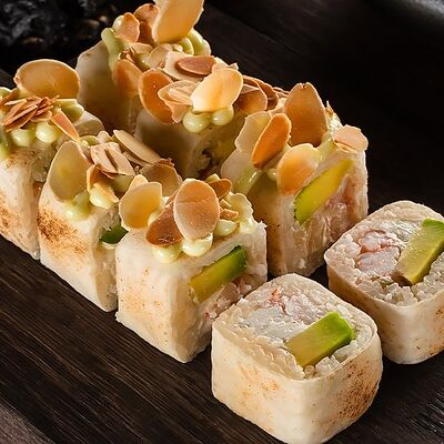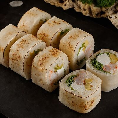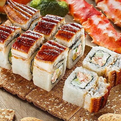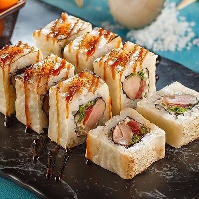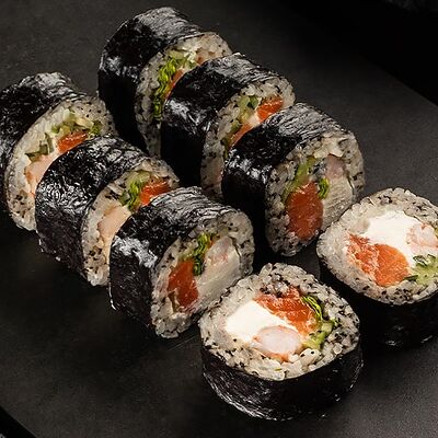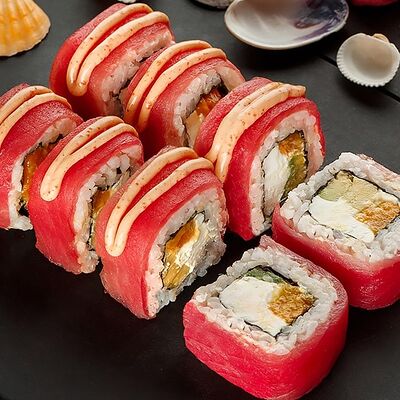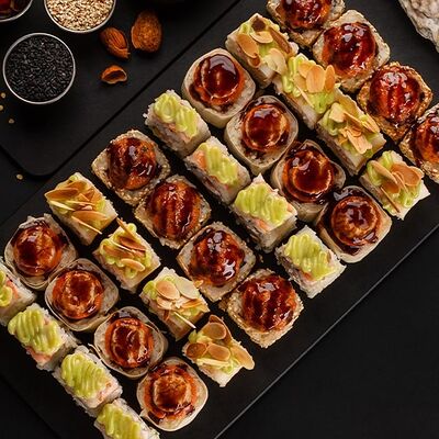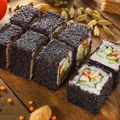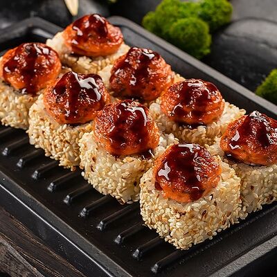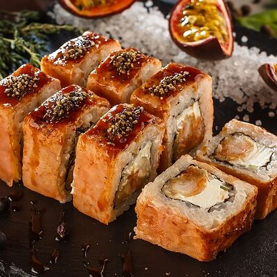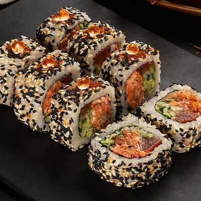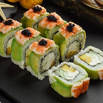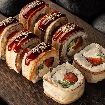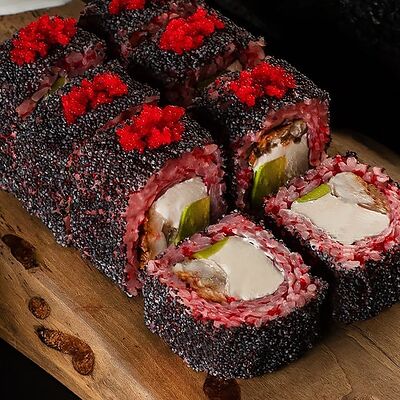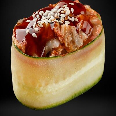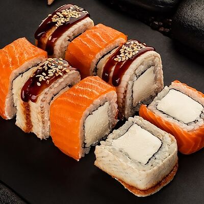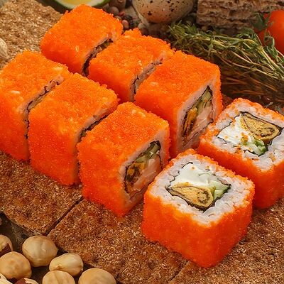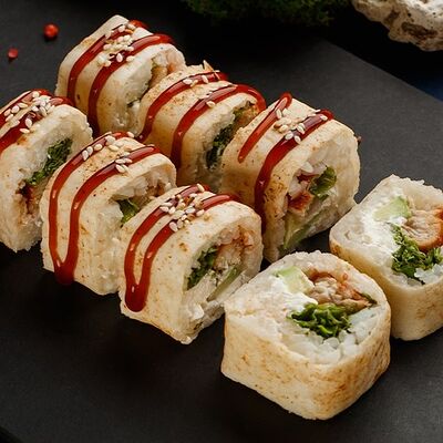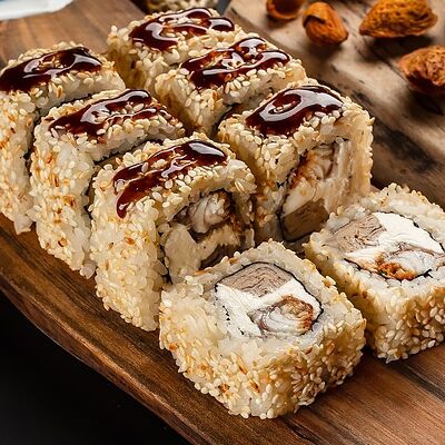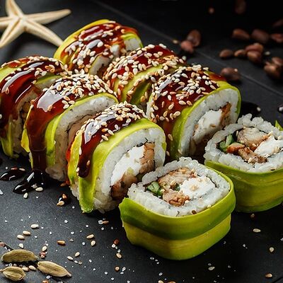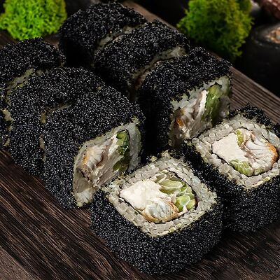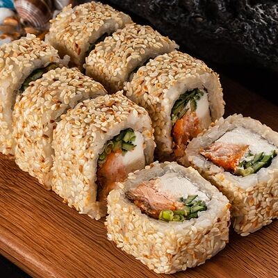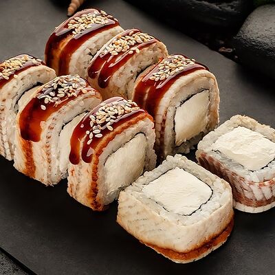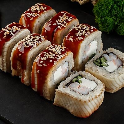 Филе угря, сливочный сыр, авокадо, лист салата, соус унаги, рис, харумаки, кунжут