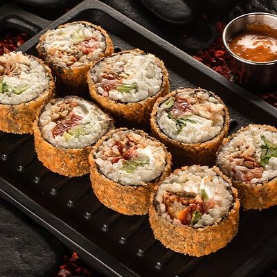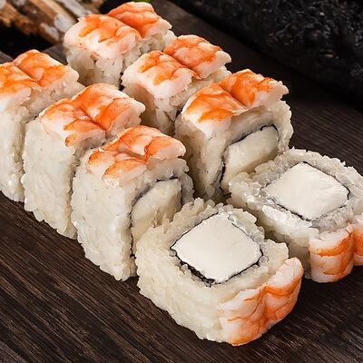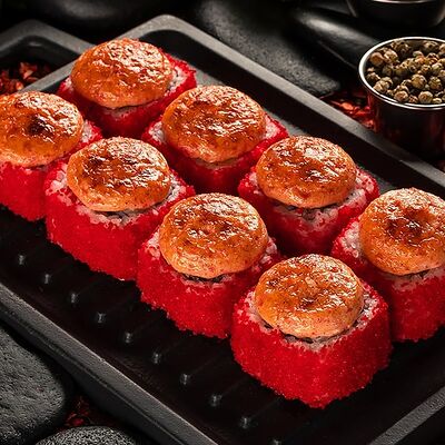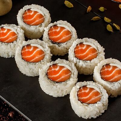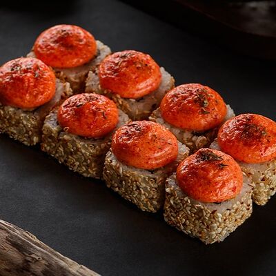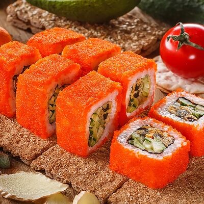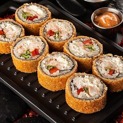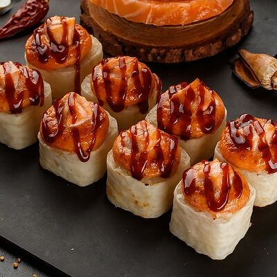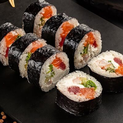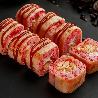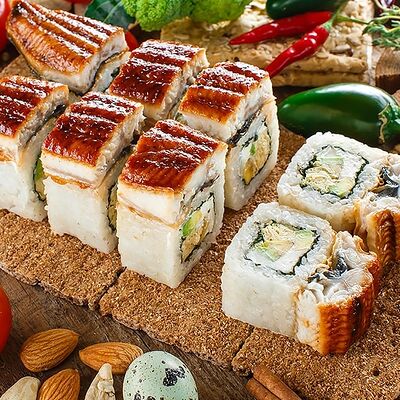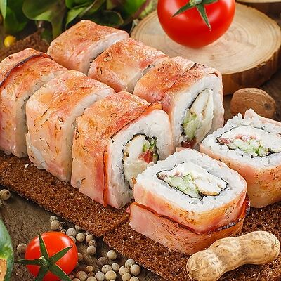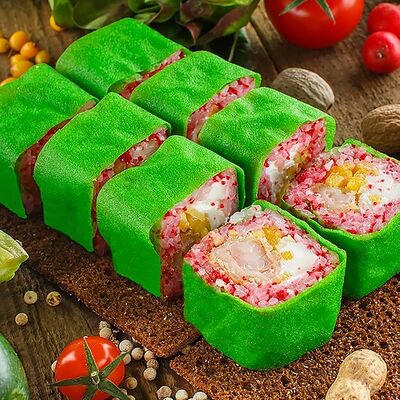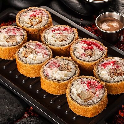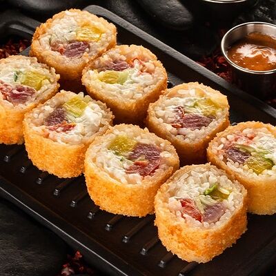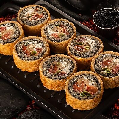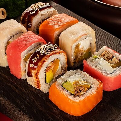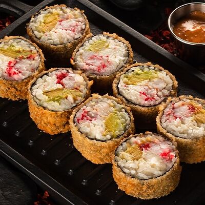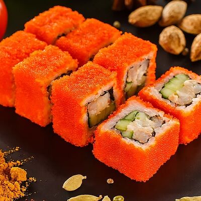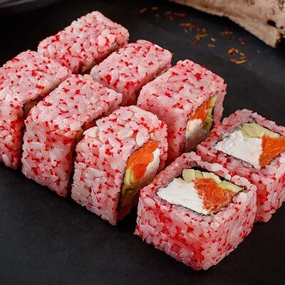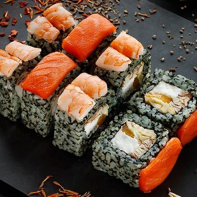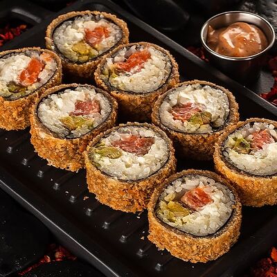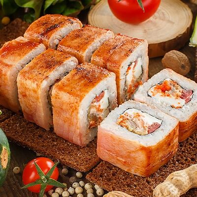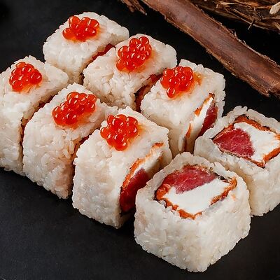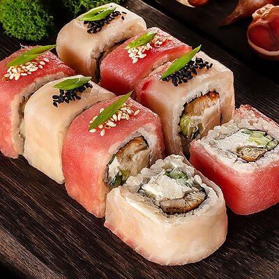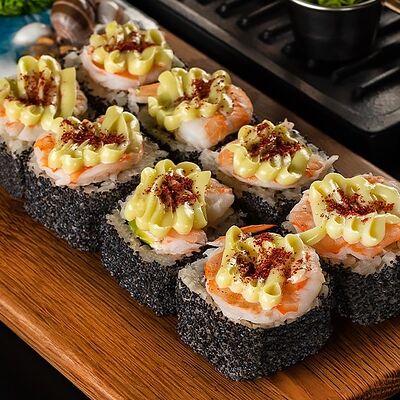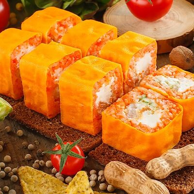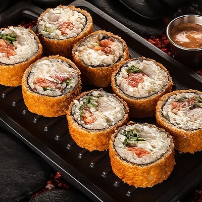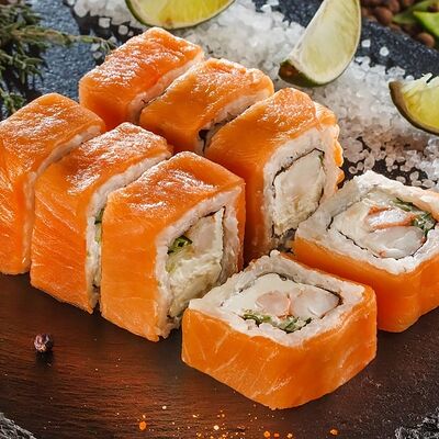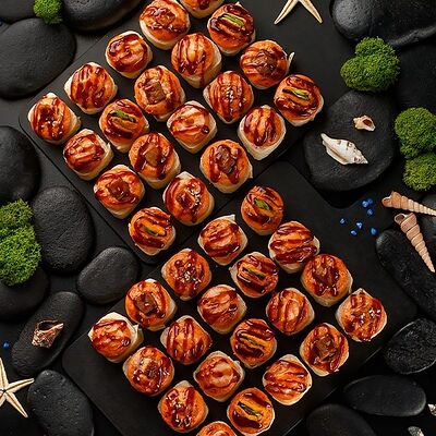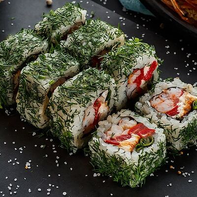 Филе угря, сливочный сыр, авокадо, лист салата, соус унаги, рис, харумаки, кунжут