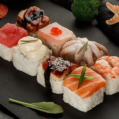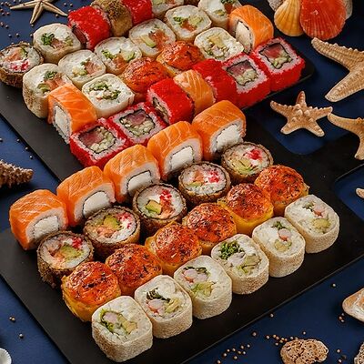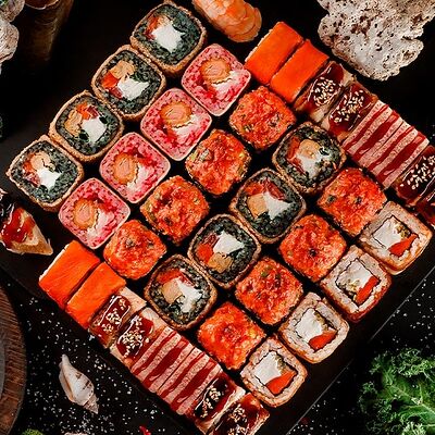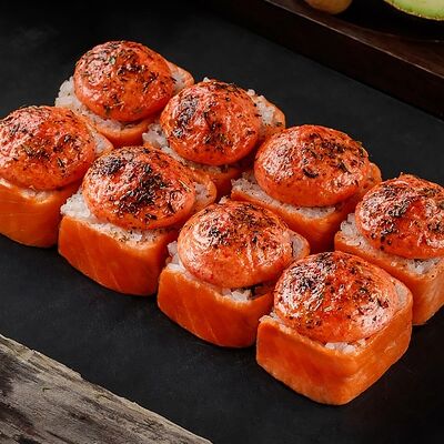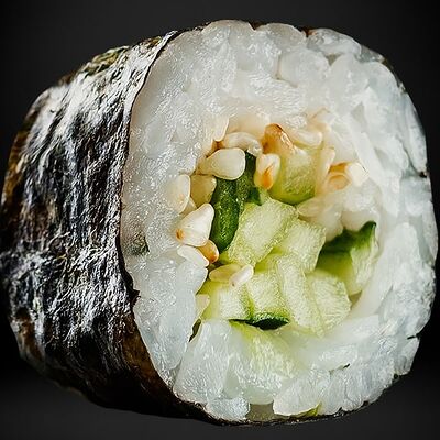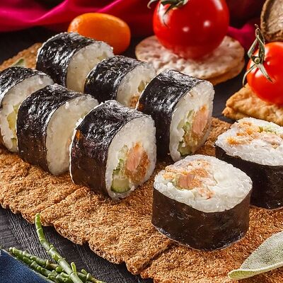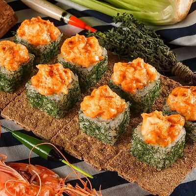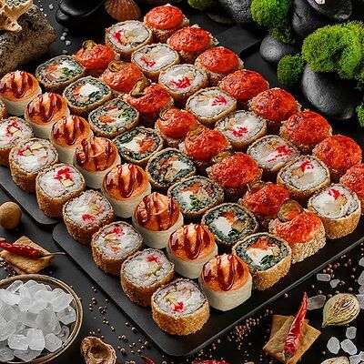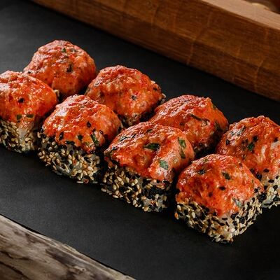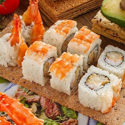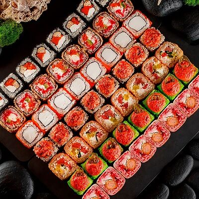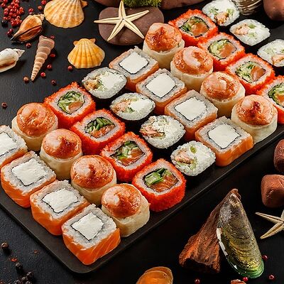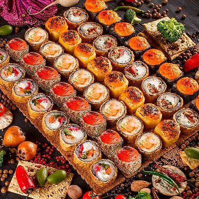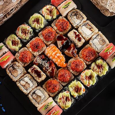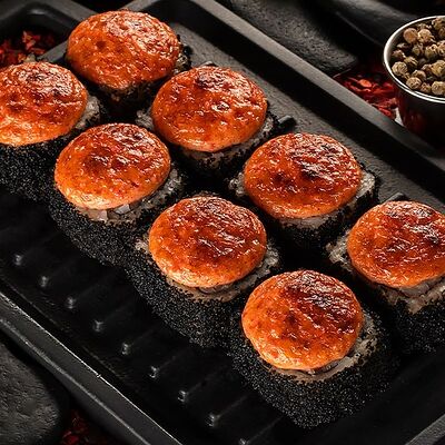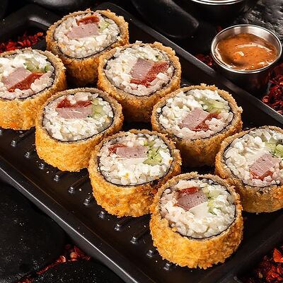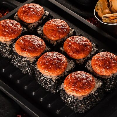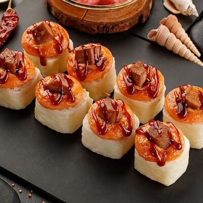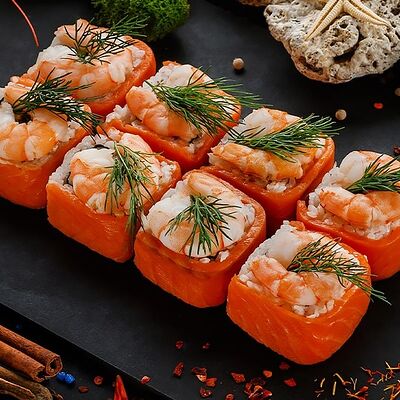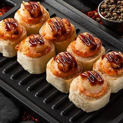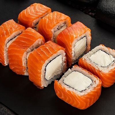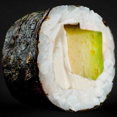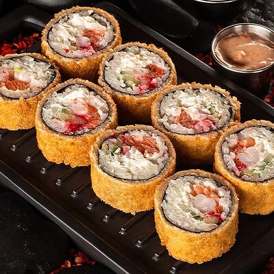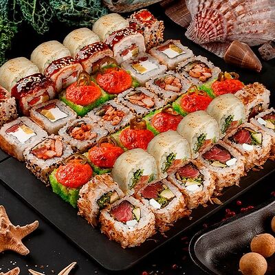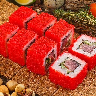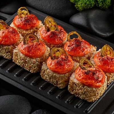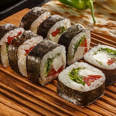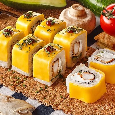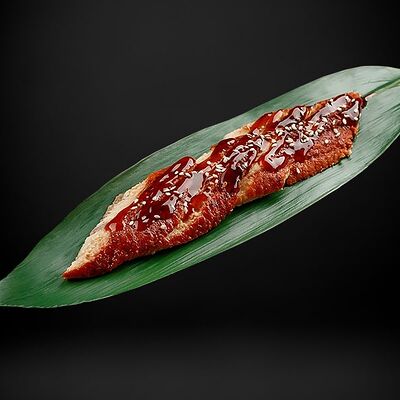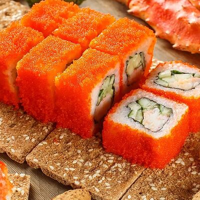 Филе угря, сливочный сыр, авокадо, лист салата, соус унаги, рис, харумаки, кунжут