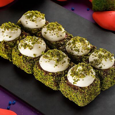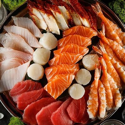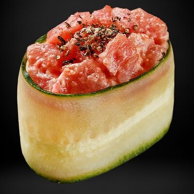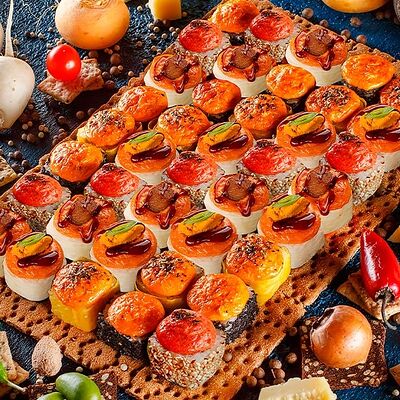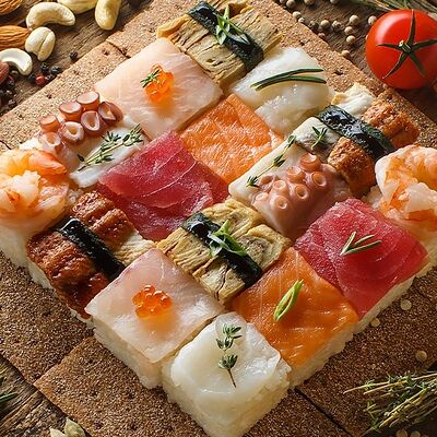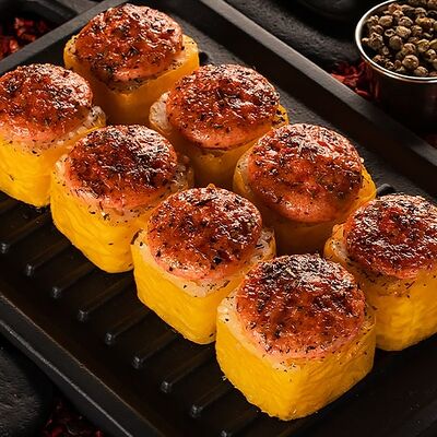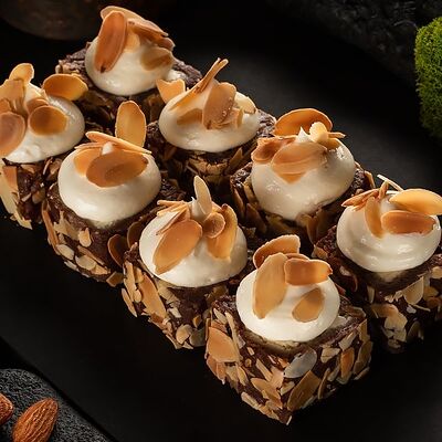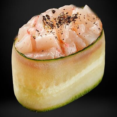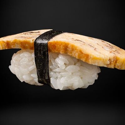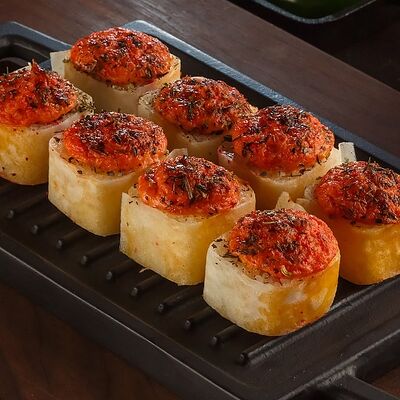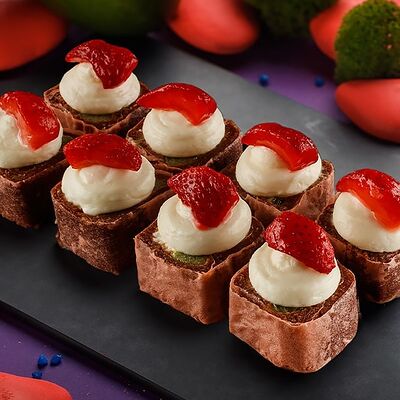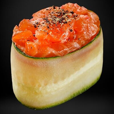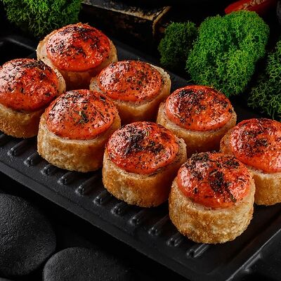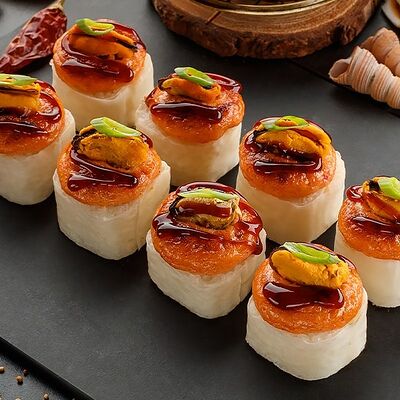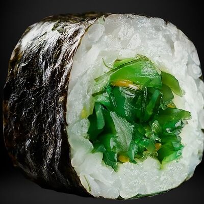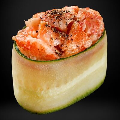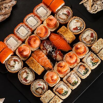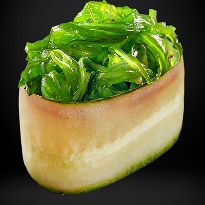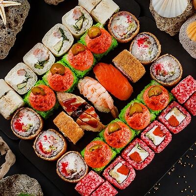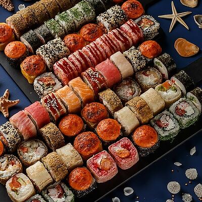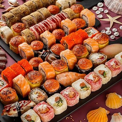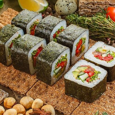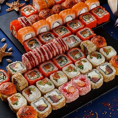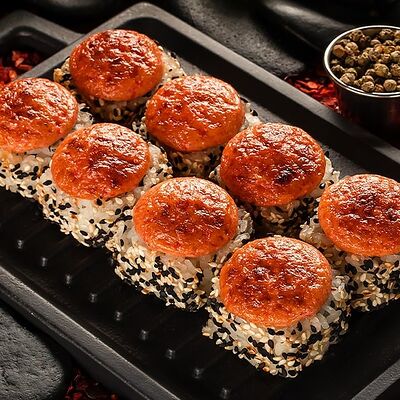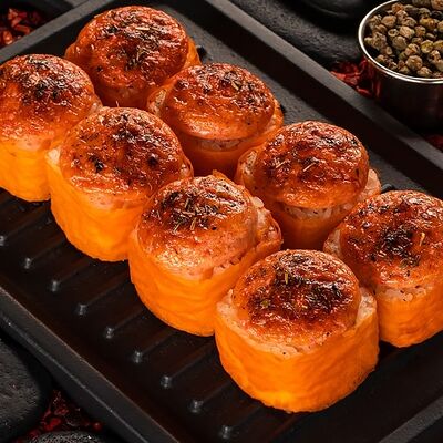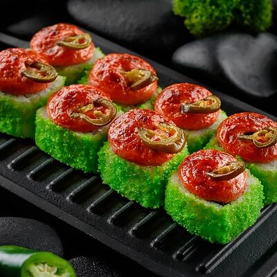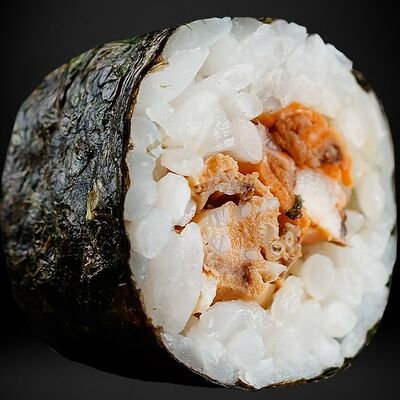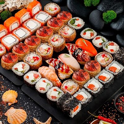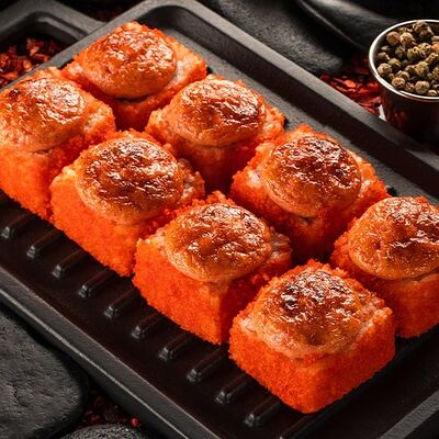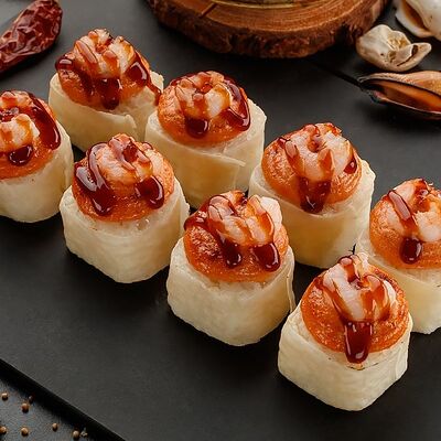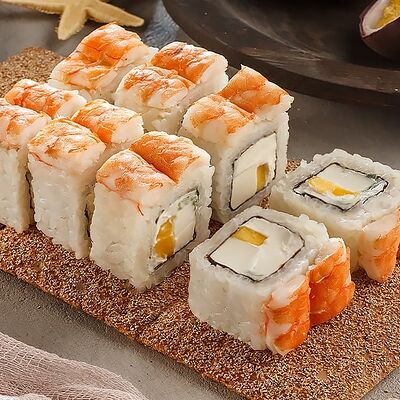 Филе угря, сливочный сыр, авокадо, лист салата, соус унаги, рис, харумаки, кунжут