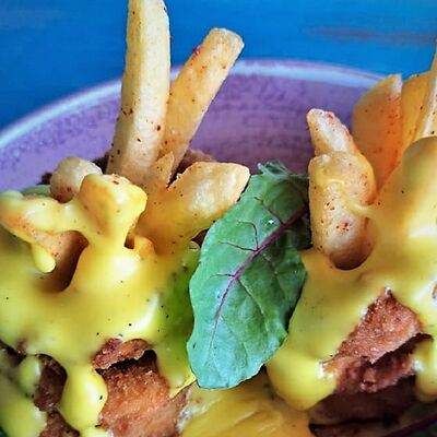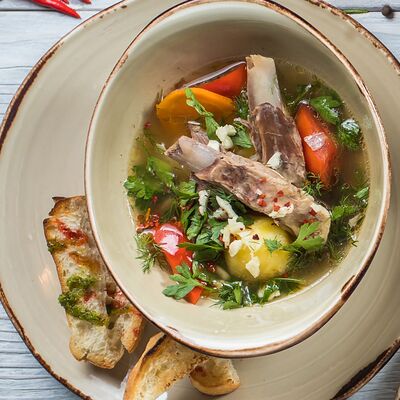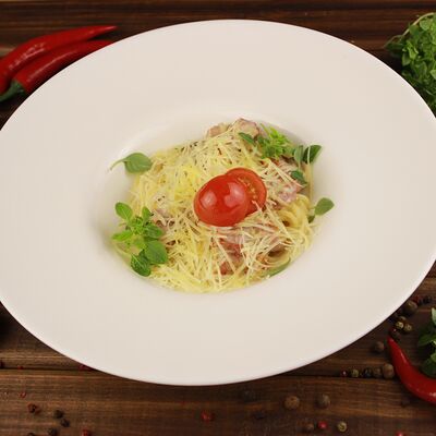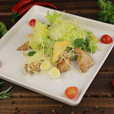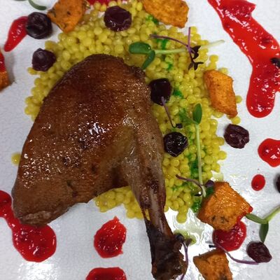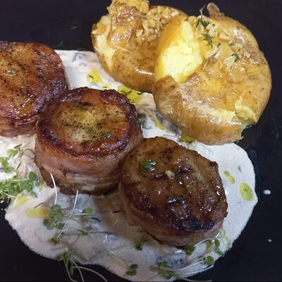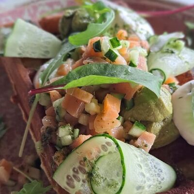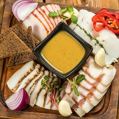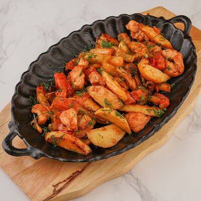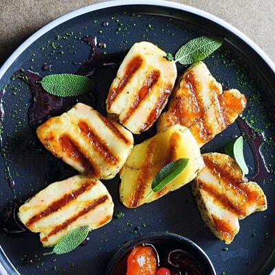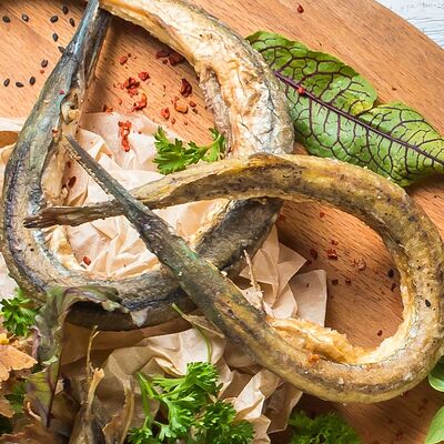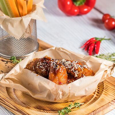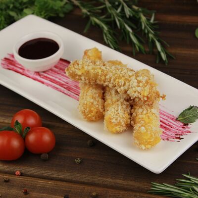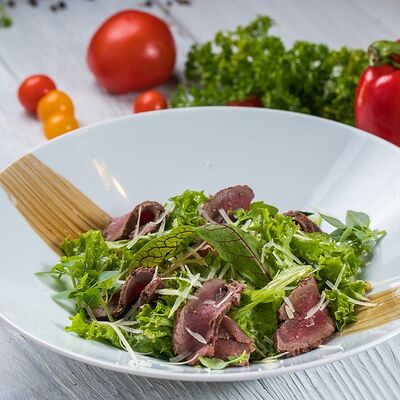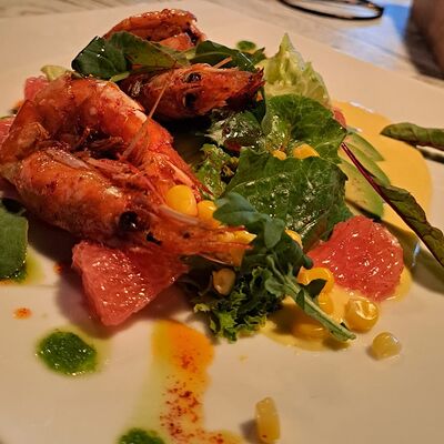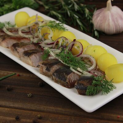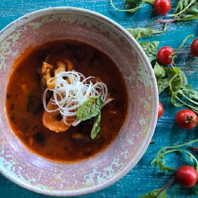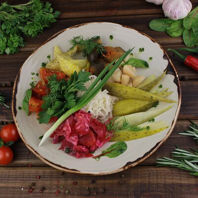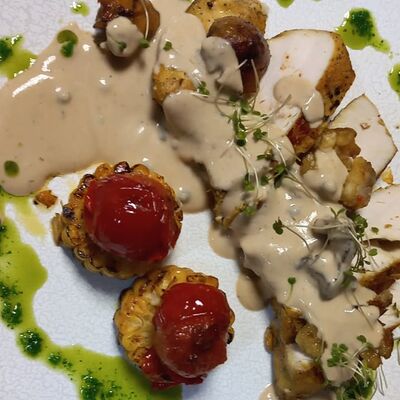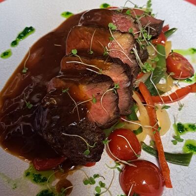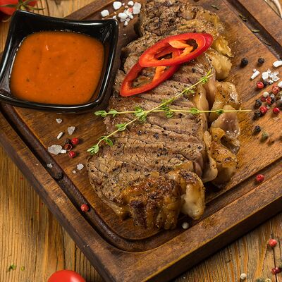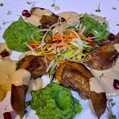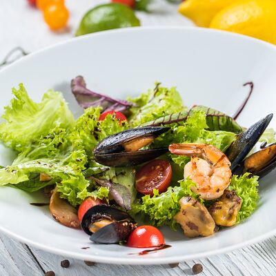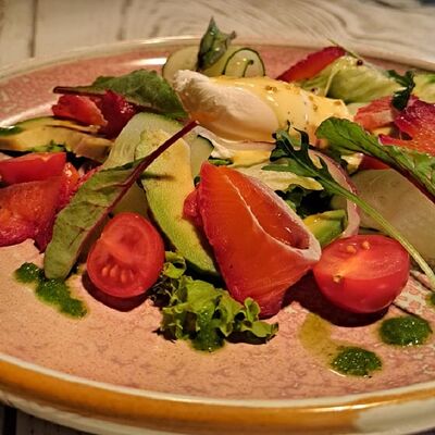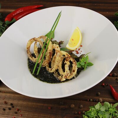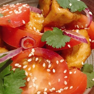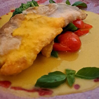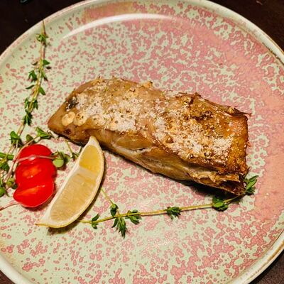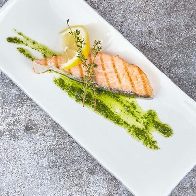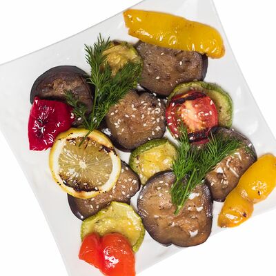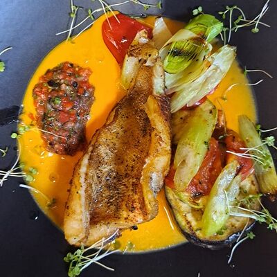 Филе морского окуня, соус соевый, помидоры, баклажаны, болгарский перец, сельдерей, лук-порей, томатная сальса, тыквенный соус