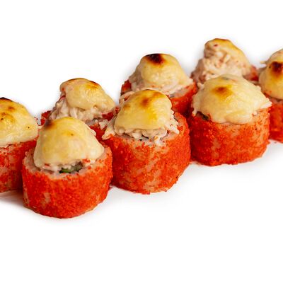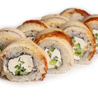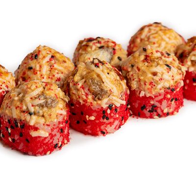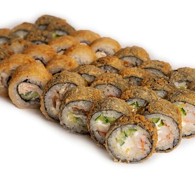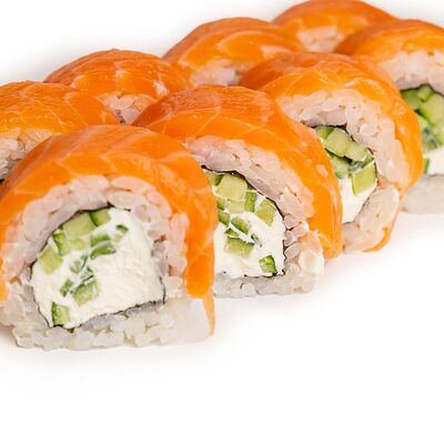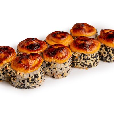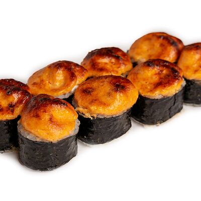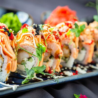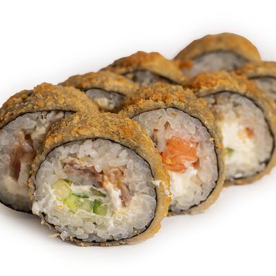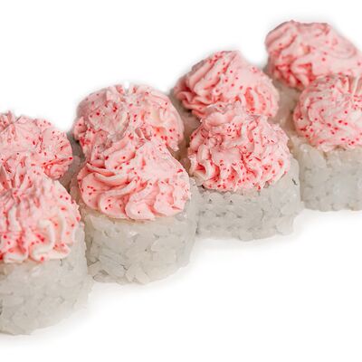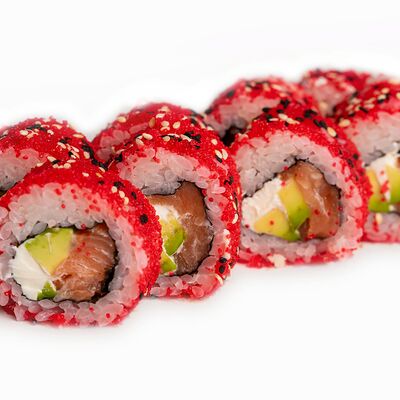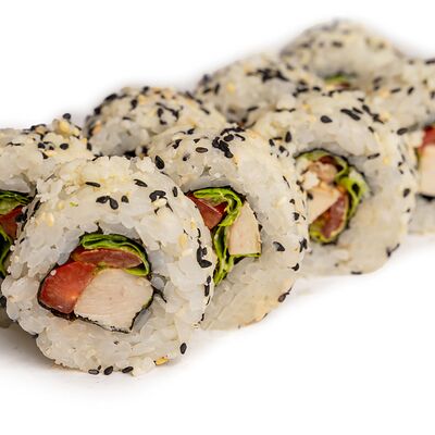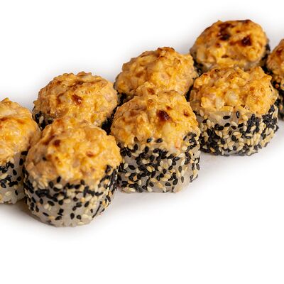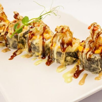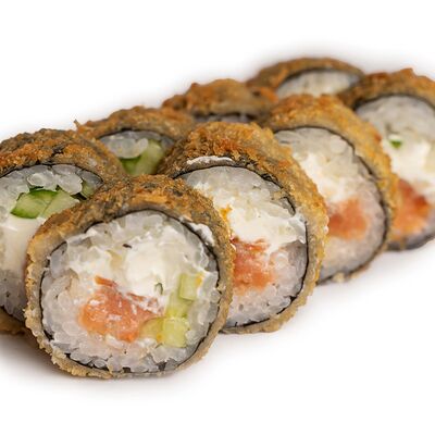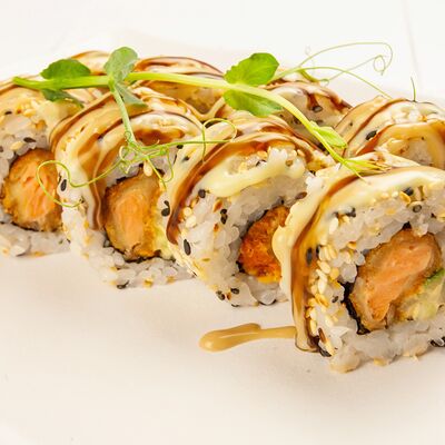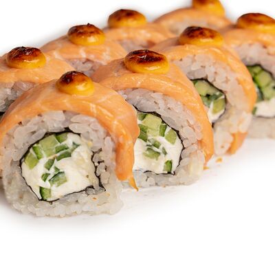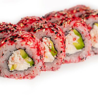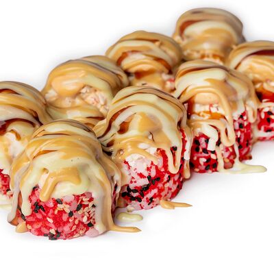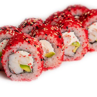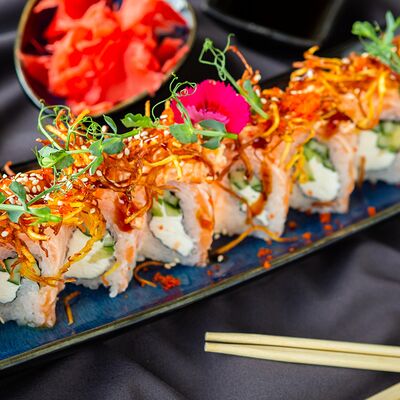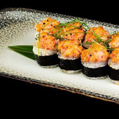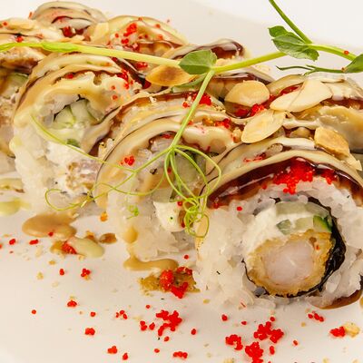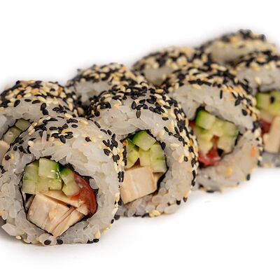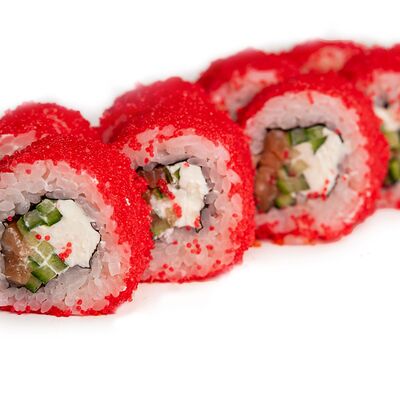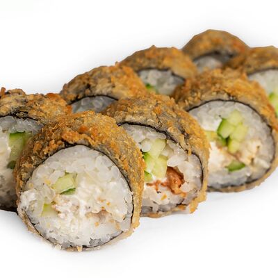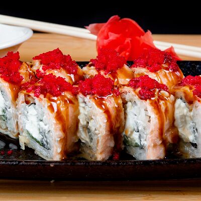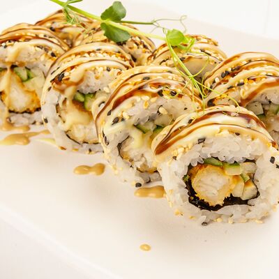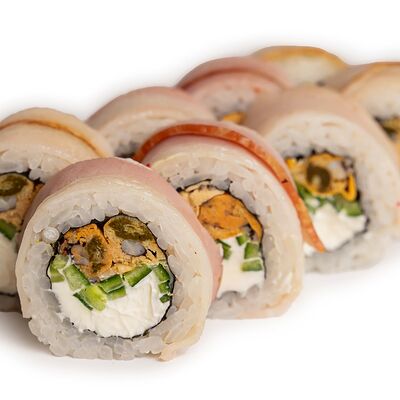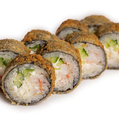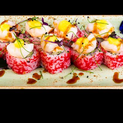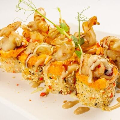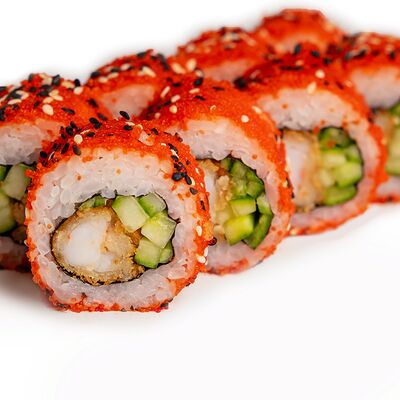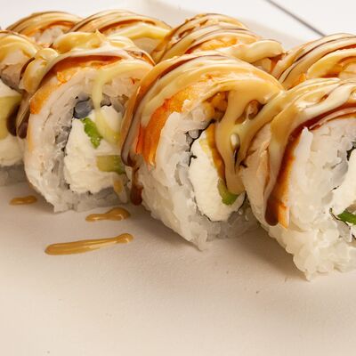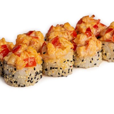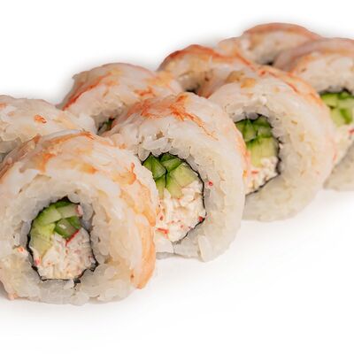 Тигровая креветка, спайси соус, свежий огурец, сыр творожный, кунжут, фирменные соуса
