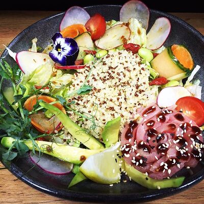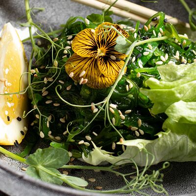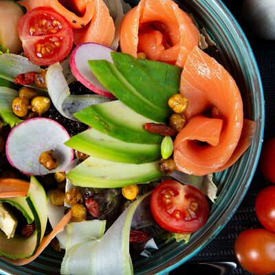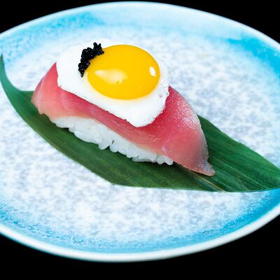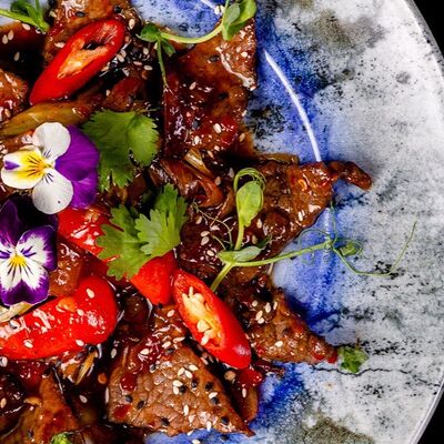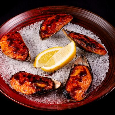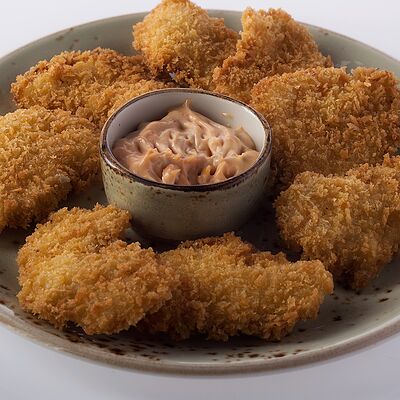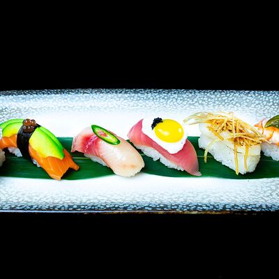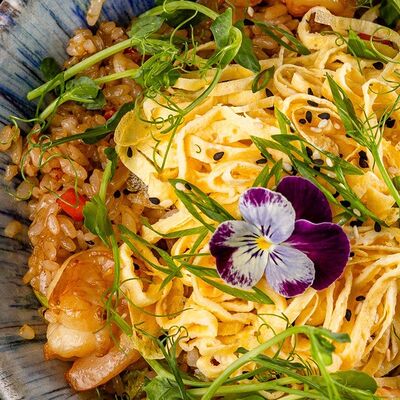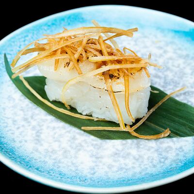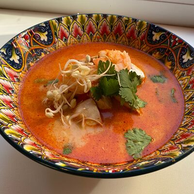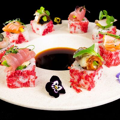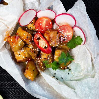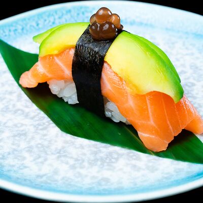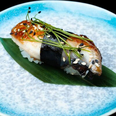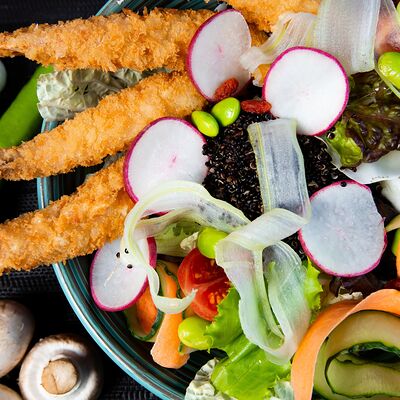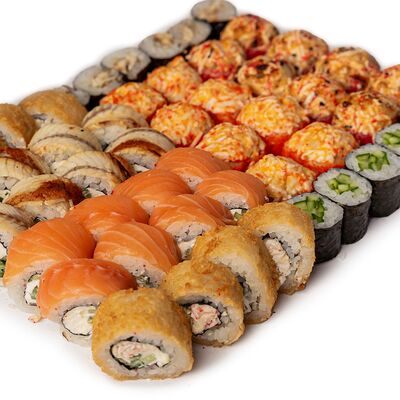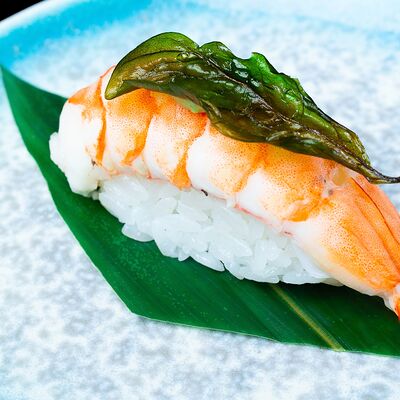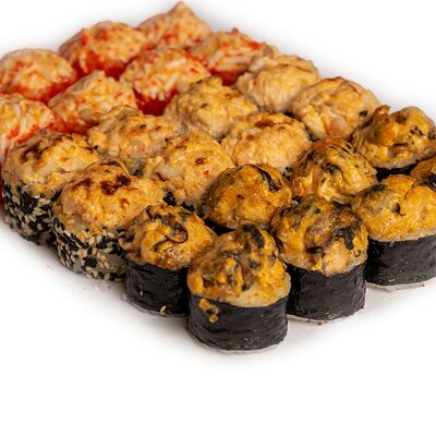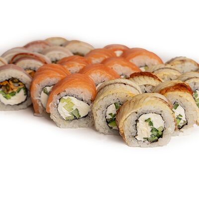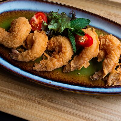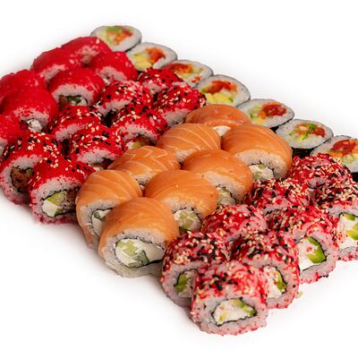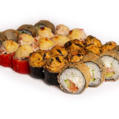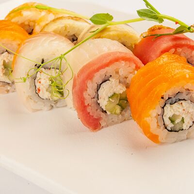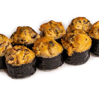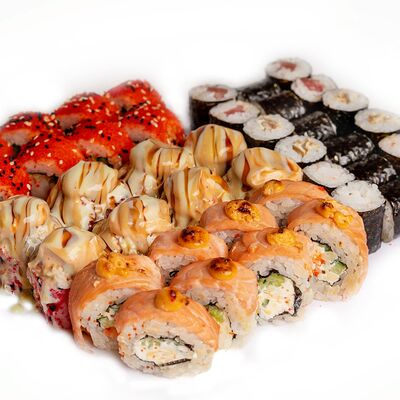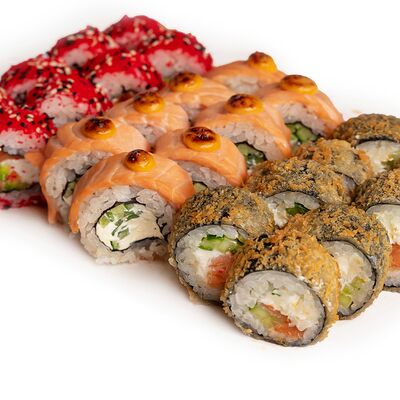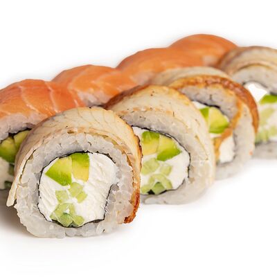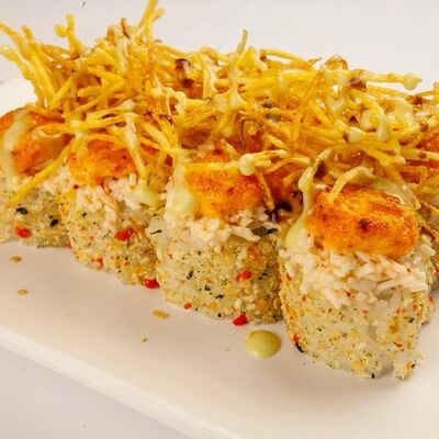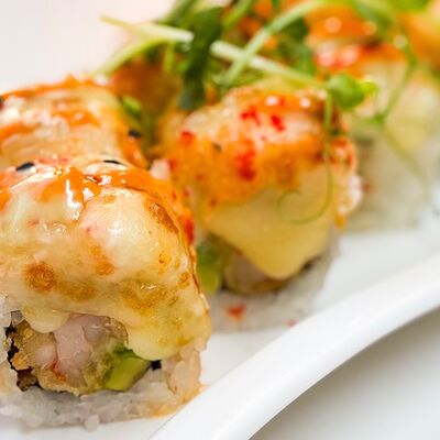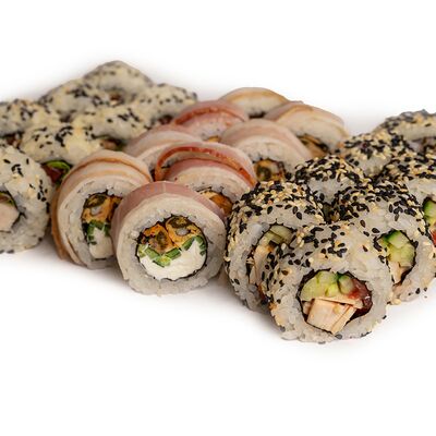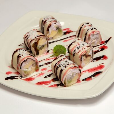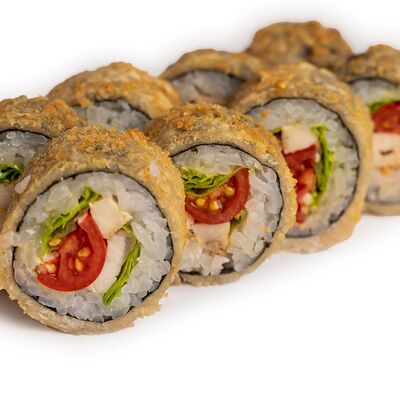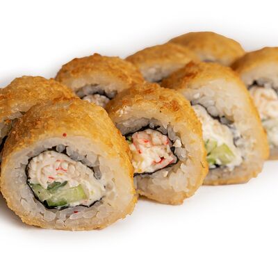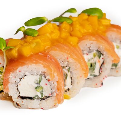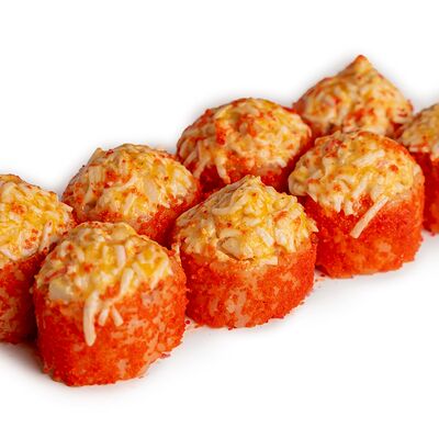 Тигровая креветка, спайси соус, свежий огурец, сыр творожный, кунжут, фирменные соуса