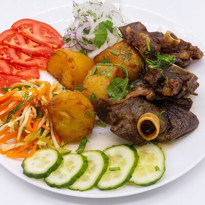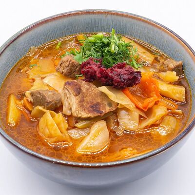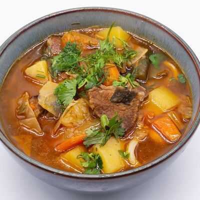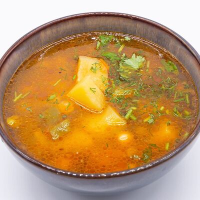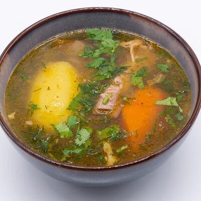 Говяжие фрикадельки, говяжий бульон, лук, нут, картошка, морковь и зелень