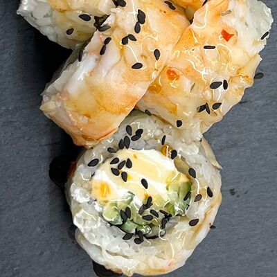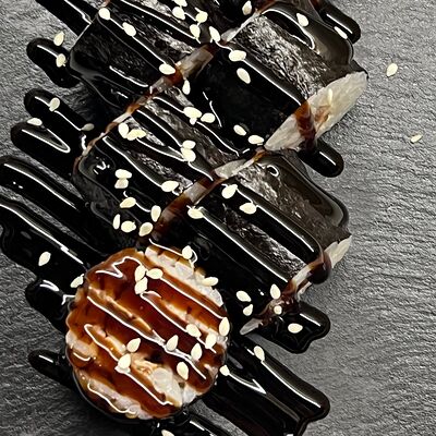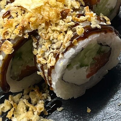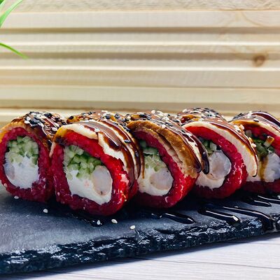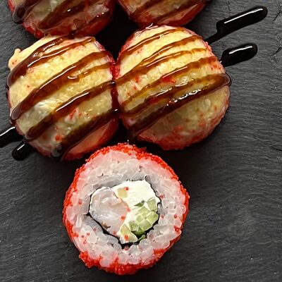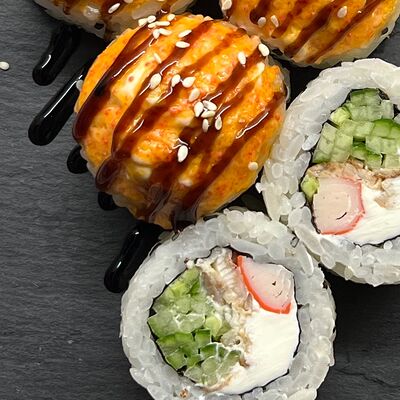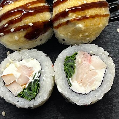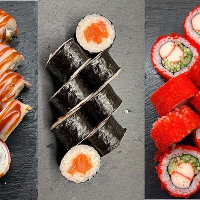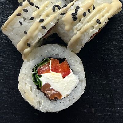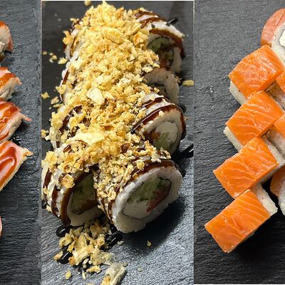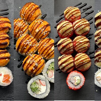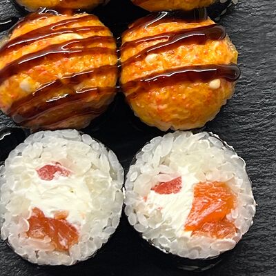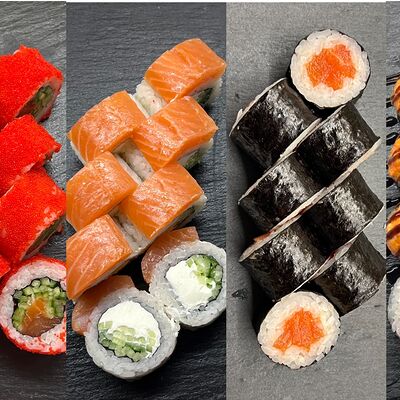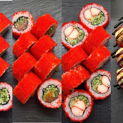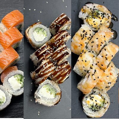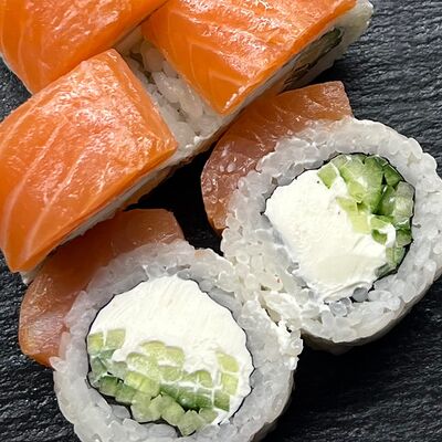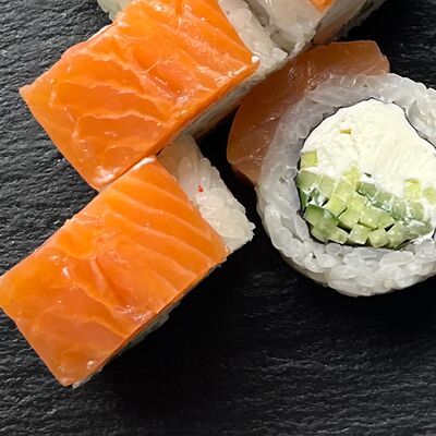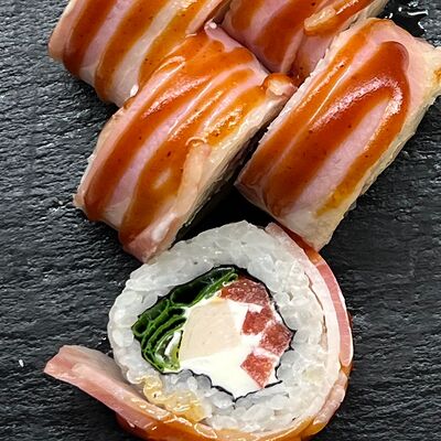 Монако ролл, запеченный с беконом, филадельфия с копченым лососем