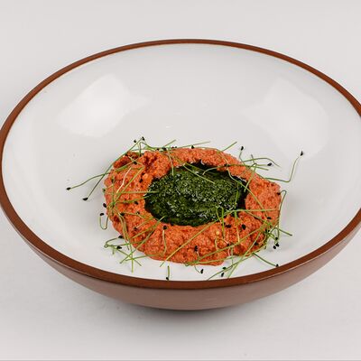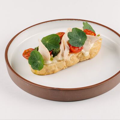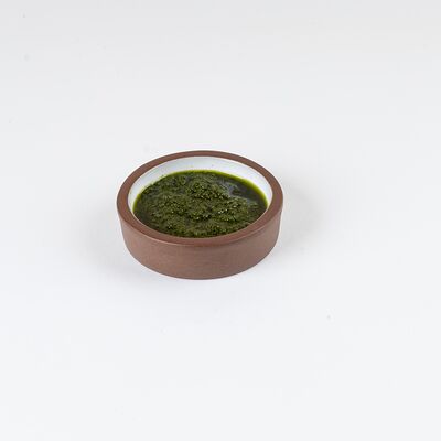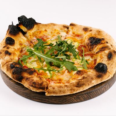 Тесто для пиццы, соус томатный, креветка тигровая маринованная, кабачок, руккола, соус сладкий чили, масло оливковое, прованские травы