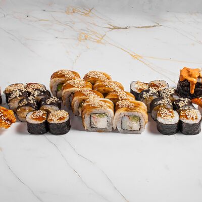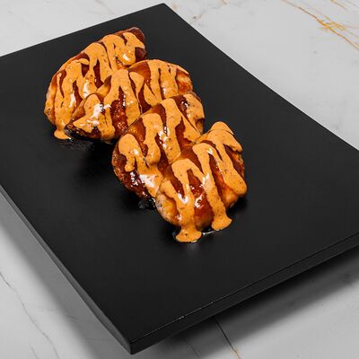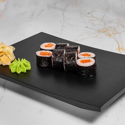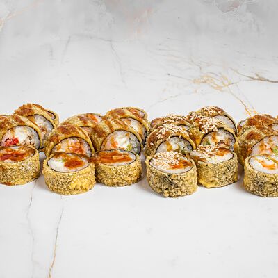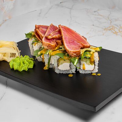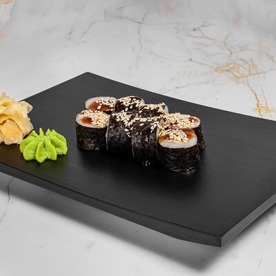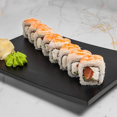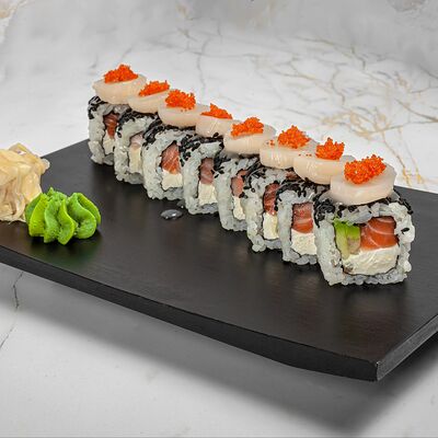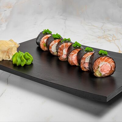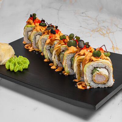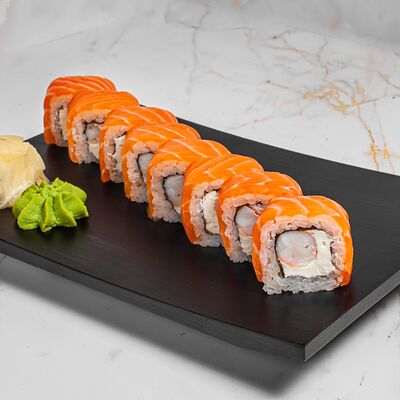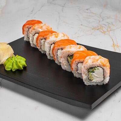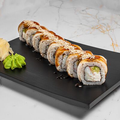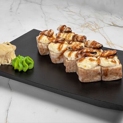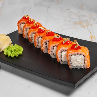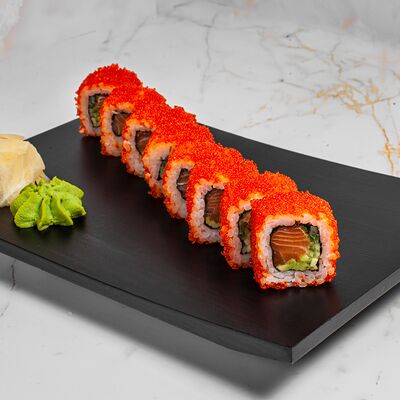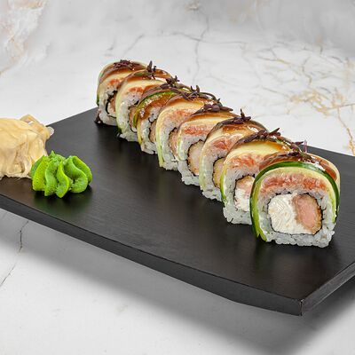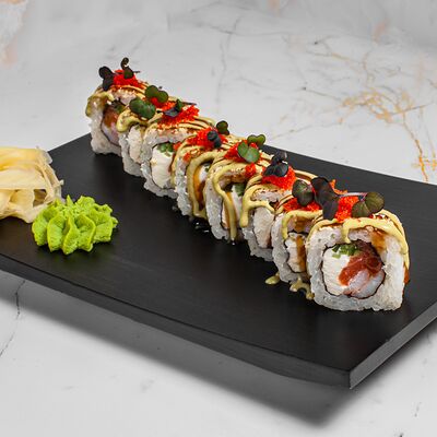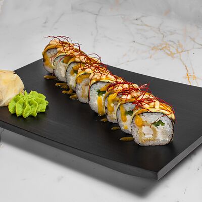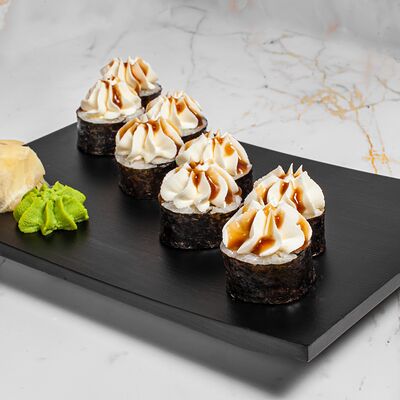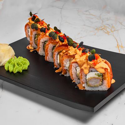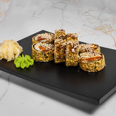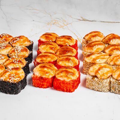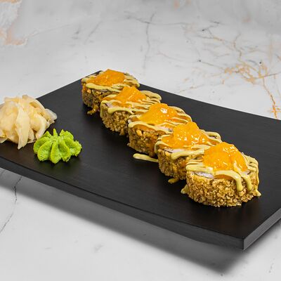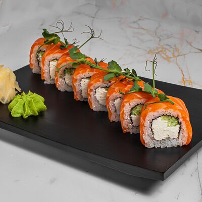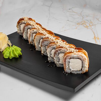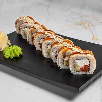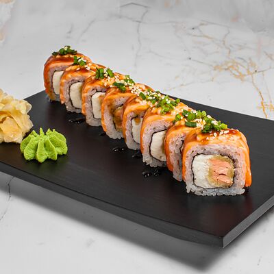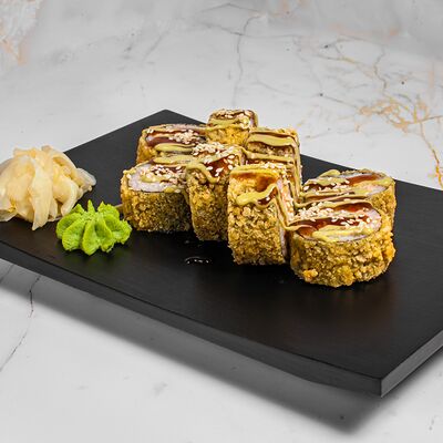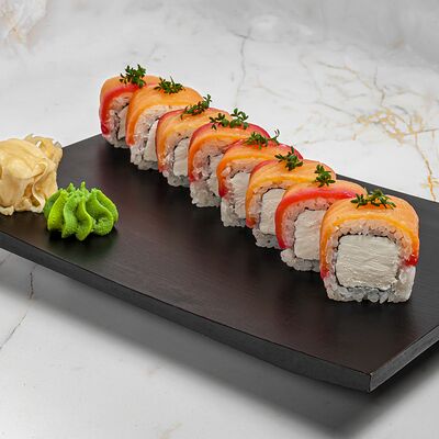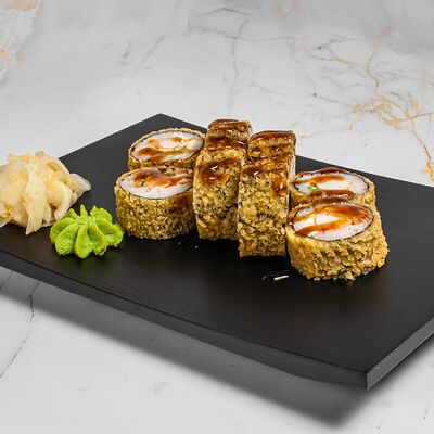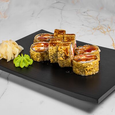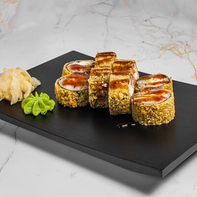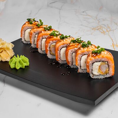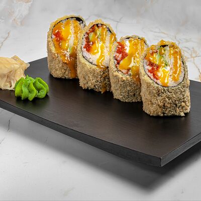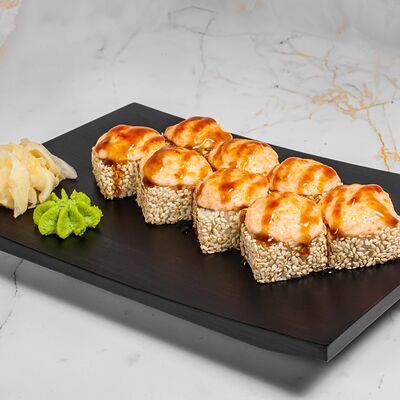 Сыр cremette, лосось темпура, охлаждённый лосось, соус унаги, соус масаго, кунжут, рис. (Запечённый ролл)