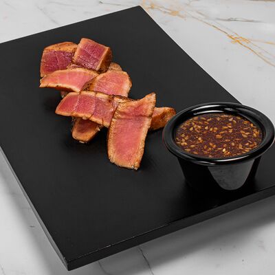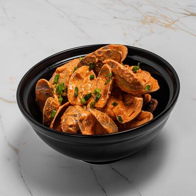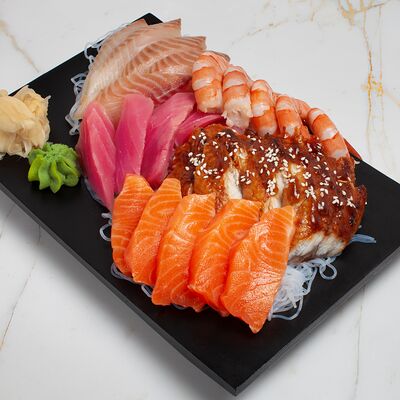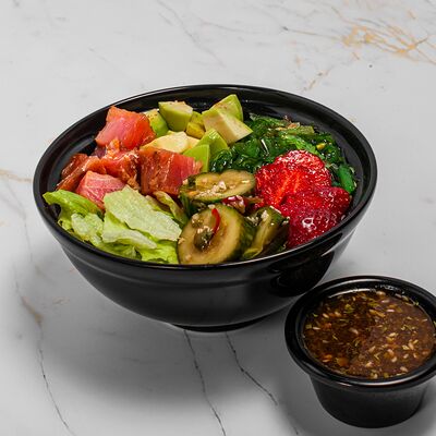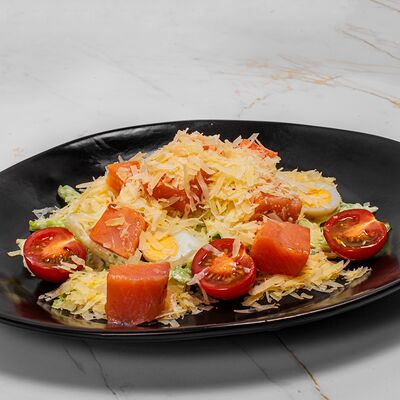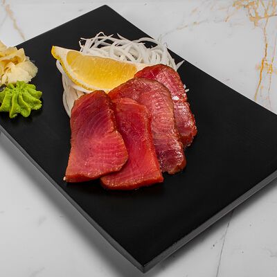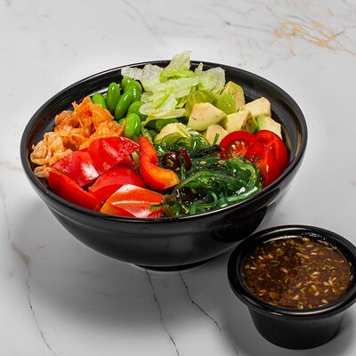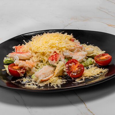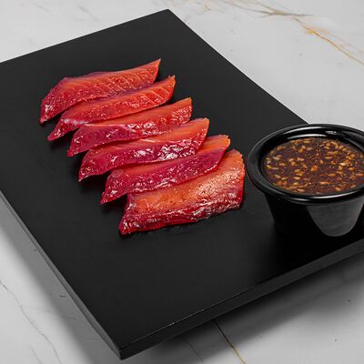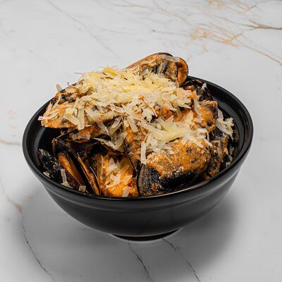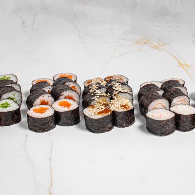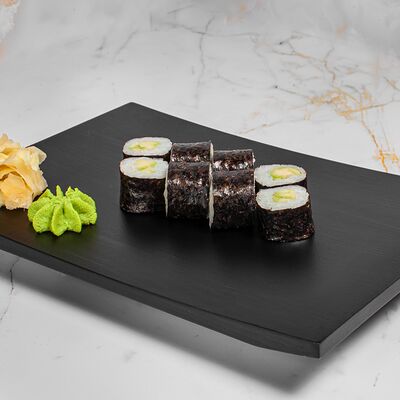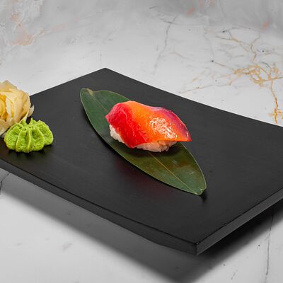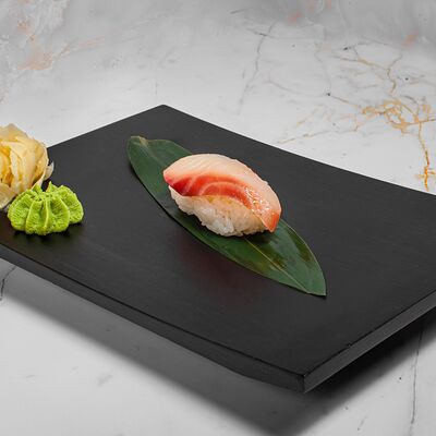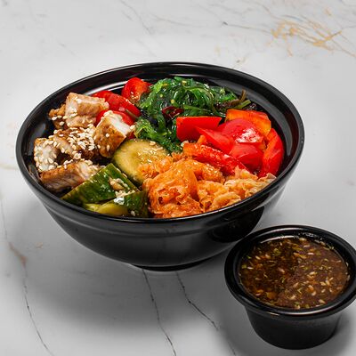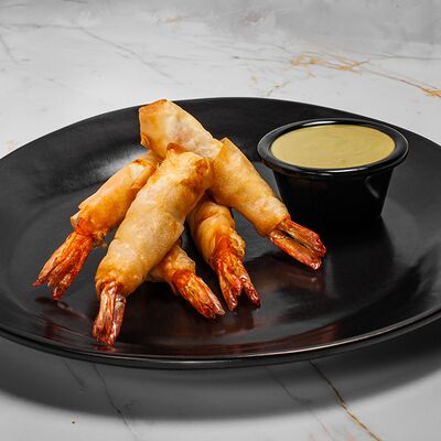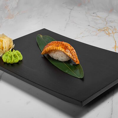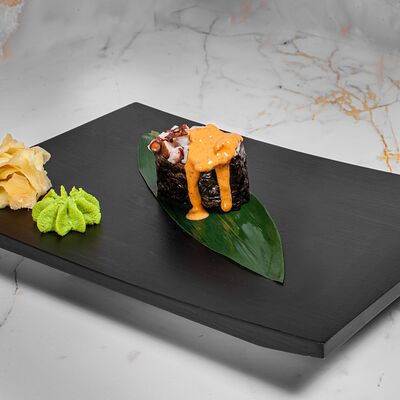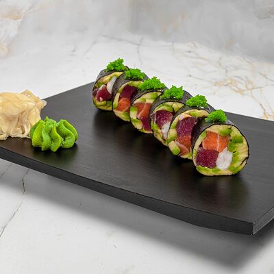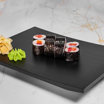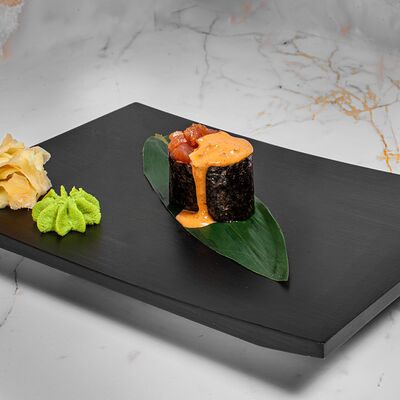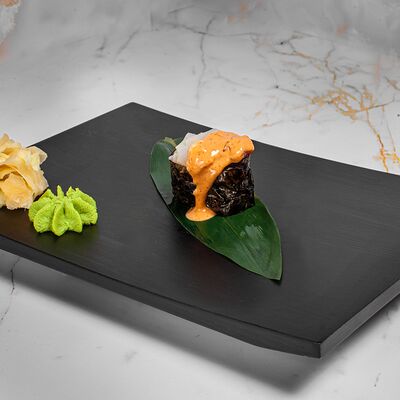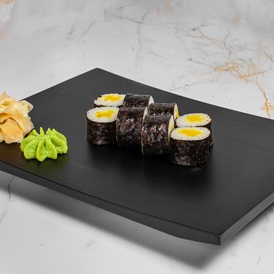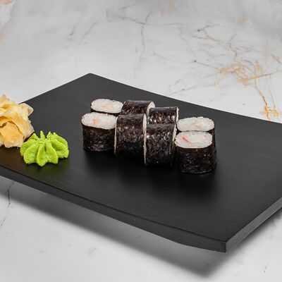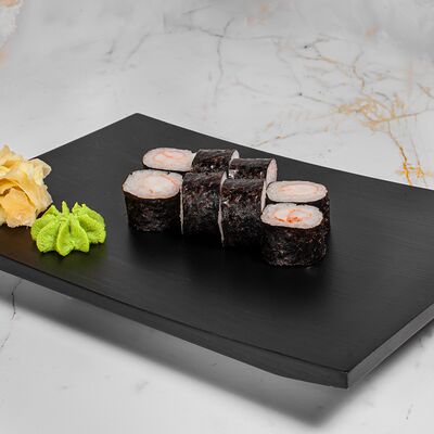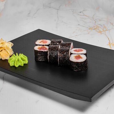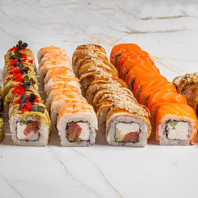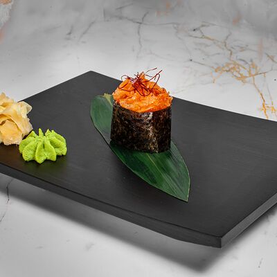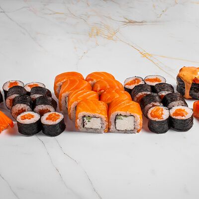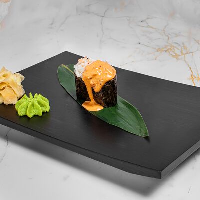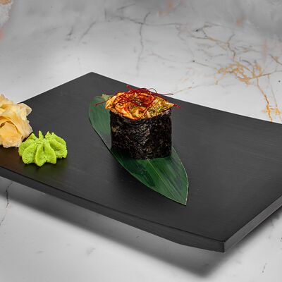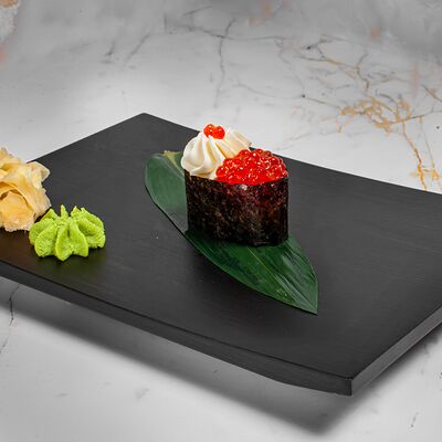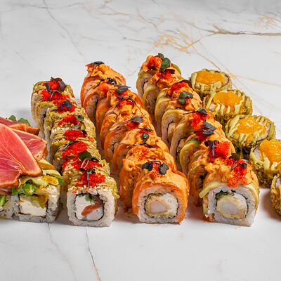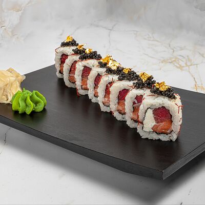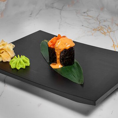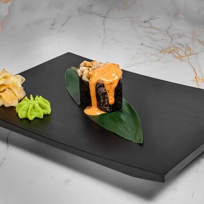 Сыр cremette, лосось темпура, охлаждённый лосось, соус унаги, соус масаго, кунжут, рис. (Запечённый ролл)