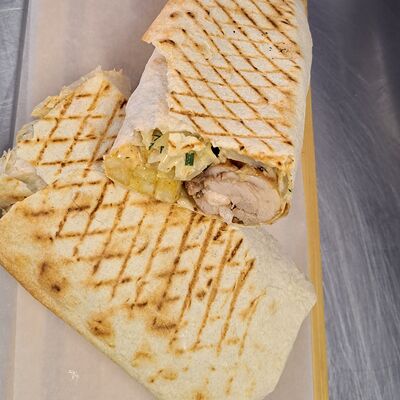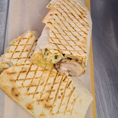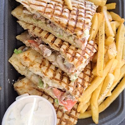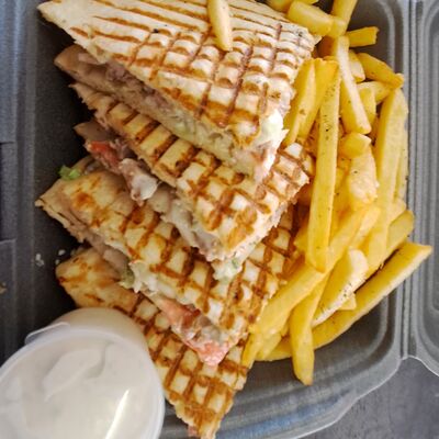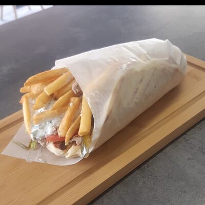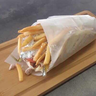 Пита, куриное филе, жаренное на мангале, пекинская капуста, помидор, соленый огурец, картофель фри, белый соус дзадзыки