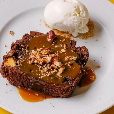 Шоколадный пирог с мороженым и карамельным соусом