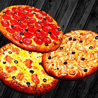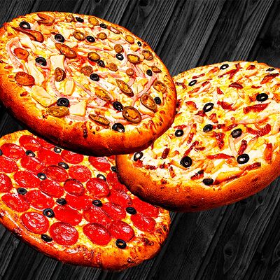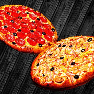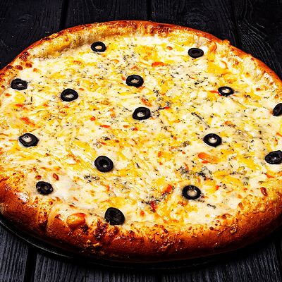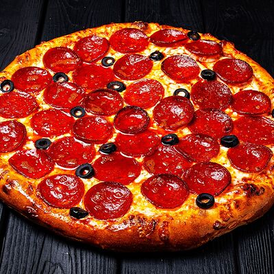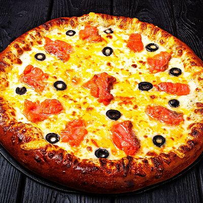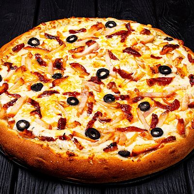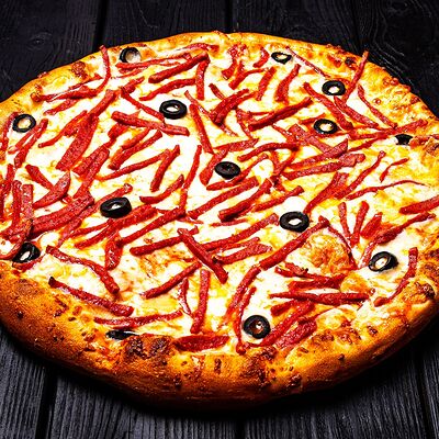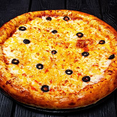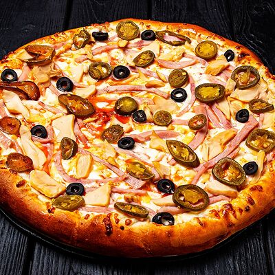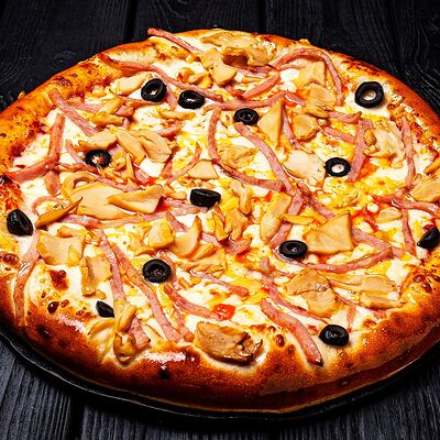 Нежная ветчина, красный соус Понти, сыр маасдам, сыр моцарелла, шампиньоны, маслины (30 см)