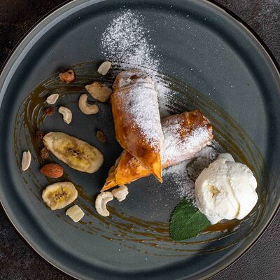 Яблоко, груша, тесто слоеное бездрожжевое, яйцо куриное, корица, сахар, панировочные сухари