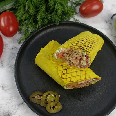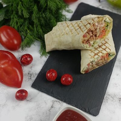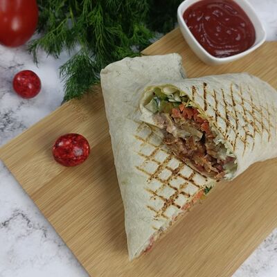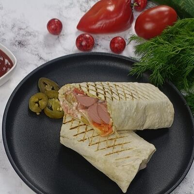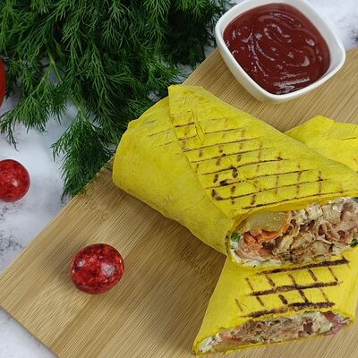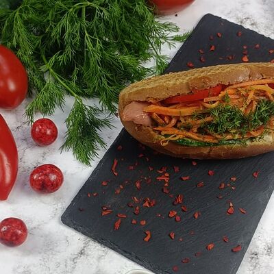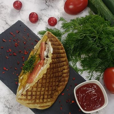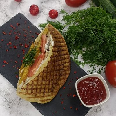 Булочка круглая, курица, соус чесночный, грибы, маслины, кукуруза, сыр