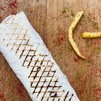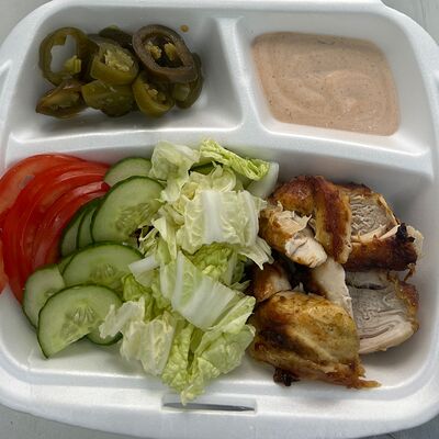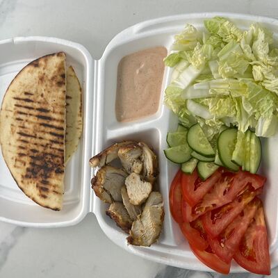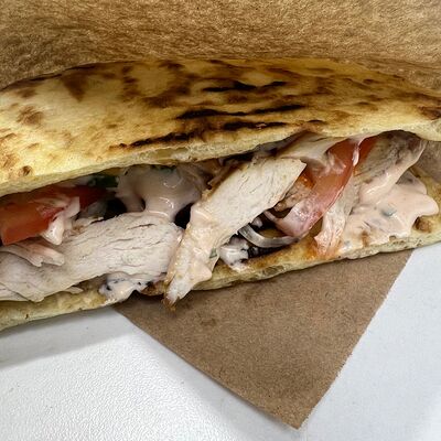 Курица, свежий огурец, помидоры, лук, зелень, пекинская капуста, маринованная морковь, фирменный соус