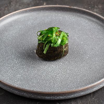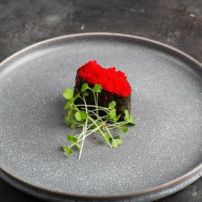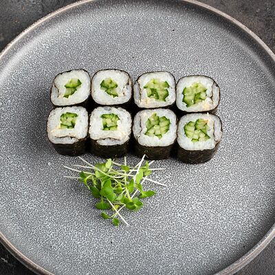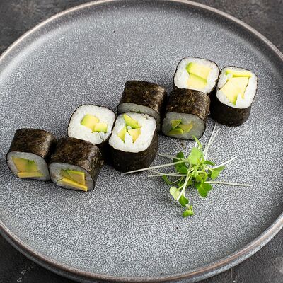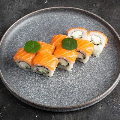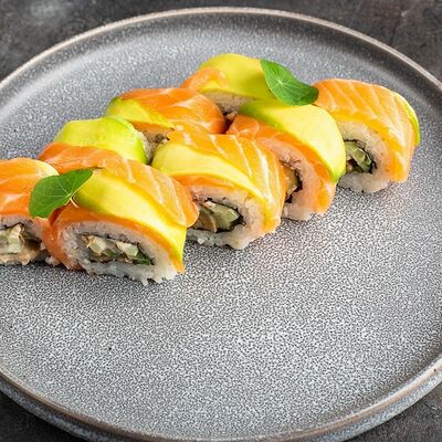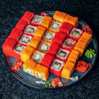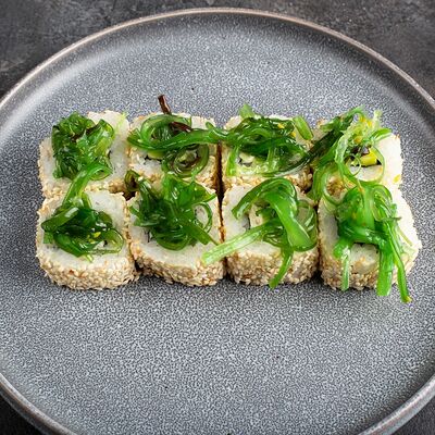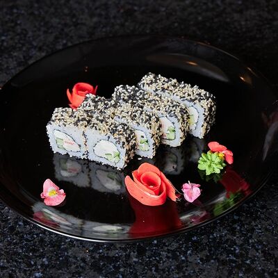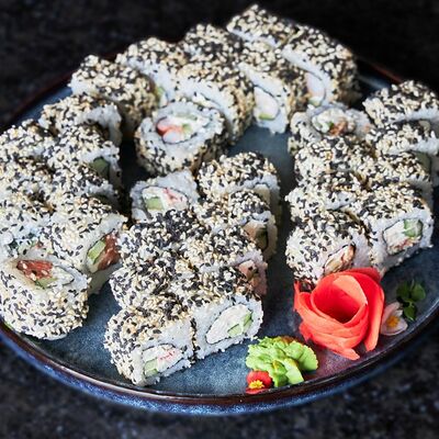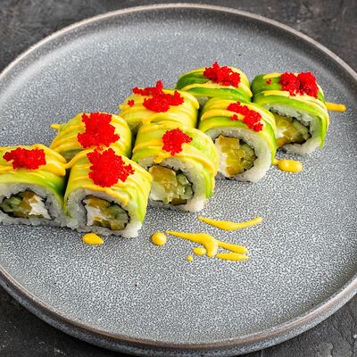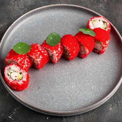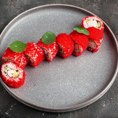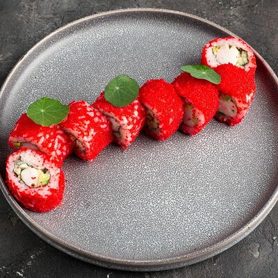 Рис, нори, крем-краб, краб (имитация), авокадо, такуан, соус устричный