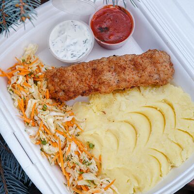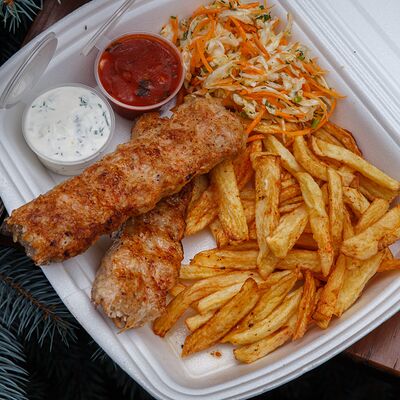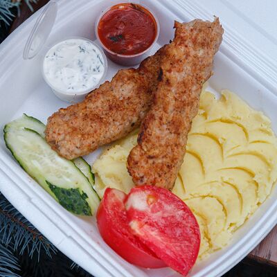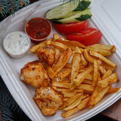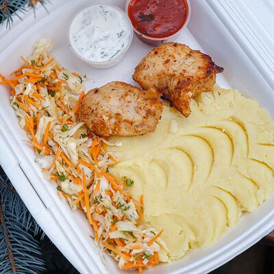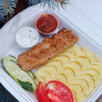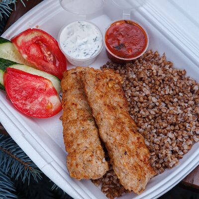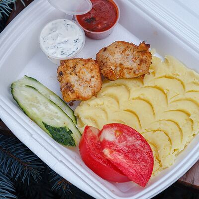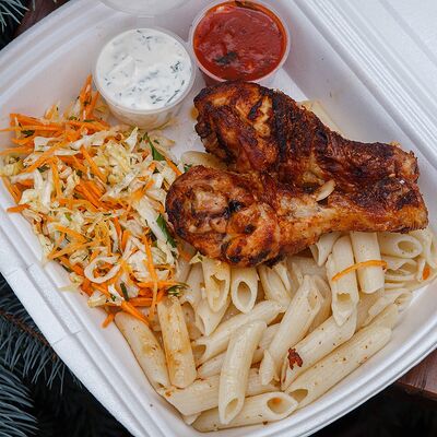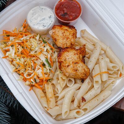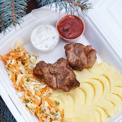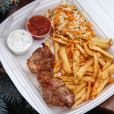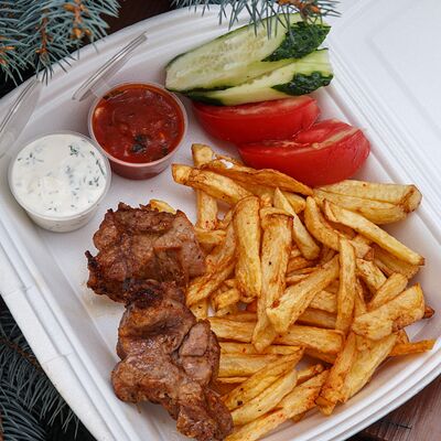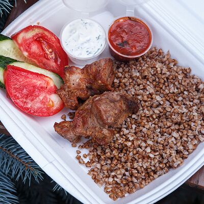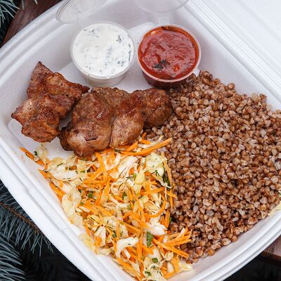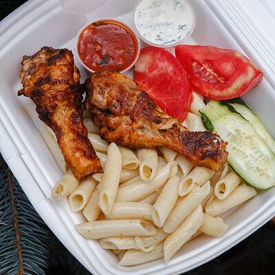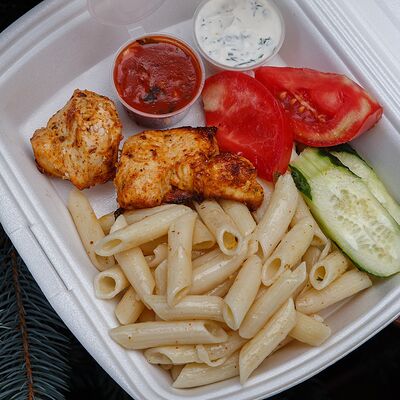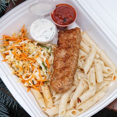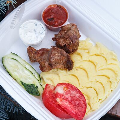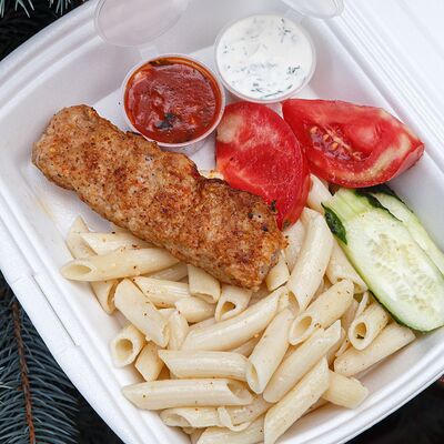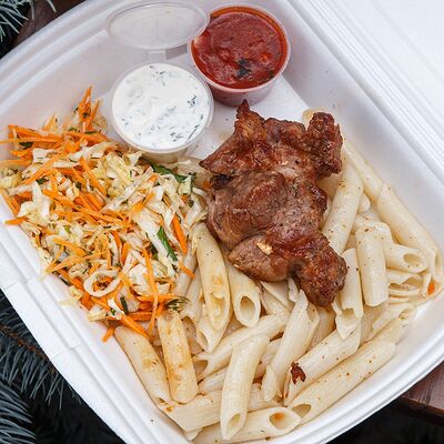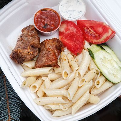 Шашлык из свинины, макароны, помидор, огурец, соус красный, белый