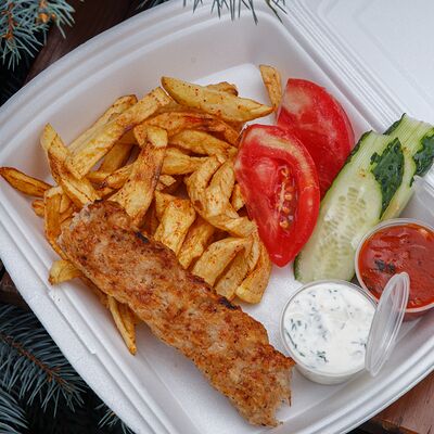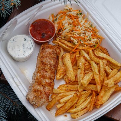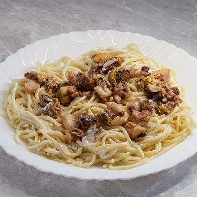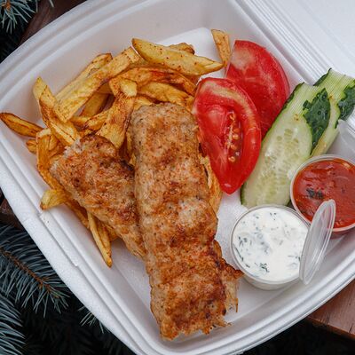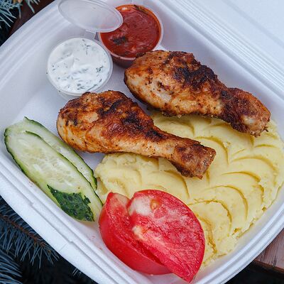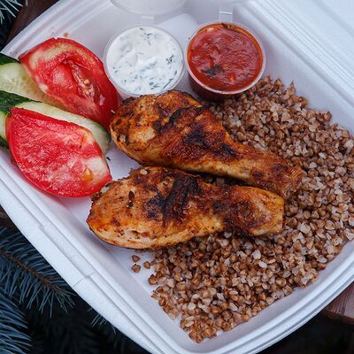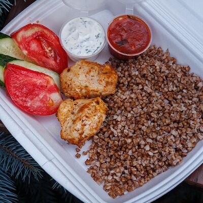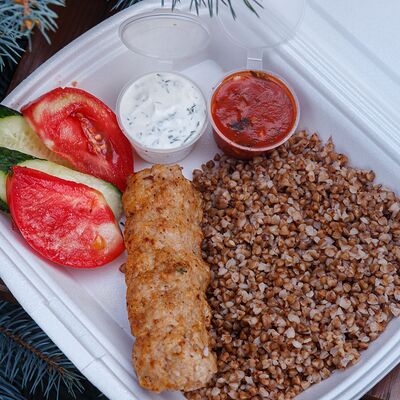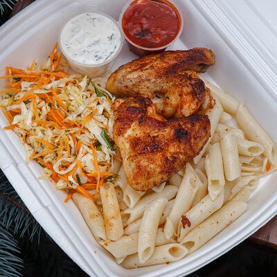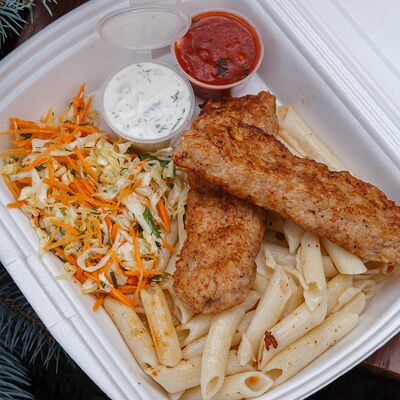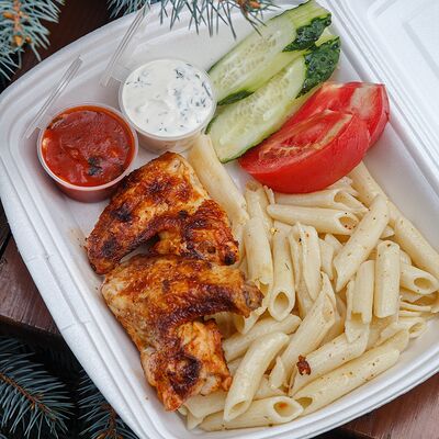 Свинина с макаронами, помидор, огурец доставка