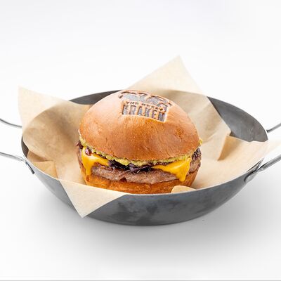 Булочка бриошь или салат айсберг, котлета из мраморной говядины, соус томат-кола, соус релиш, лук карамелизированный, чеддер