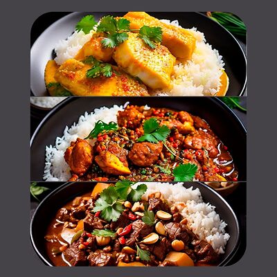 В составе: массаман карри Куала-Лумпур (200 г), гарам масала Бомбей (200 г), желтый карри с судаком Фишка (150 г), рис (200 г). Для знакомства с нашим меню, мы собрали в один сет яркие карри, что бы дать вам попробовать и выбрать своей любимый
