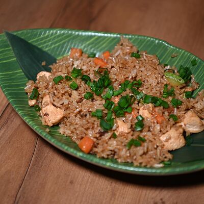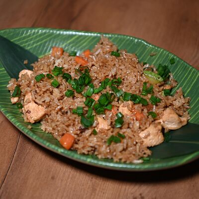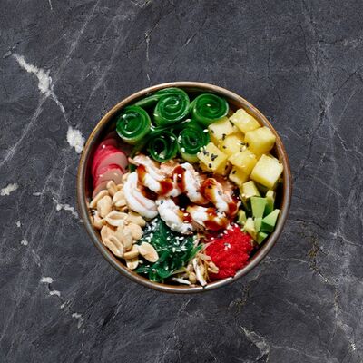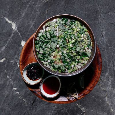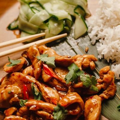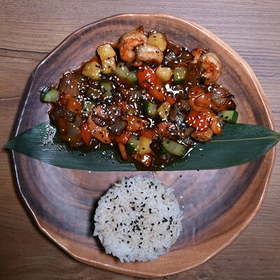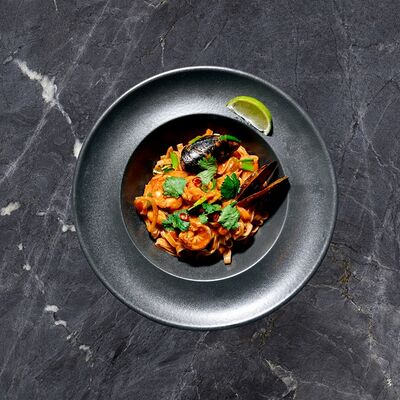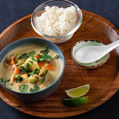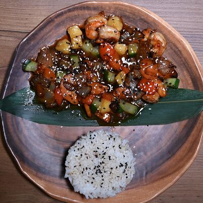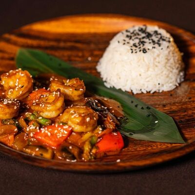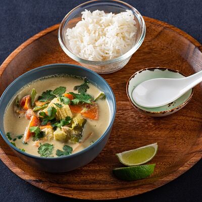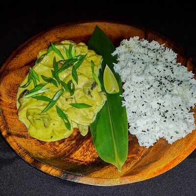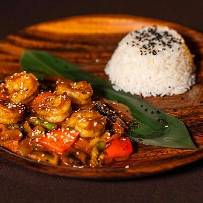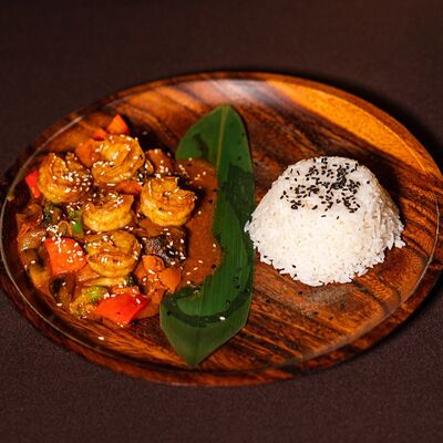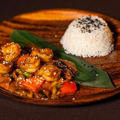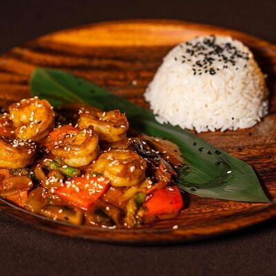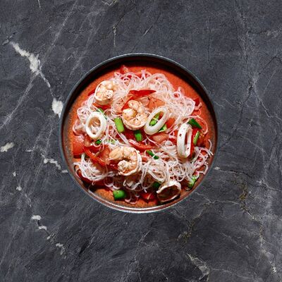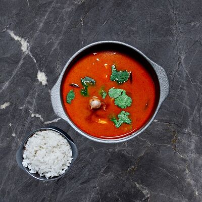 Лемонграсс, каффир-лайм, кокосовое молоко, паста том кха, вешенки, томаты, креветки, кинза, сливки, рис отварной