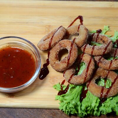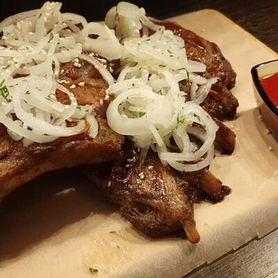 Свиные ребрышки в медовом маринаде, маринованный лучок, соус