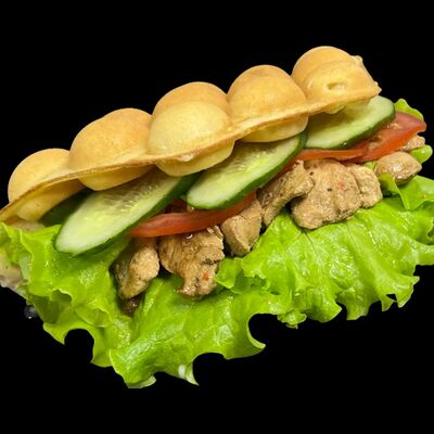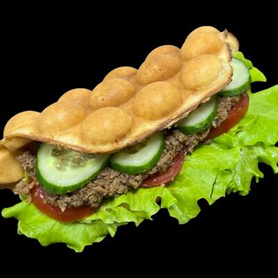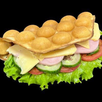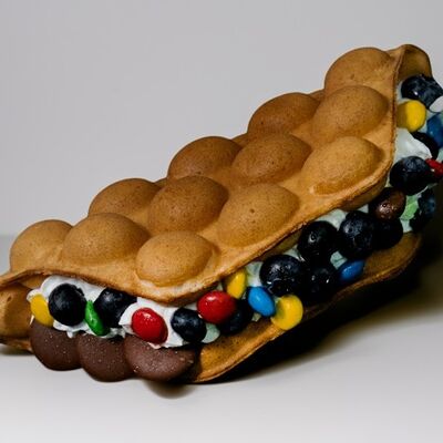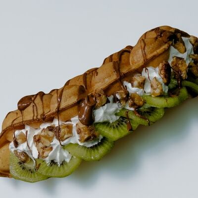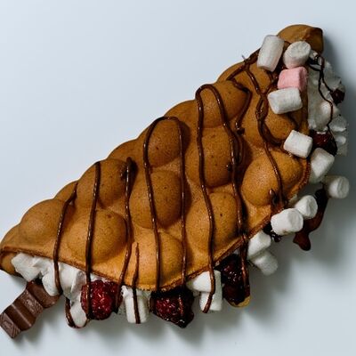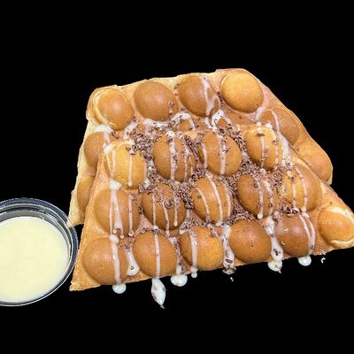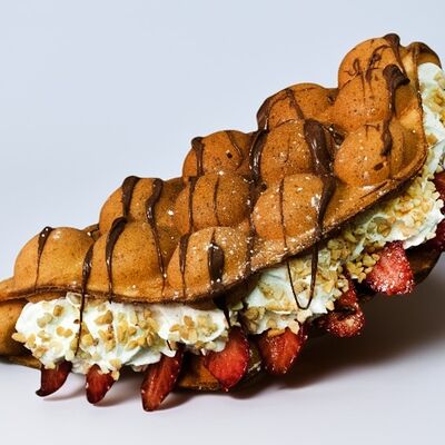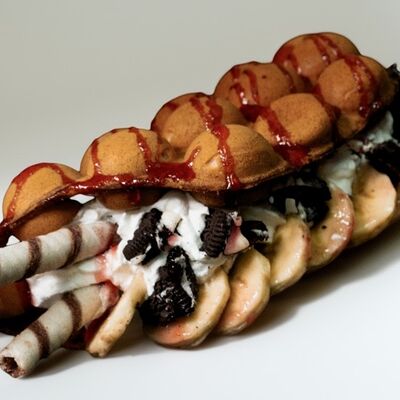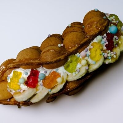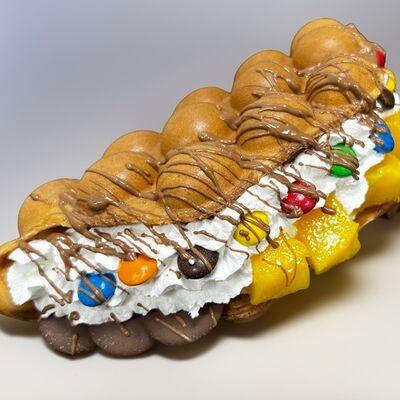 Наслаждайтесь вкусом нашей гонконгской сладкой вафли с бананом, печеньем Oreo, вафельными палочками, политой клубничным топпингом