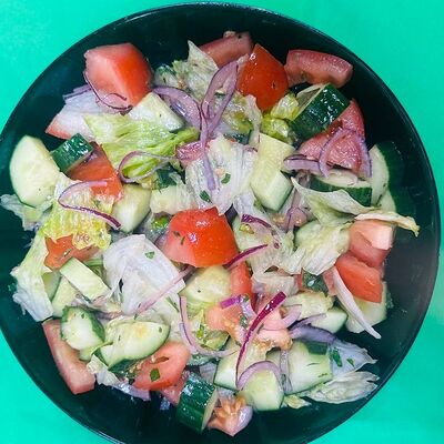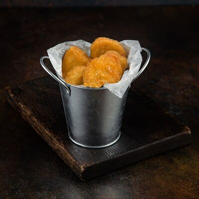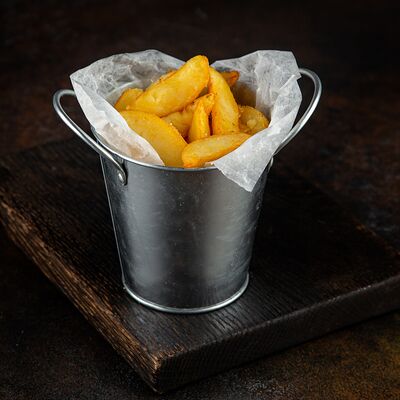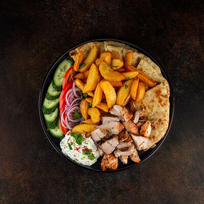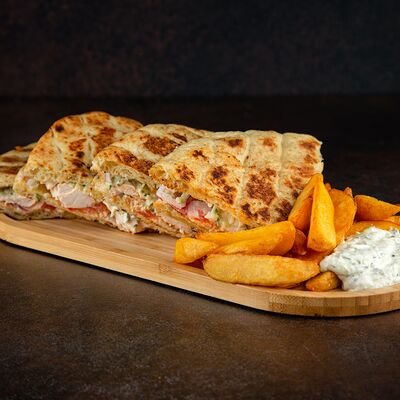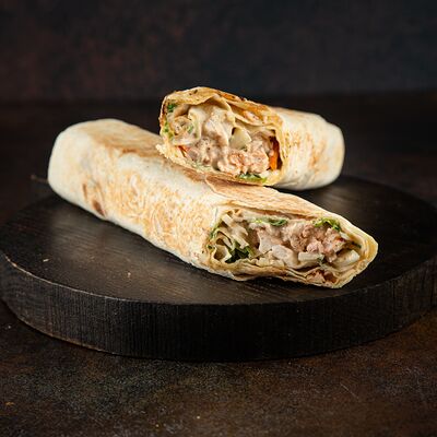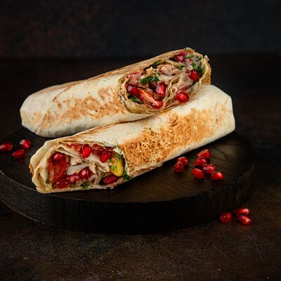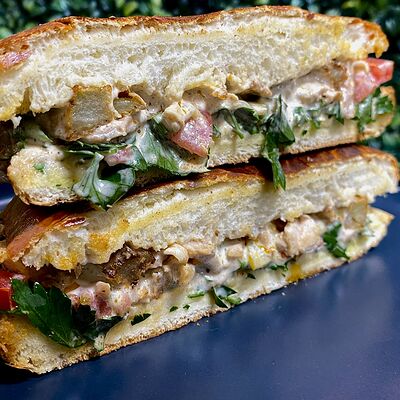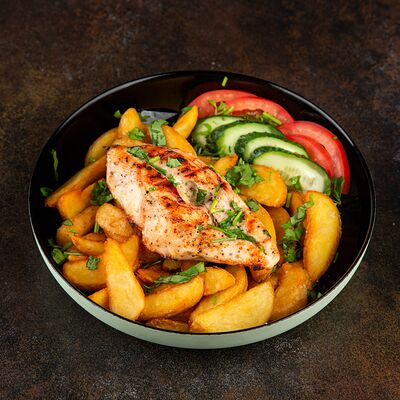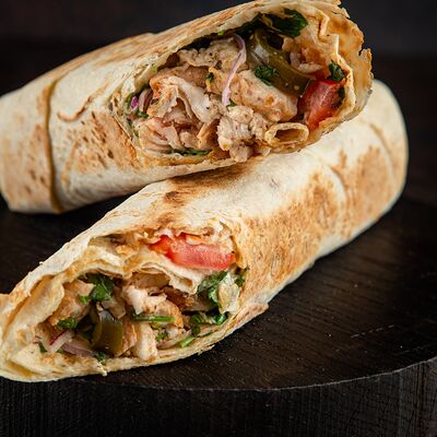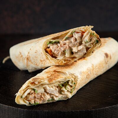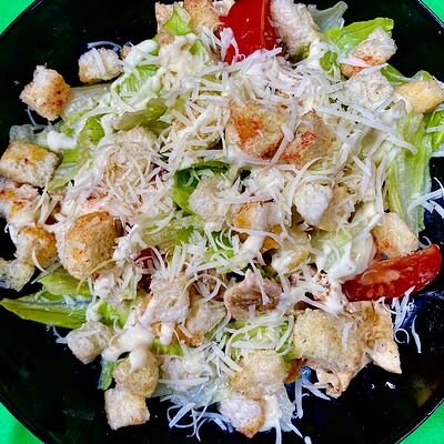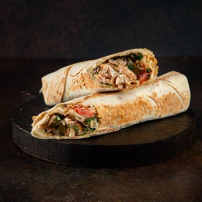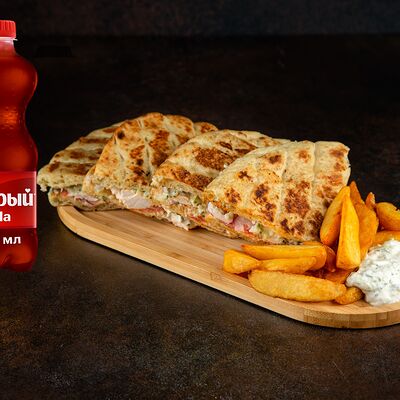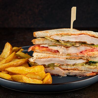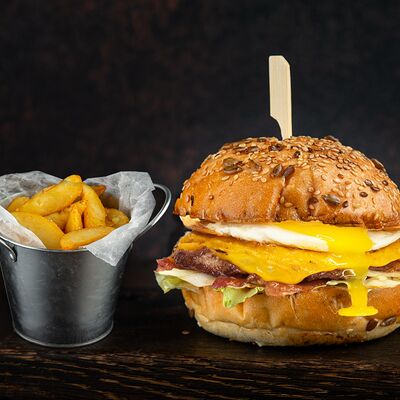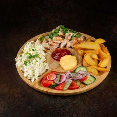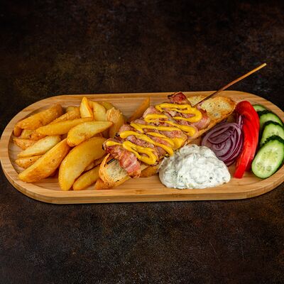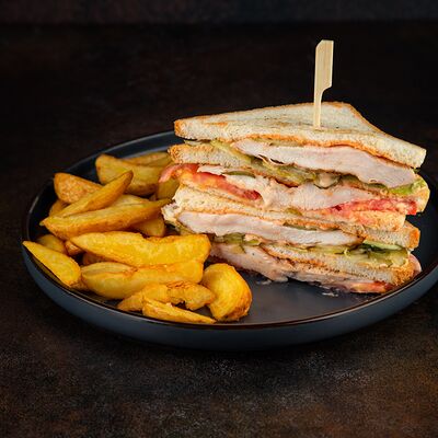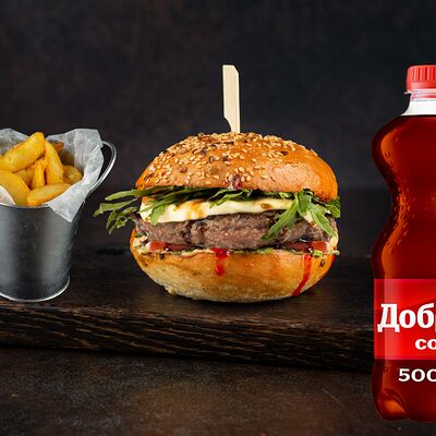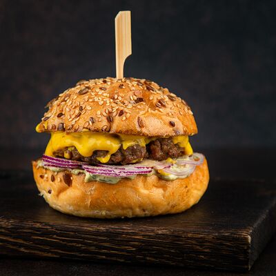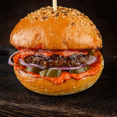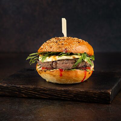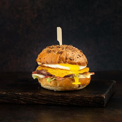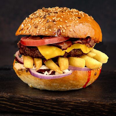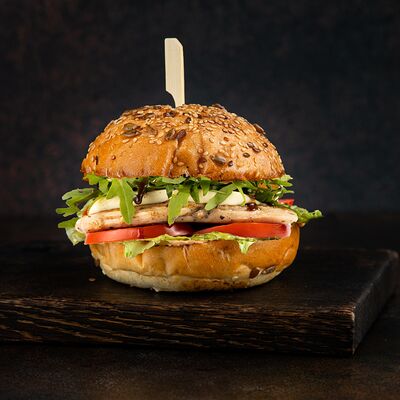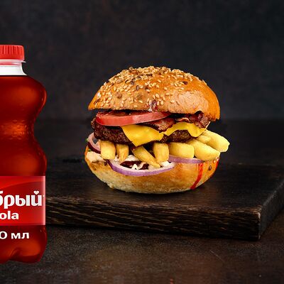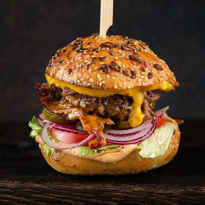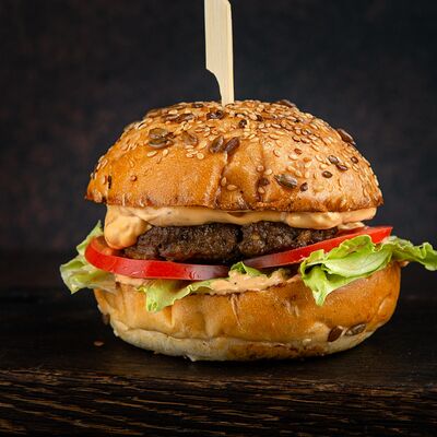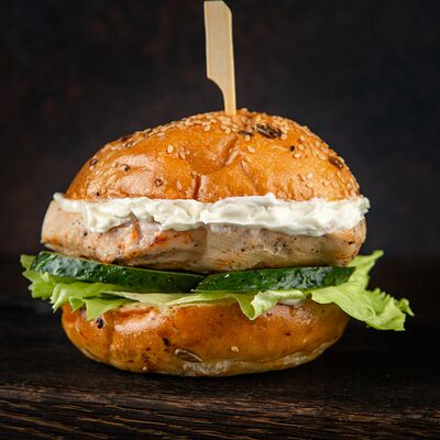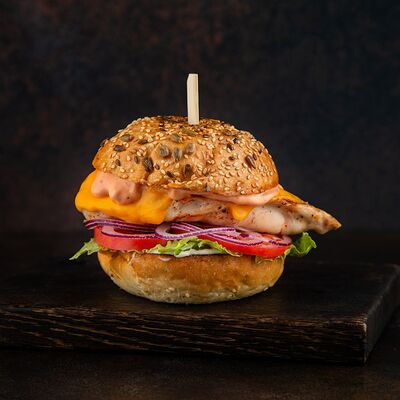 Куриное филе на гриле, хрустящий бекон, сыр чеддер, маринованный огурчик, помидор, красный лучок, салат айсберг, соус русский