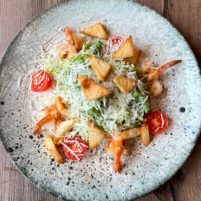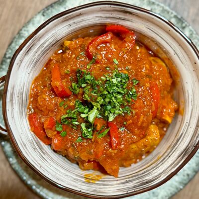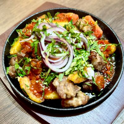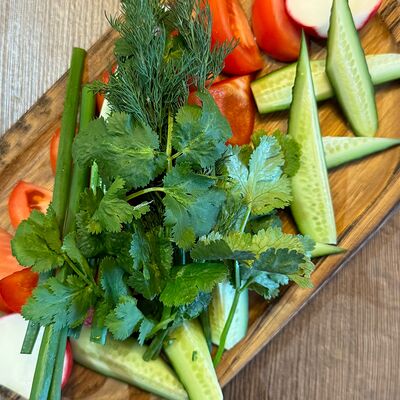 Помидоры, огурцы, листья салата, красный лук, грузинское масло со специями