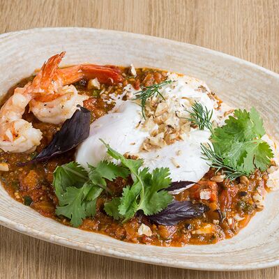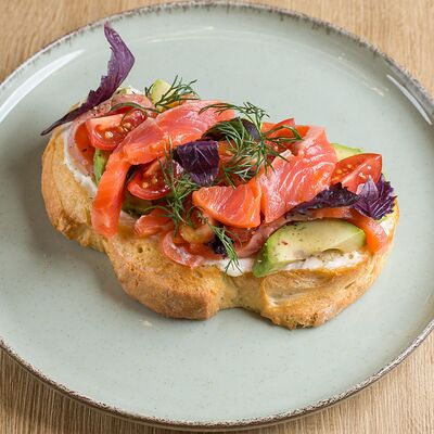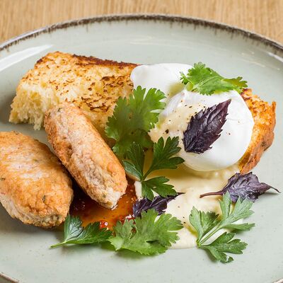 Бриошь (мука пшеничная высшего сорта, масло сливочное 82,5%, молоко, яйцо куриное, сахар, дрожжи, соль), крабкейки (крабовые палочки, куриное филе, яйцо куриное, крахмал картофельный, мука пшеничная высшего сорта, чёрный перец, эстрагон, чеснок сухой), яйцо пашот, сырный соус (сыр гауда, сыр чеддер, сыр пармезан, сливки, корица), соус свит Чили, томаты черри, зелень