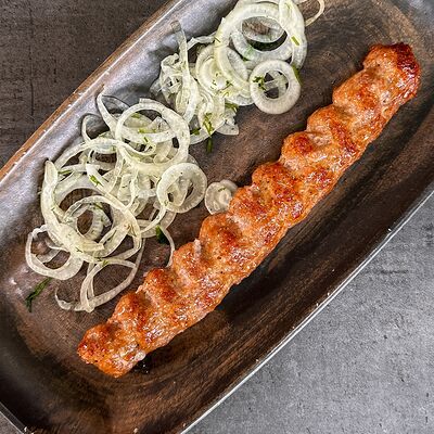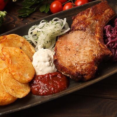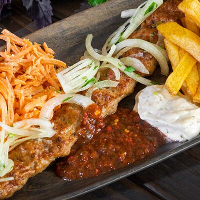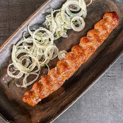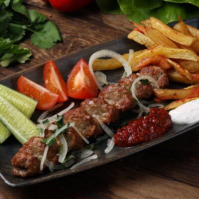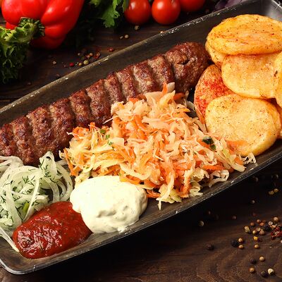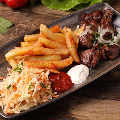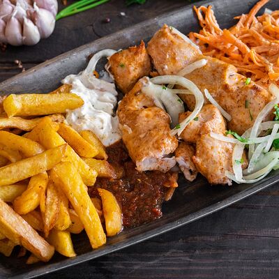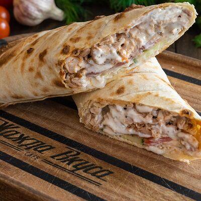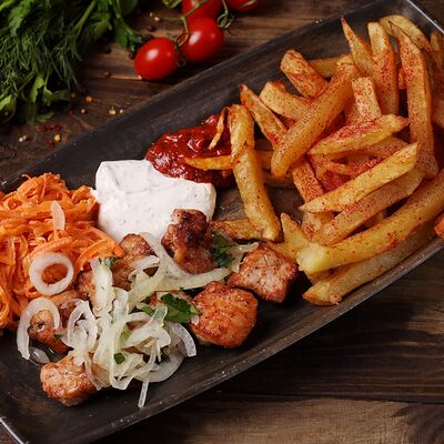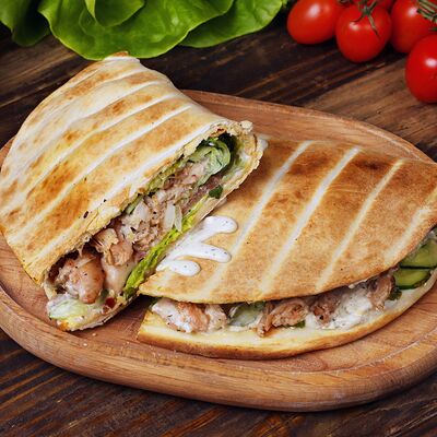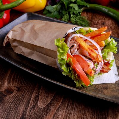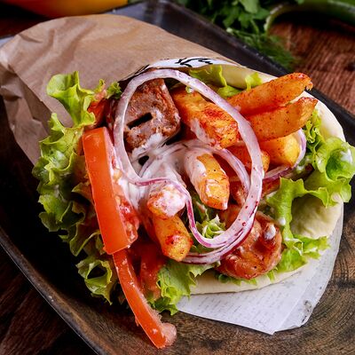 Лепешка, свинина, картофель фри, помидор, огурец, лист салата, лук, секретный соус